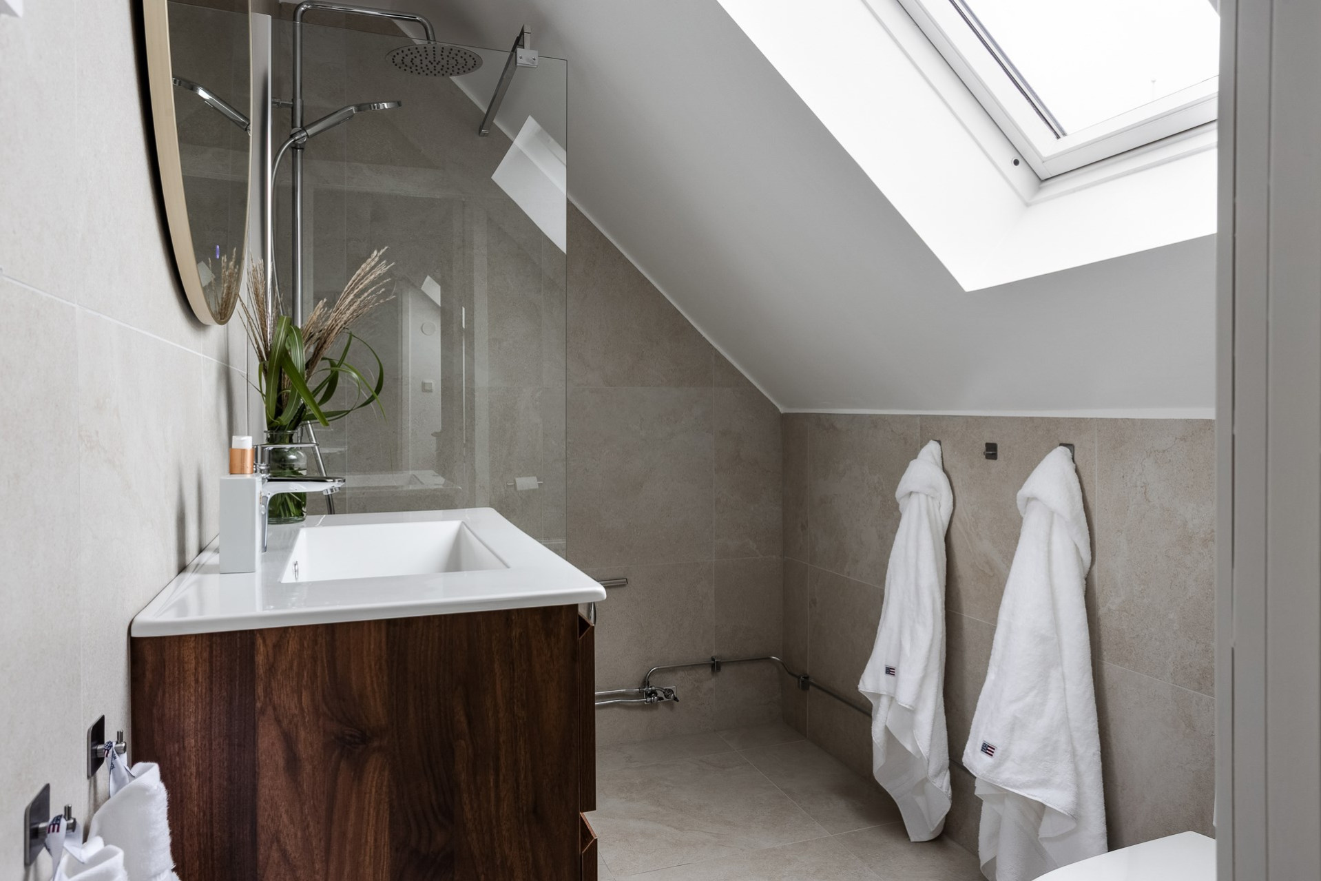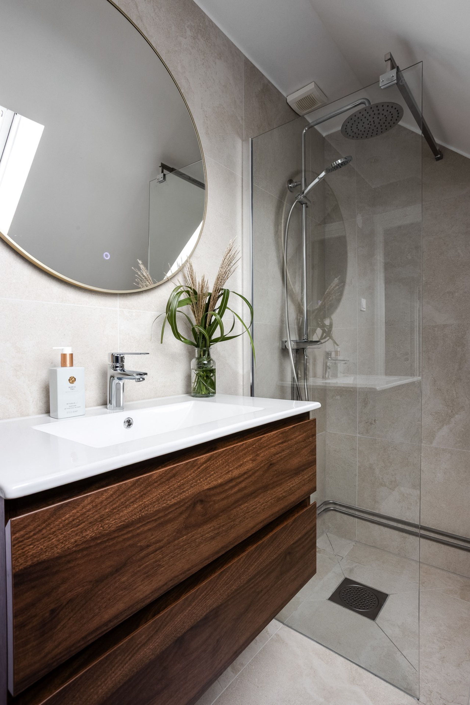 Otroligt snyggt renoverat badrum (2025) med toalett, kommod, spegel samt dusch med glsvägg.