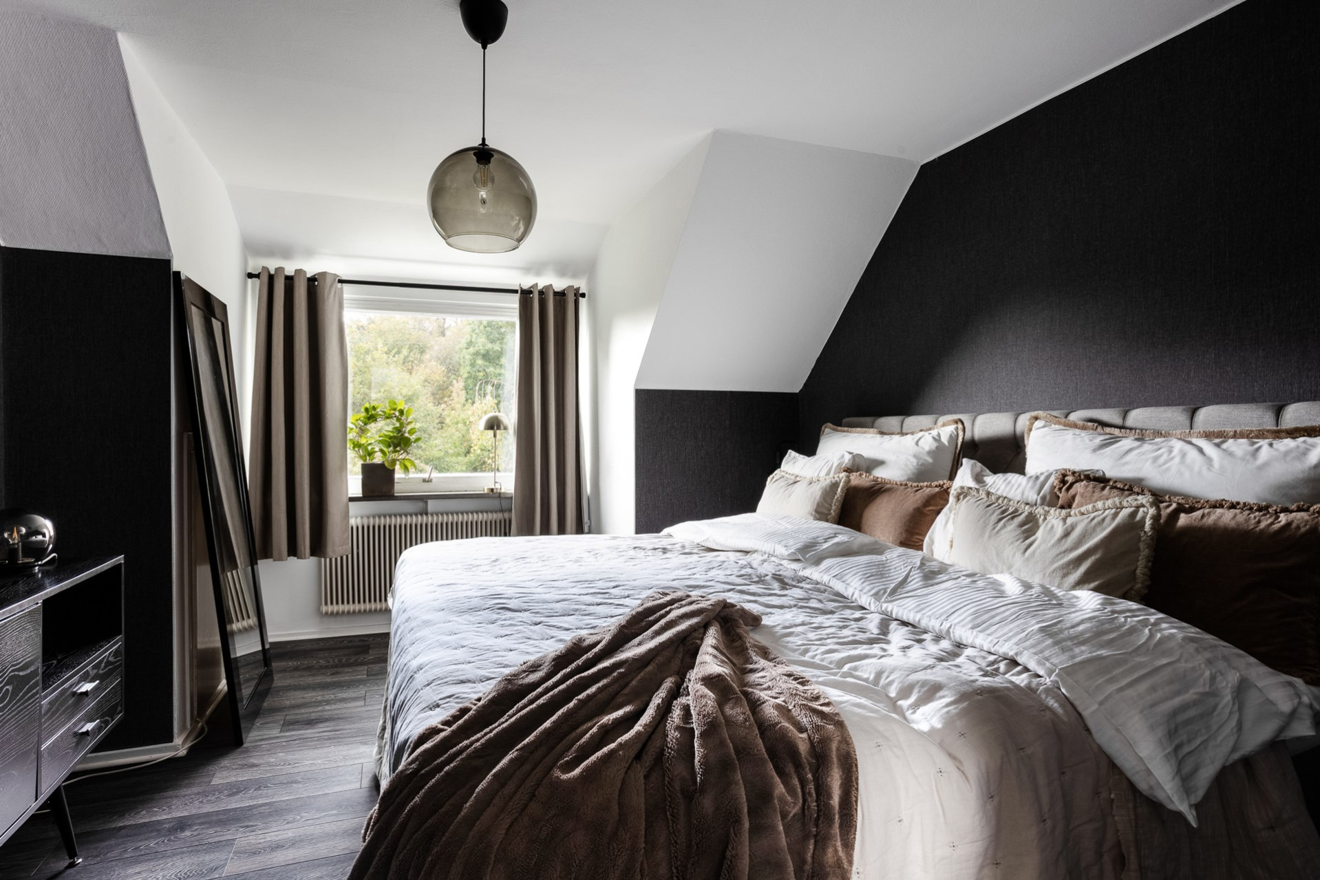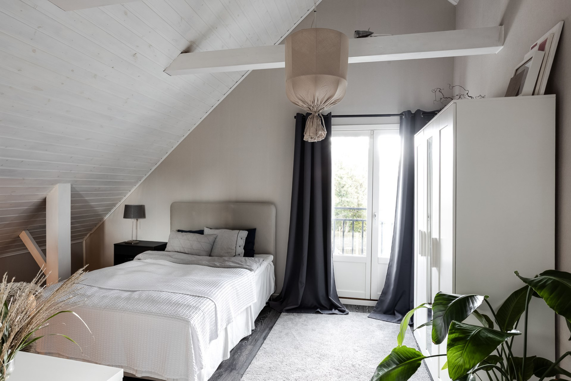 Det sista sovrummet, beläget två trappsteg ner, tillkom -96 när man byggde på en tidigare veranda. Ett magnifikt rum med fransk balkong, öppet till nock samt synliga bjälkar. Man har byggt upp en vägg för att göra en walk-in-closet men denna kan tas ner om man vill ha ett enda stort rum. Här är rejäla ytor!