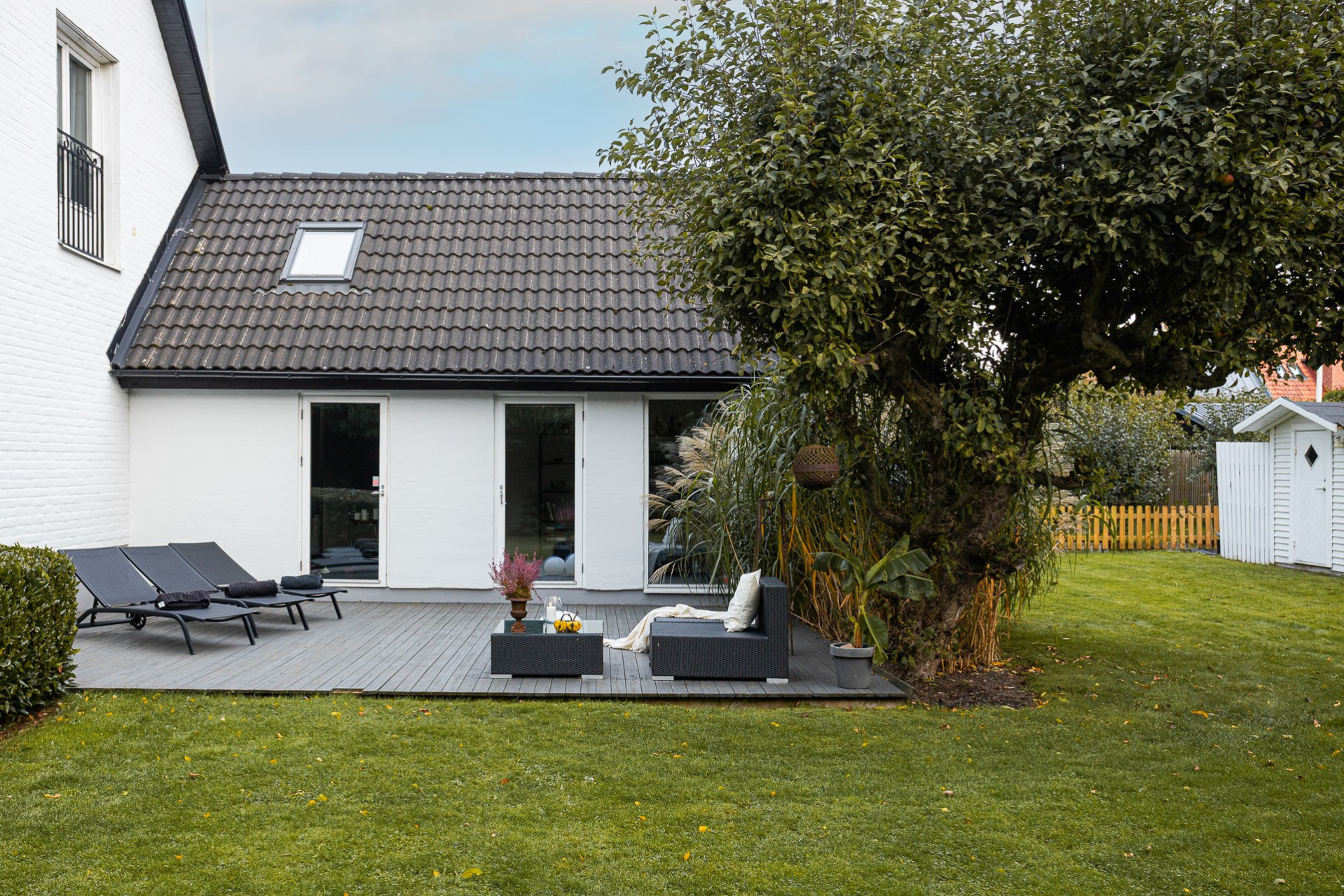 Några trappsteg ner finner vi utbyggnaden som tillkom 2003. Den harmoniserar väl med huset. Här är en rymlig hall med förvaring samt en riktigt mäktig känsla då det är öppet till nock. Ett sovrum med loft ovanpå samt utgångar till trädäcket. Denna avdelning är perfekt för tonårsbarn, gästrum eller hemmakontor/verksamhet. Klinkergolv.