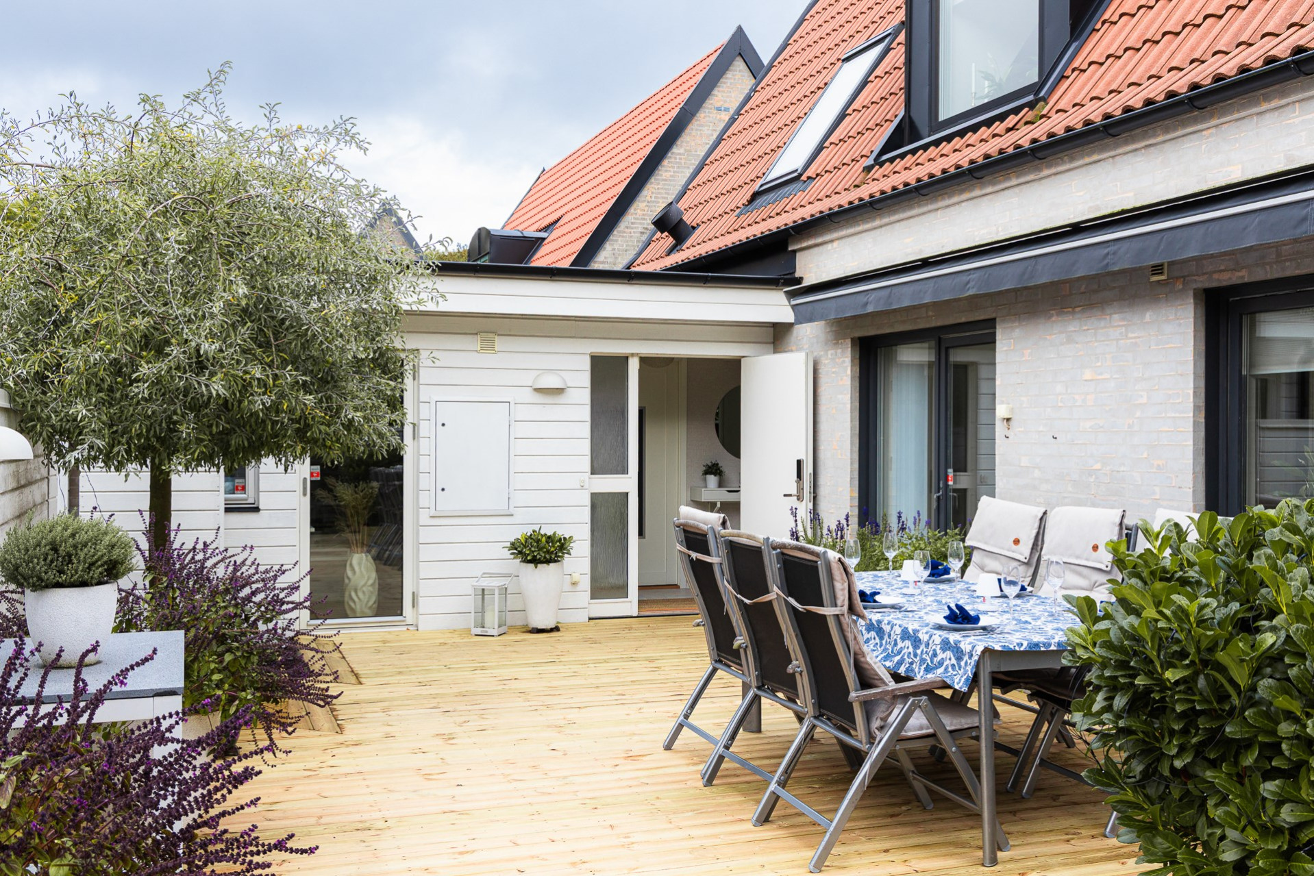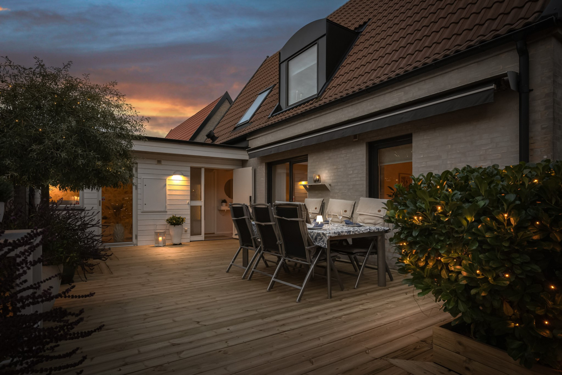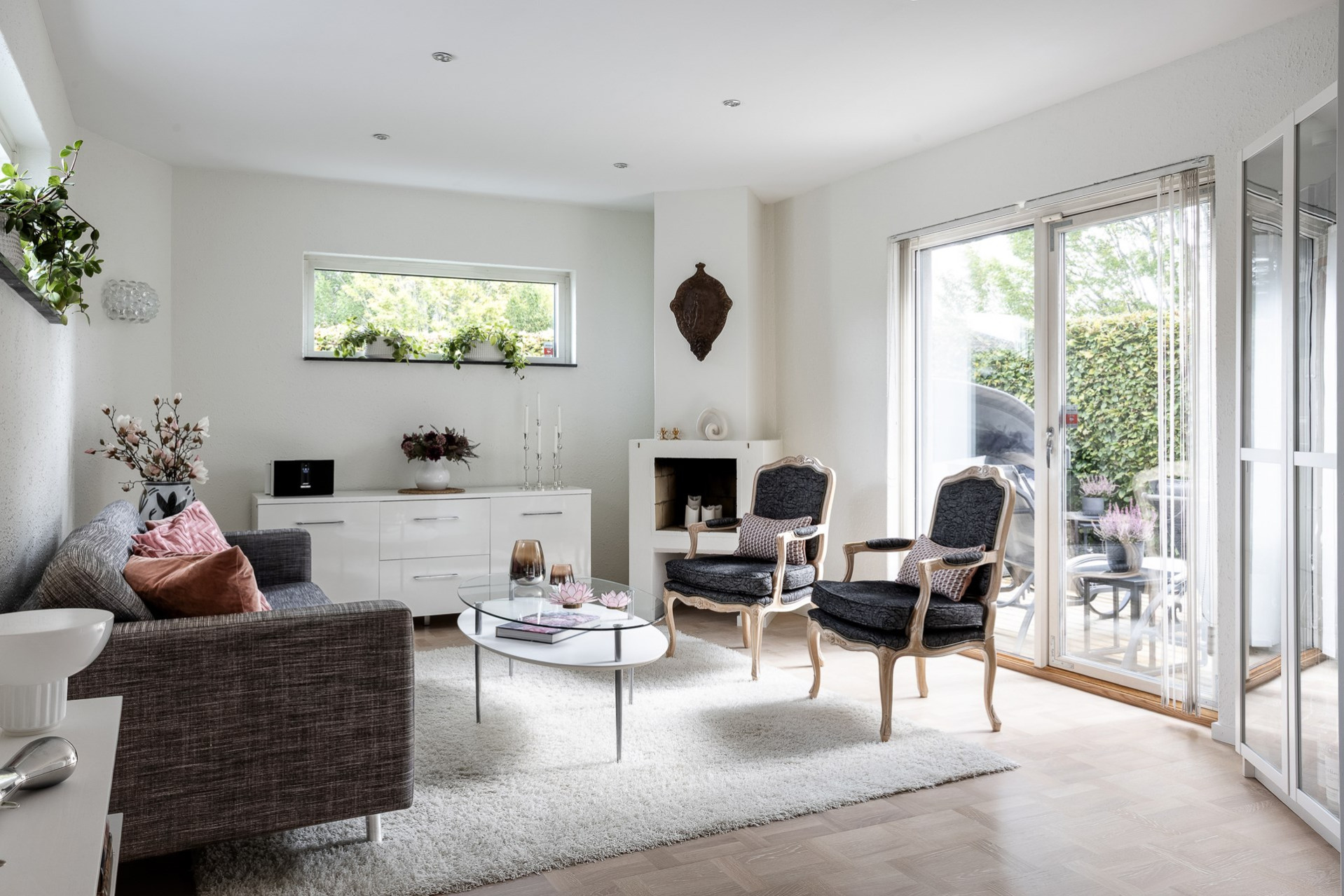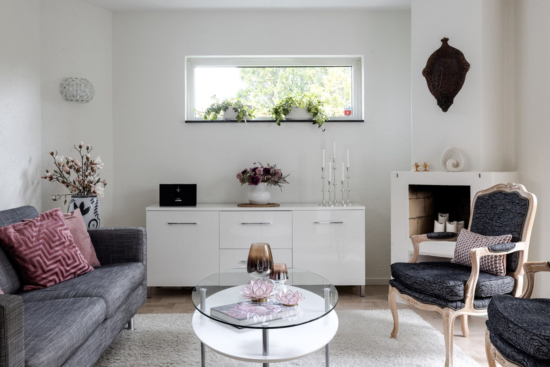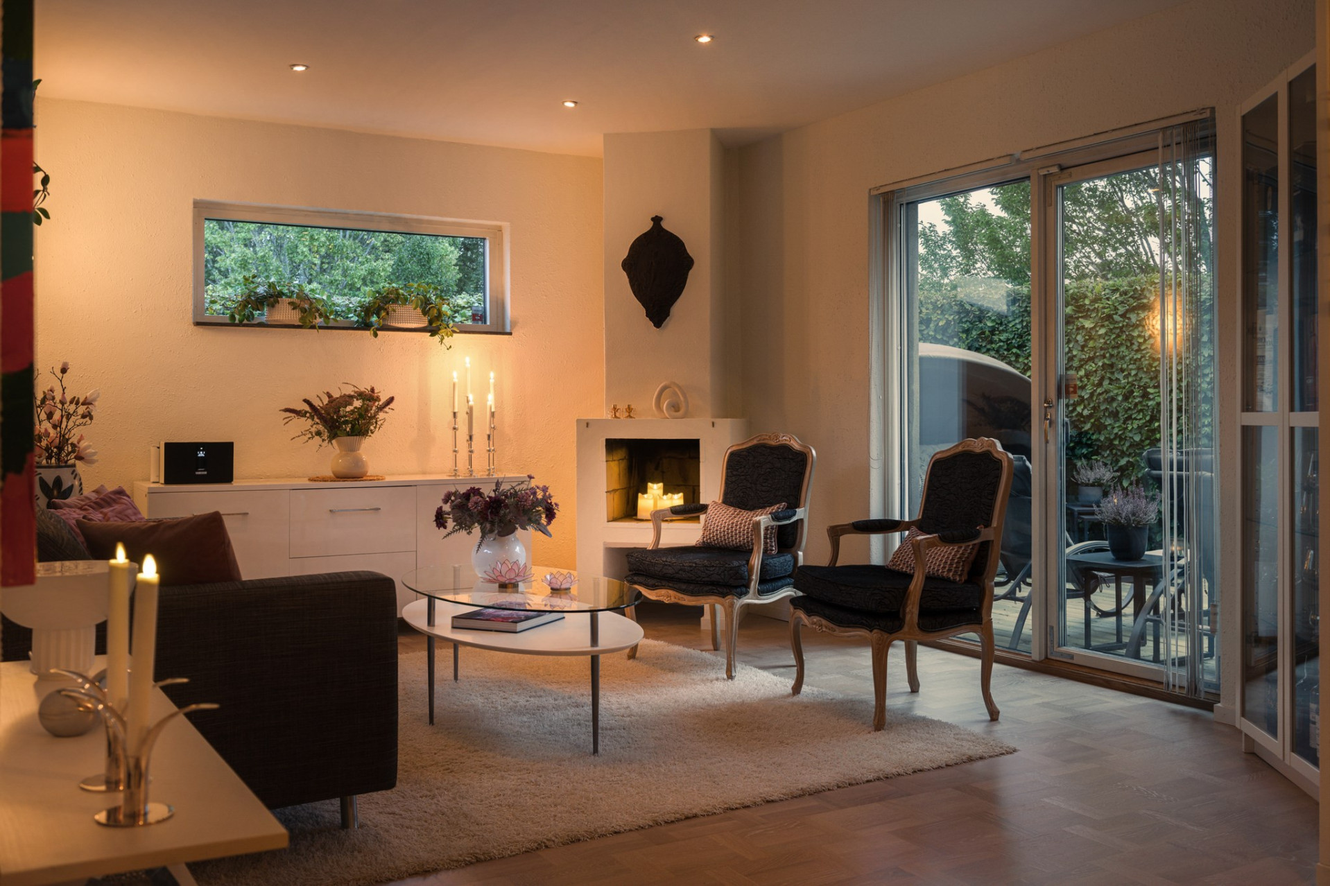 Tillbyggnaden som kom 2005 med vattenburen golvvärme är en otroligt charmig del av huset. Här slår man sig ner i lugn och ro efter middagen. Man tänder ljus i eldstaden (ej fungerande) och sätter på lite soft musik. En magisk plats med utgång till uteplatsen där morgonsolen kommer. Perfekt att gå ut den vägen för frukostintaget.