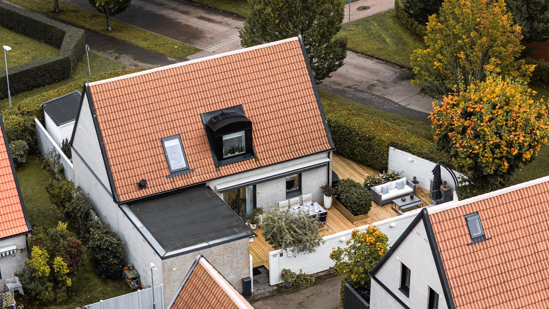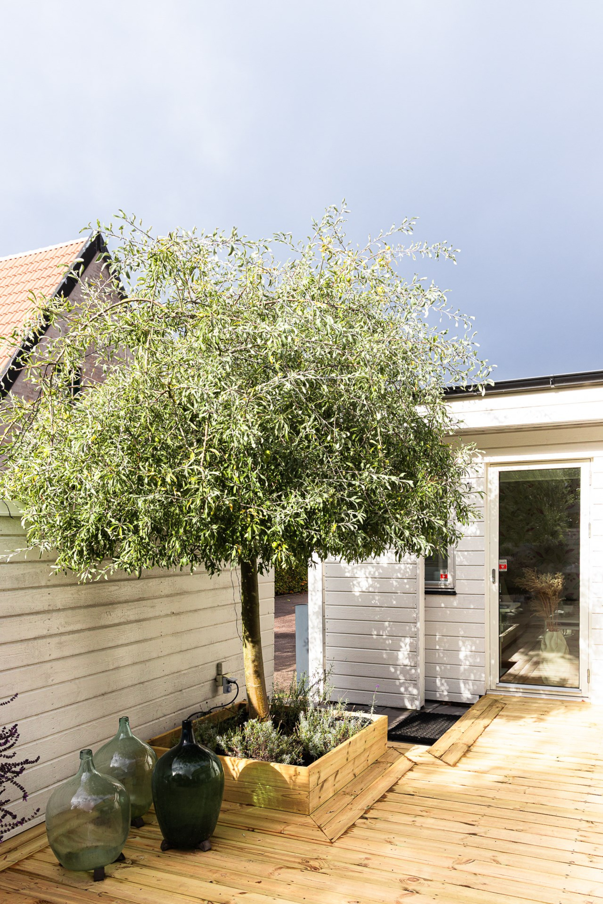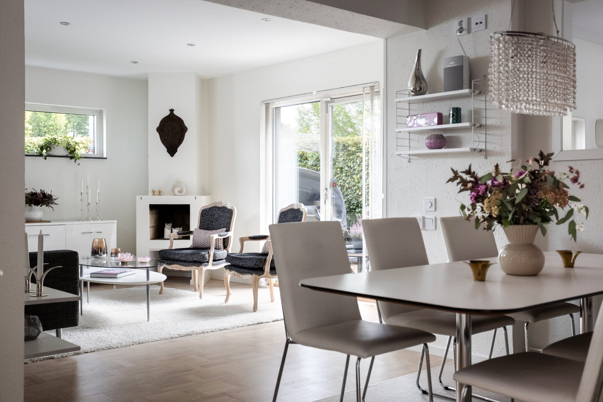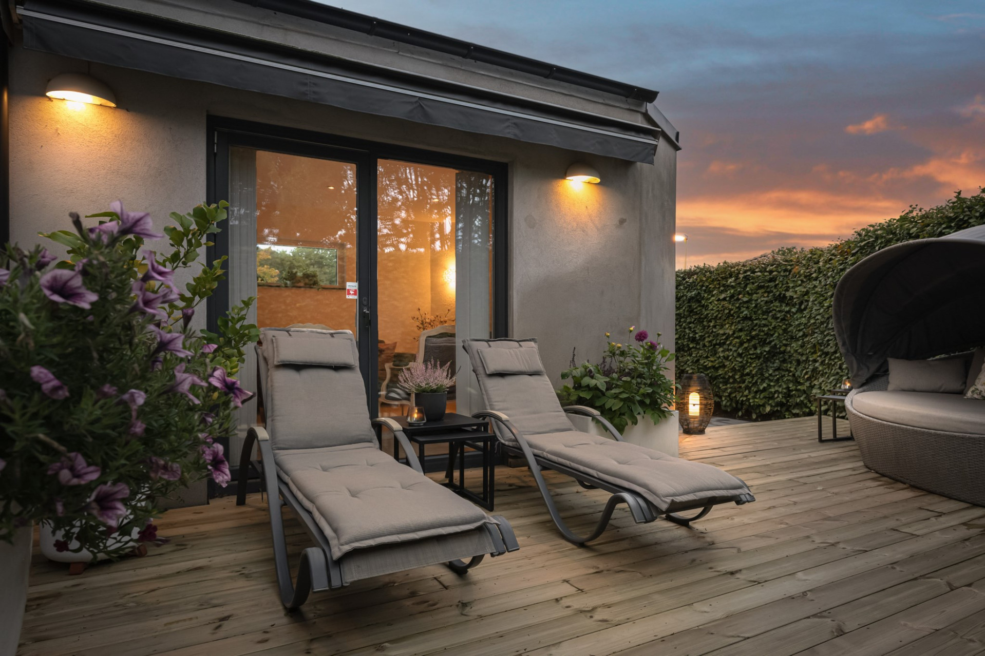 Tillbyggnaden som kom 2005 med vattenburen golvvärme är en otroligt charmig del av huset. Här slår man sig ner i lugn och ro efter middagen. Man tänder ljus i eldstaden (ej fungerande) och sätter på lite soft musik. En magisk plats med utgång till uteplatsen där morgonsolen kommer. Perfekt att gå ut den vägen för frukostintaget.