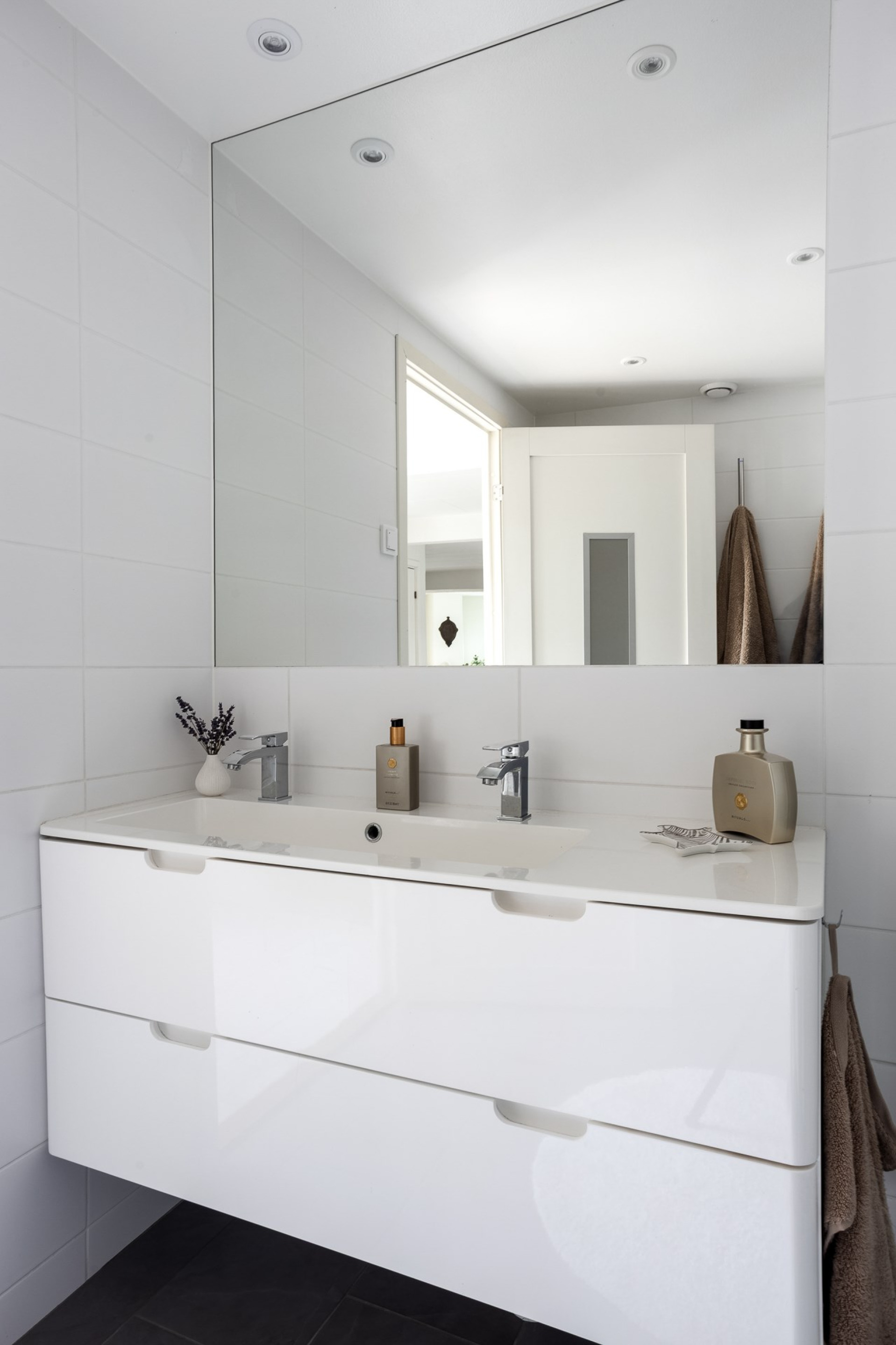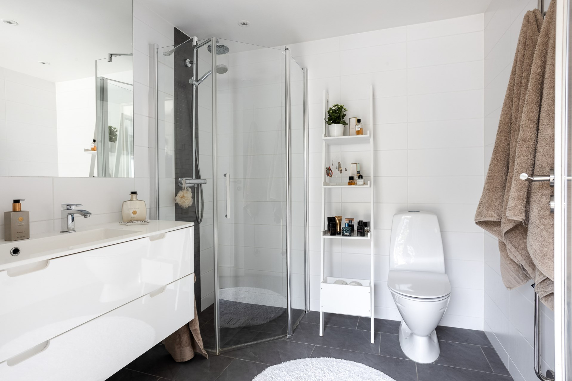 Snyggt renoverat (2013) badrum i grått och vitt 2013. INR dusch med glasväggar, lyxig dubbelkommod från HAFA, toalett, stor spegel samt handdukstork. Spotlights och golvvärme.