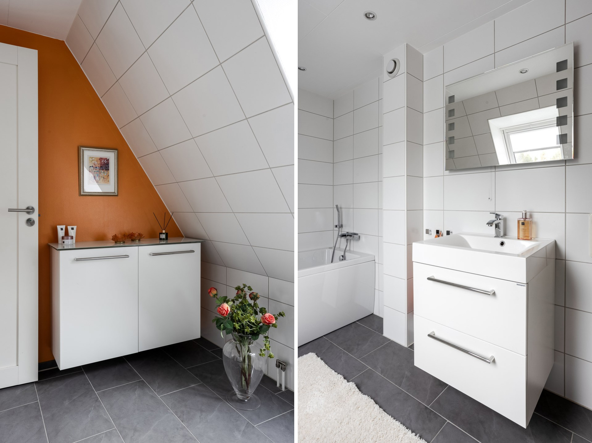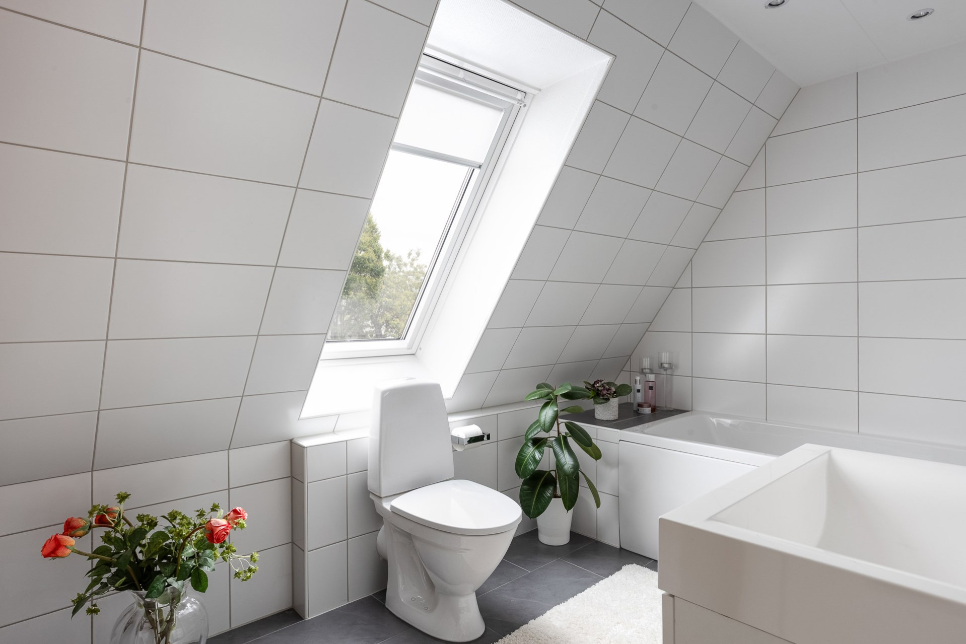 Även detta går i samma moderna ton som badrummet på entréplan. Grått klinkergolv tillsammans med vitt kakel, cleant och snyggt. Här finns ett lyxigt Svedbergs badkar och fin kommod, samt skåpsförvaring från Ballingslöv. Toalett, golvvärme och spotlights.