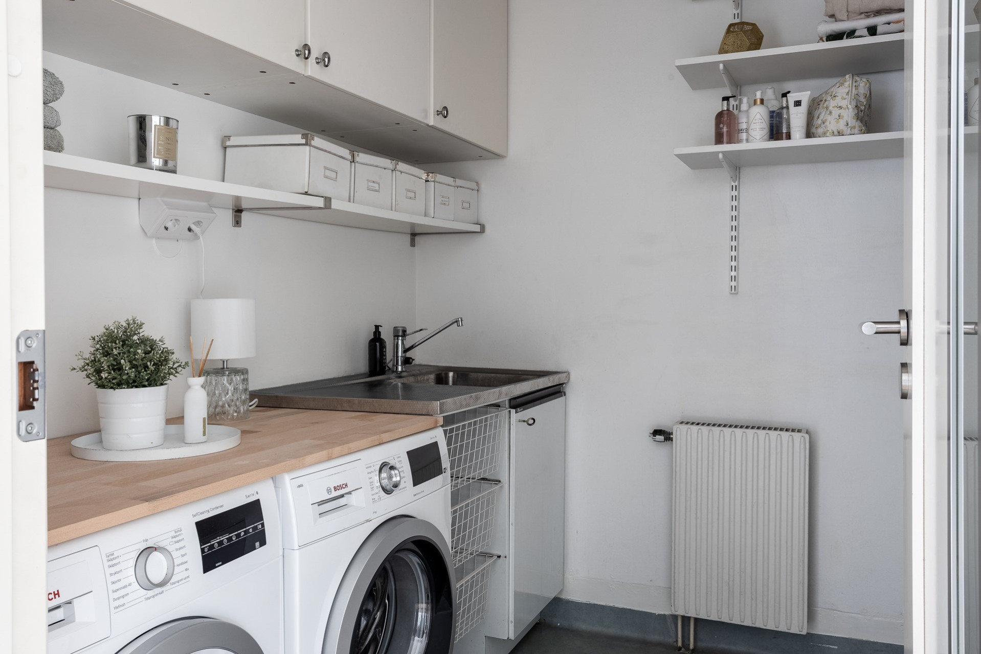 En bra tvättstuga med tvättmaskin, torktumlare, arbetsbänk med vask samt gott om förvaring.