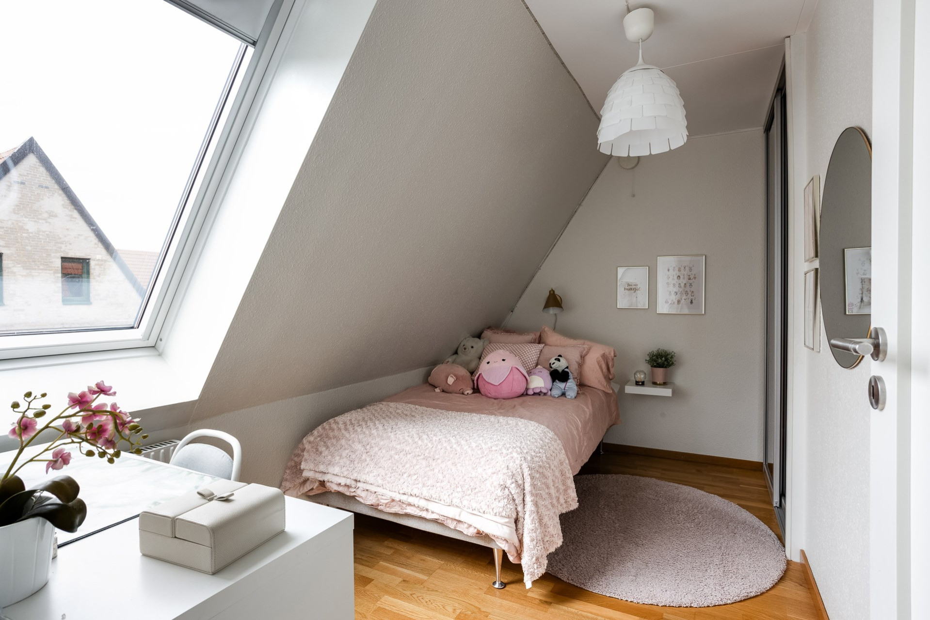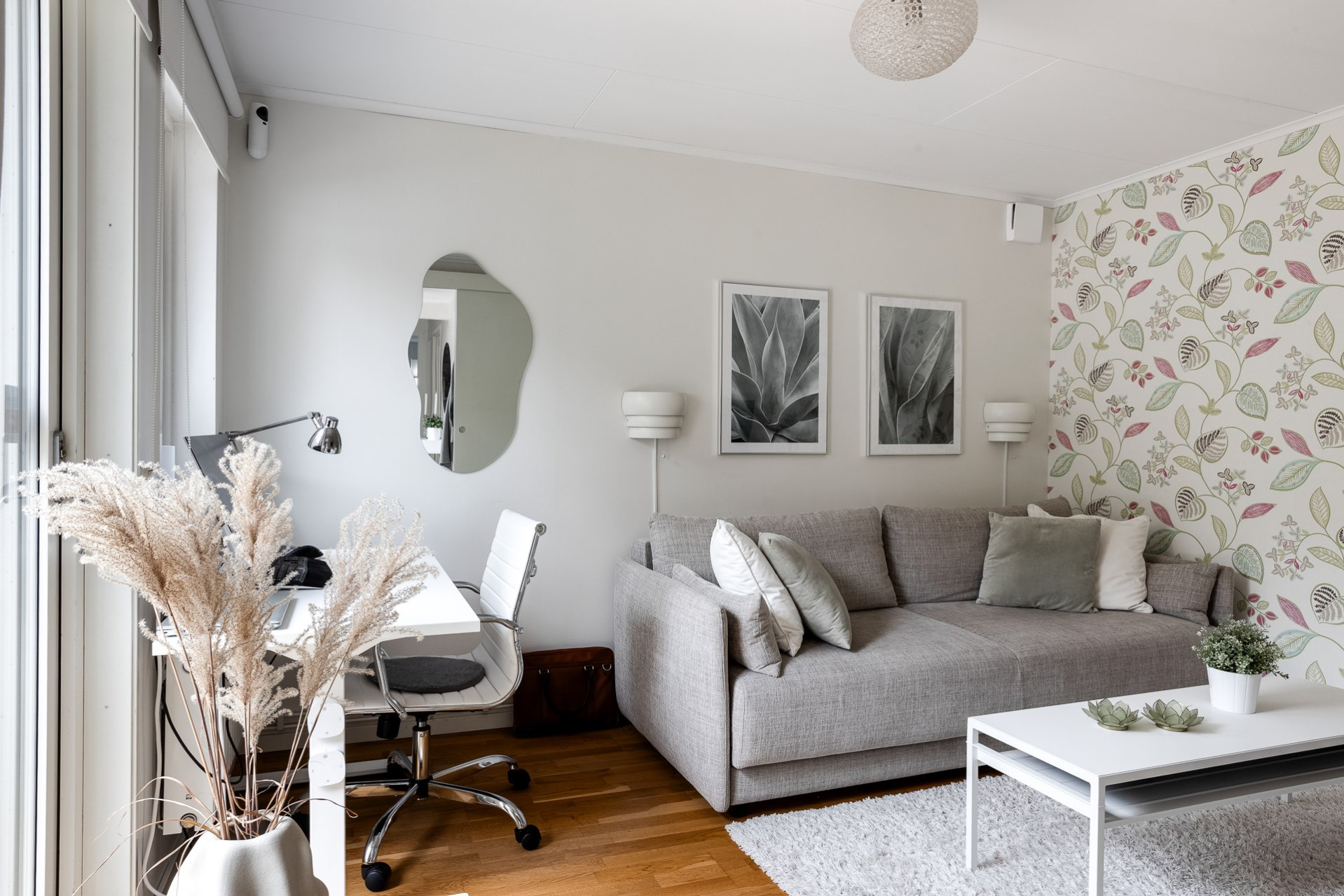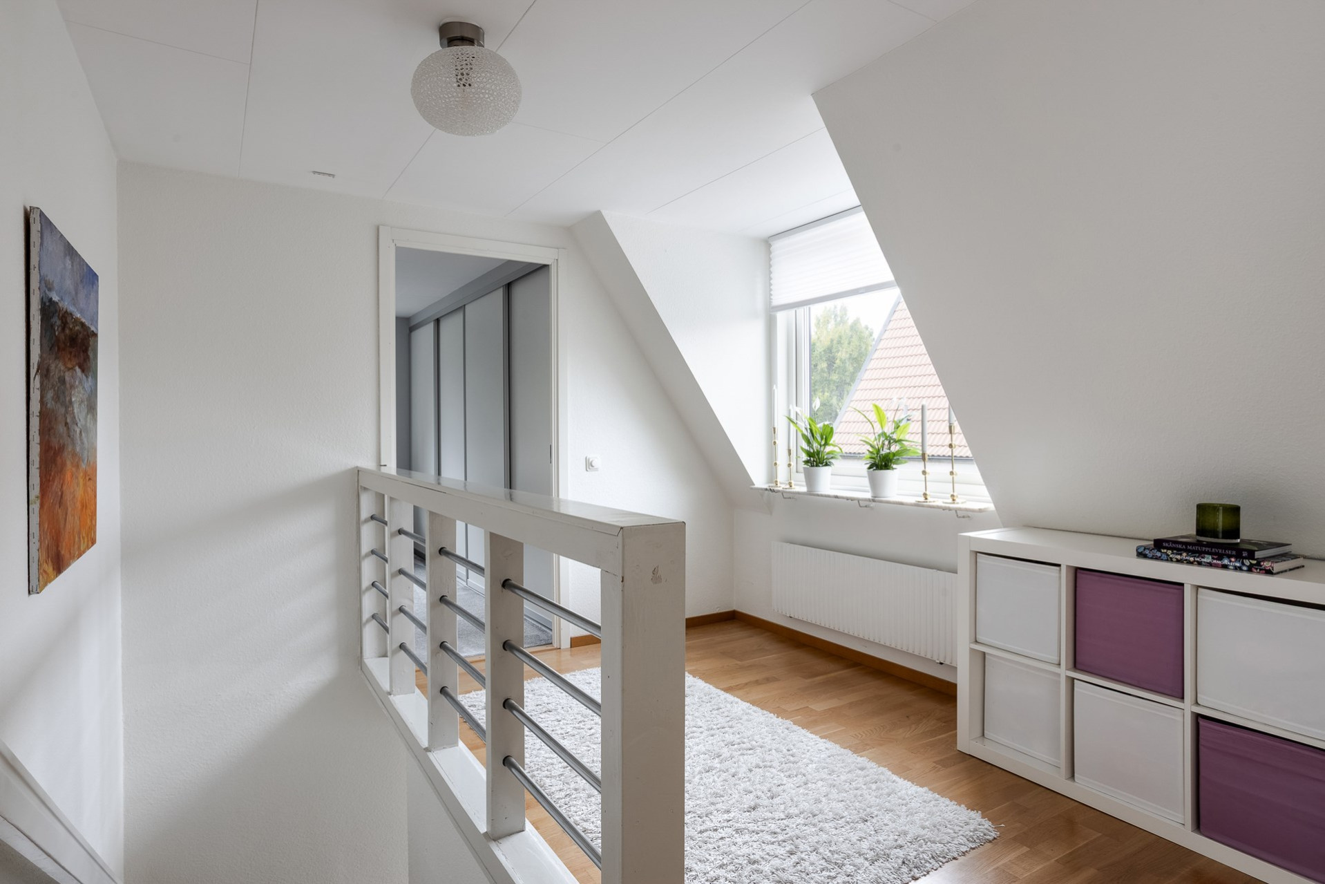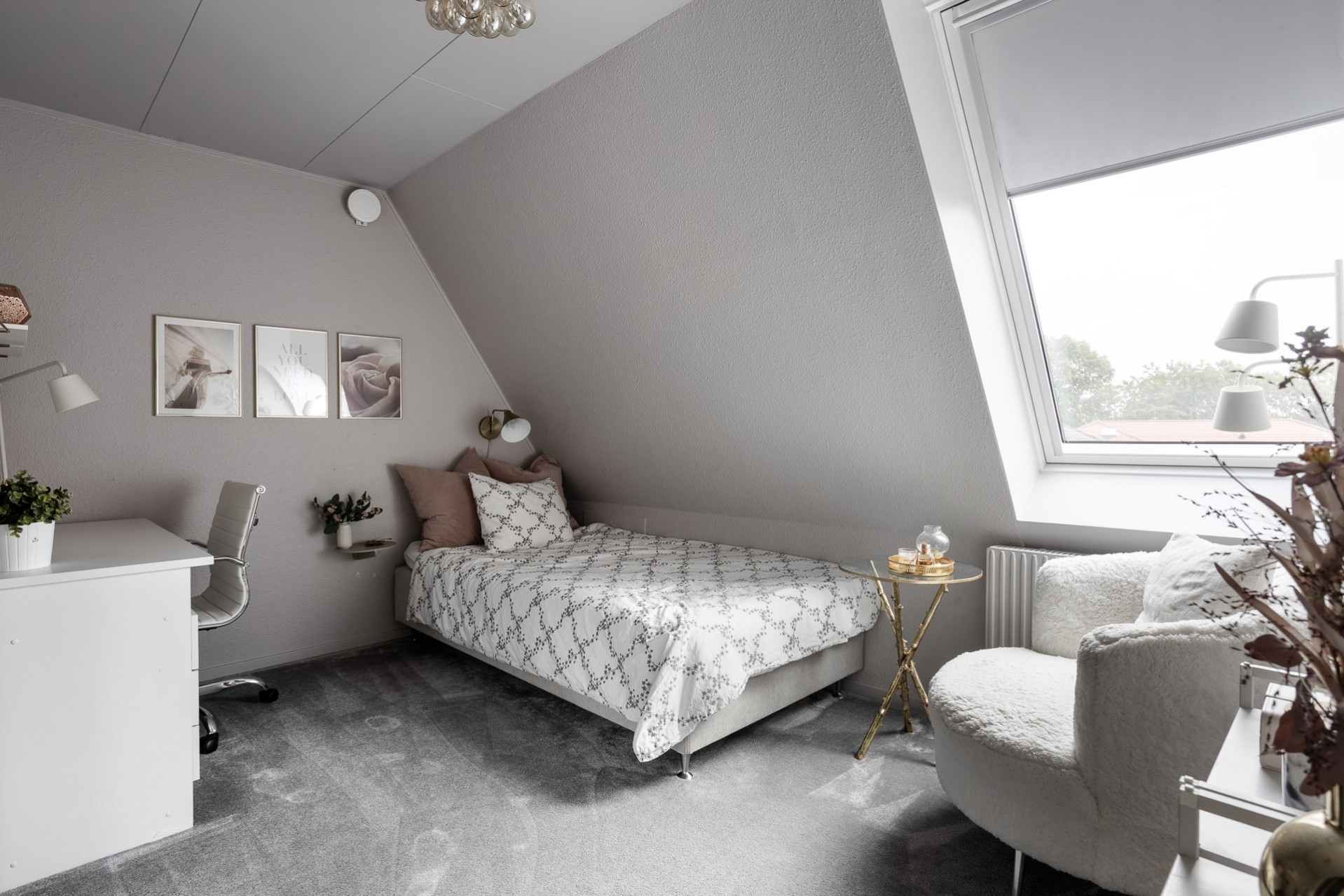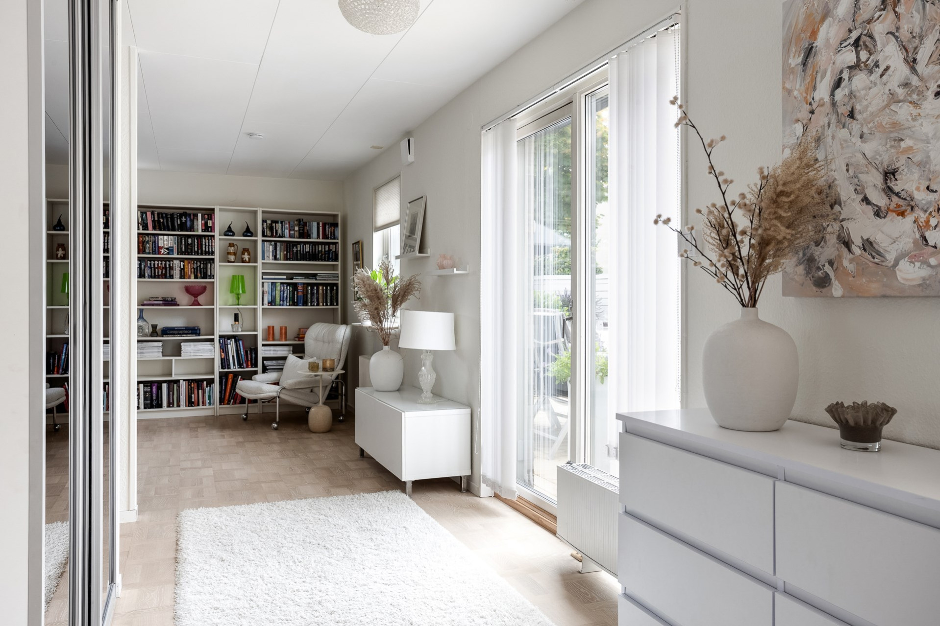Här uppe finner vi en plats där man kan placera två mysiga fåtöljer eller sätta ett skrivbord för hemmakontor. Parkettgolv.