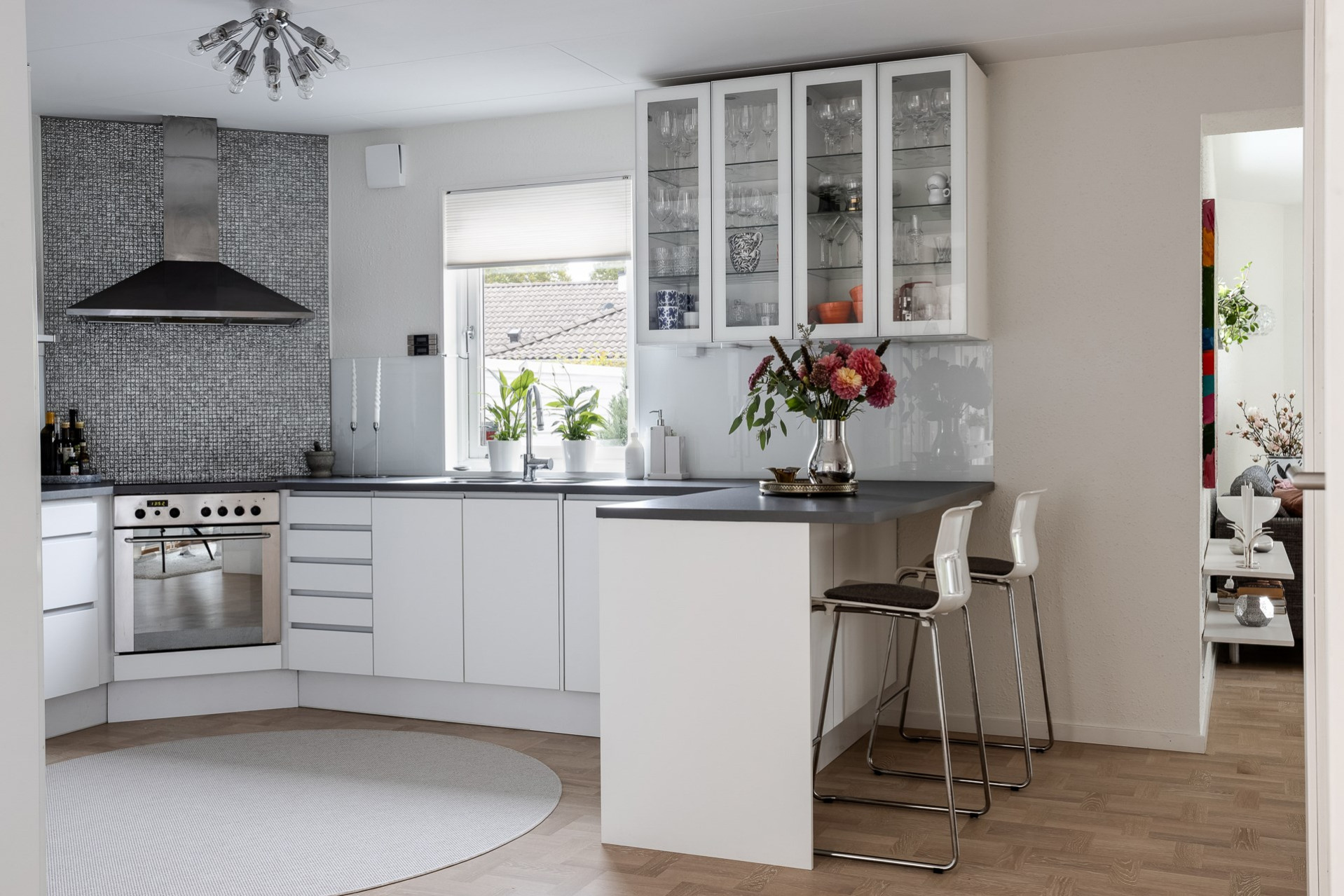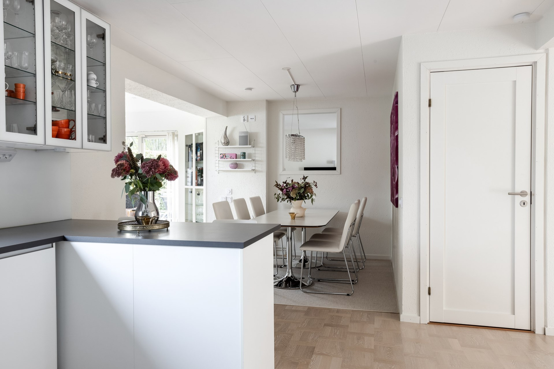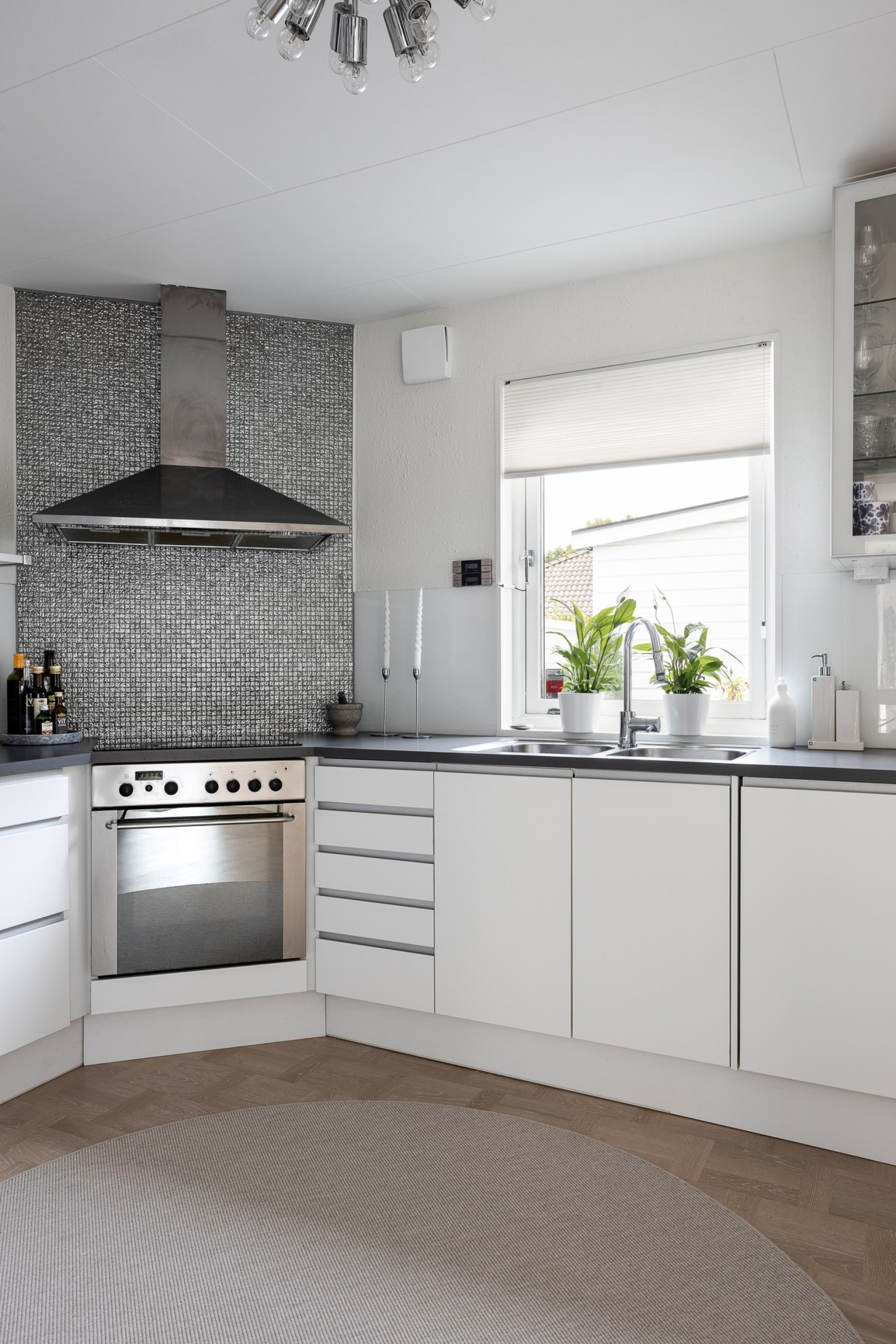 Riktigt stort och härligt kök med rejäl arbetsbänk, bardel samt gott om förvaring. Vit skåpsluckor, grå laminatbänkskiva samt glasskiva som stänkskydd. Komplett maskinpark med hel kyl och frys, diskmaskin, ugn, häll, fläkt och micro. Härlig kontakt med matplatsen som rymmer bord för 8-10 personer. I kök, matplats, lounge och vardagsrum ligger ett snyggt ljusbetsat golv, "holländsk parkett" från Kährs.