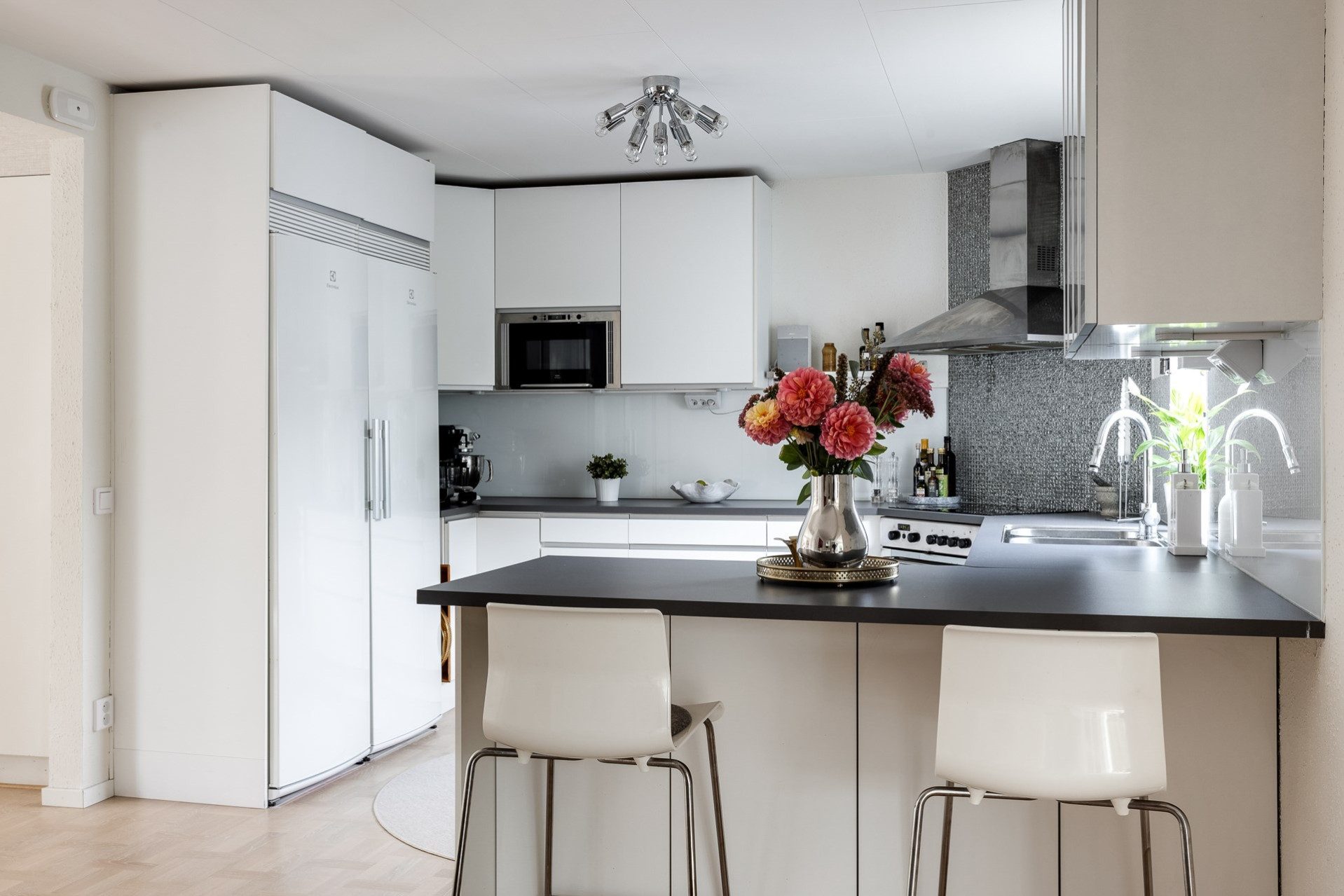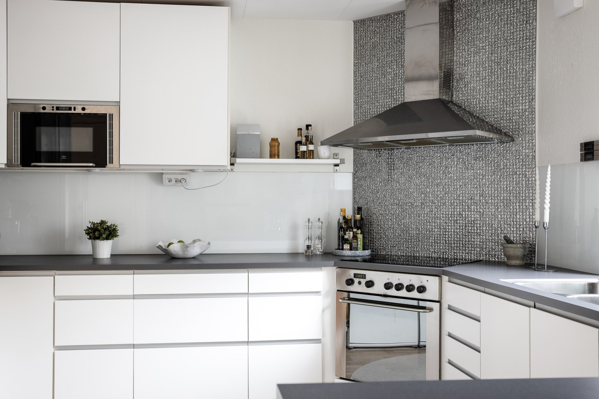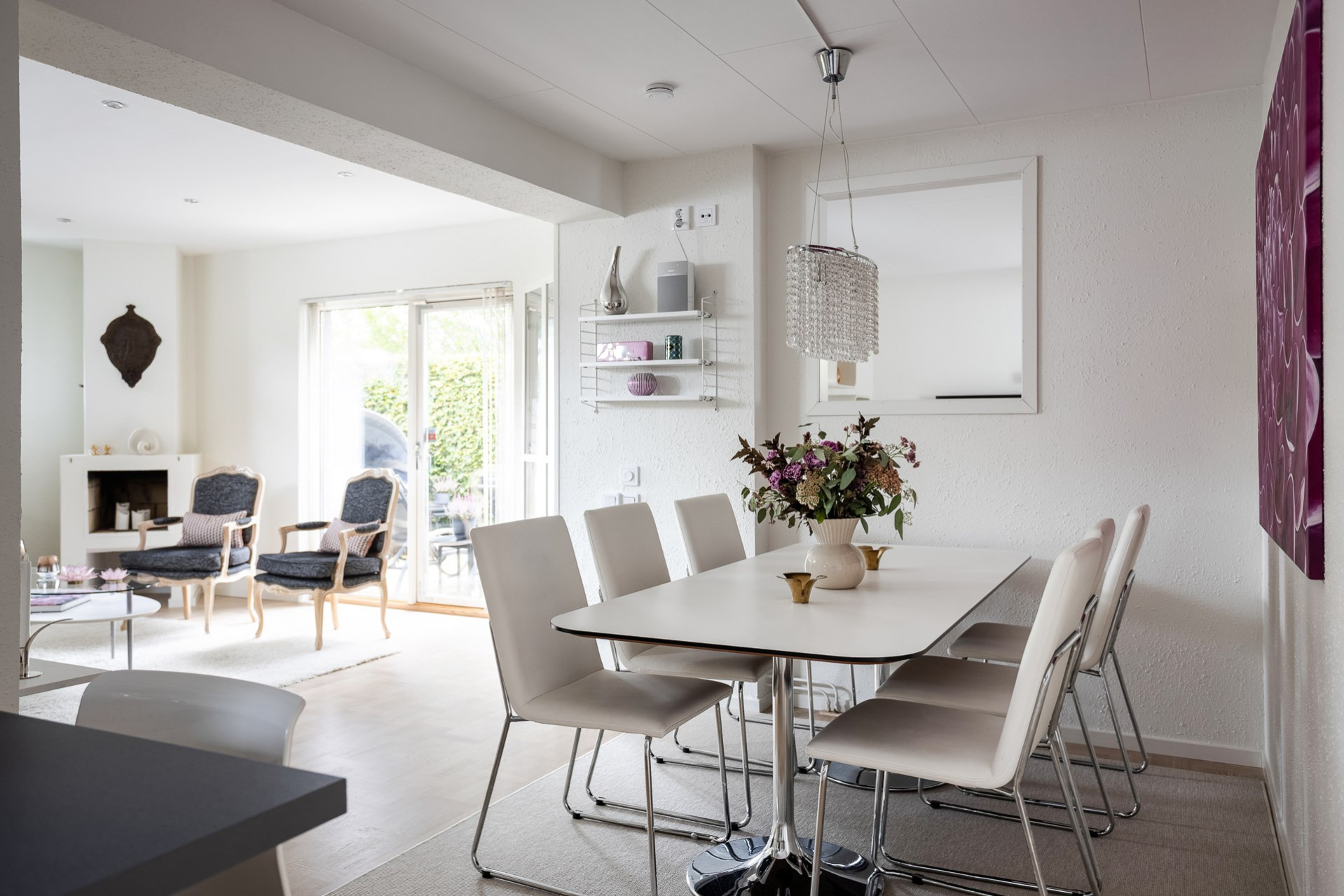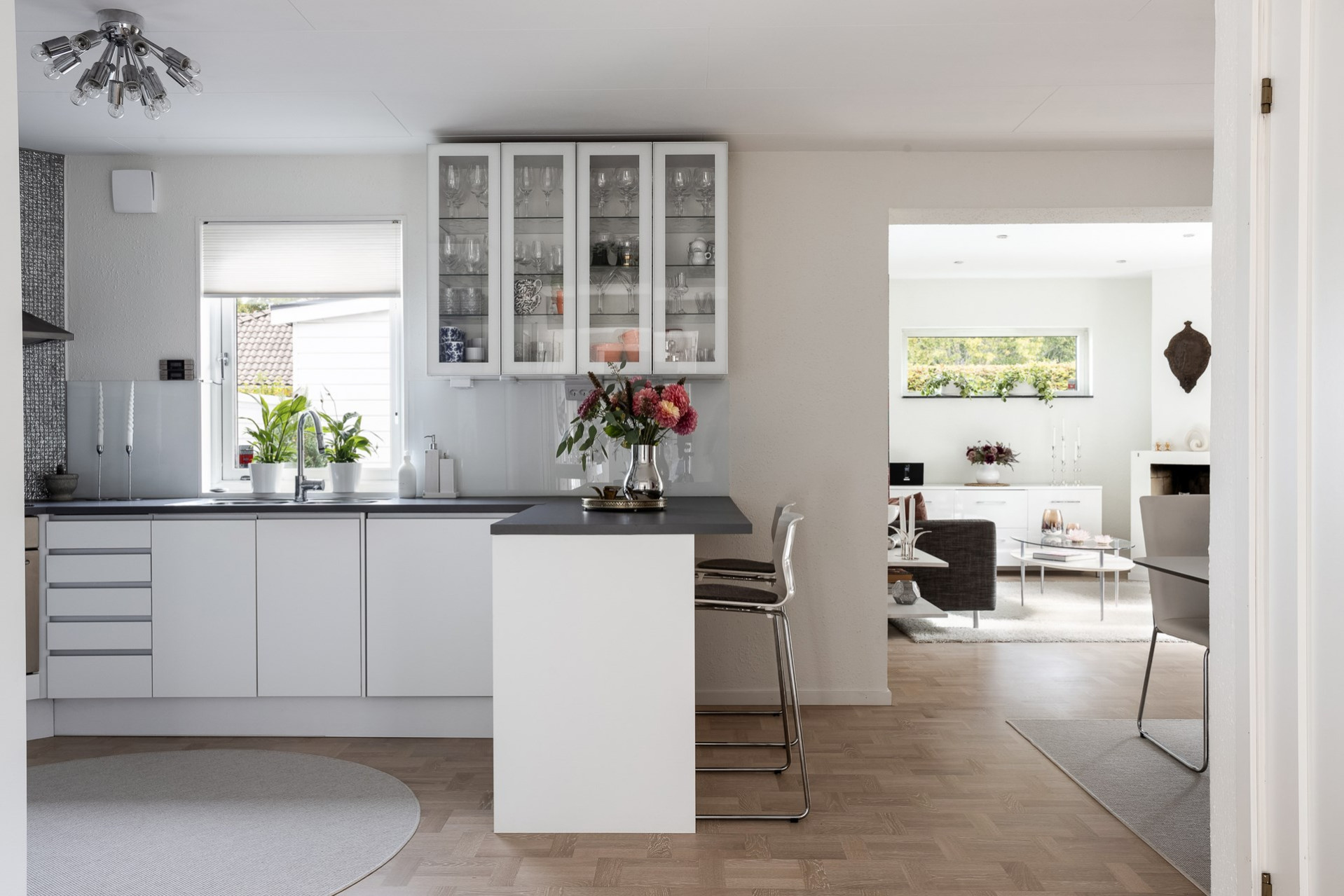 Riktigt stort och härligt kök med rejäl arbetsbänk, bardel samt gott om förvaring. Vit skåpsluckor, grå laminatbänkskiva samt glasskiva som stänkskydd. Komplett maskinpark med hel kyl och frys, diskmaskin, ugn, häll, fläkt och micro. Härlig kontakt med matplatsen som rymmer bord för 8-10 personer. I kök, matplats, lounge och vardagsrum ligger ett snyggt ljusbetsat golv, "holländsk parkett" från Kährs.