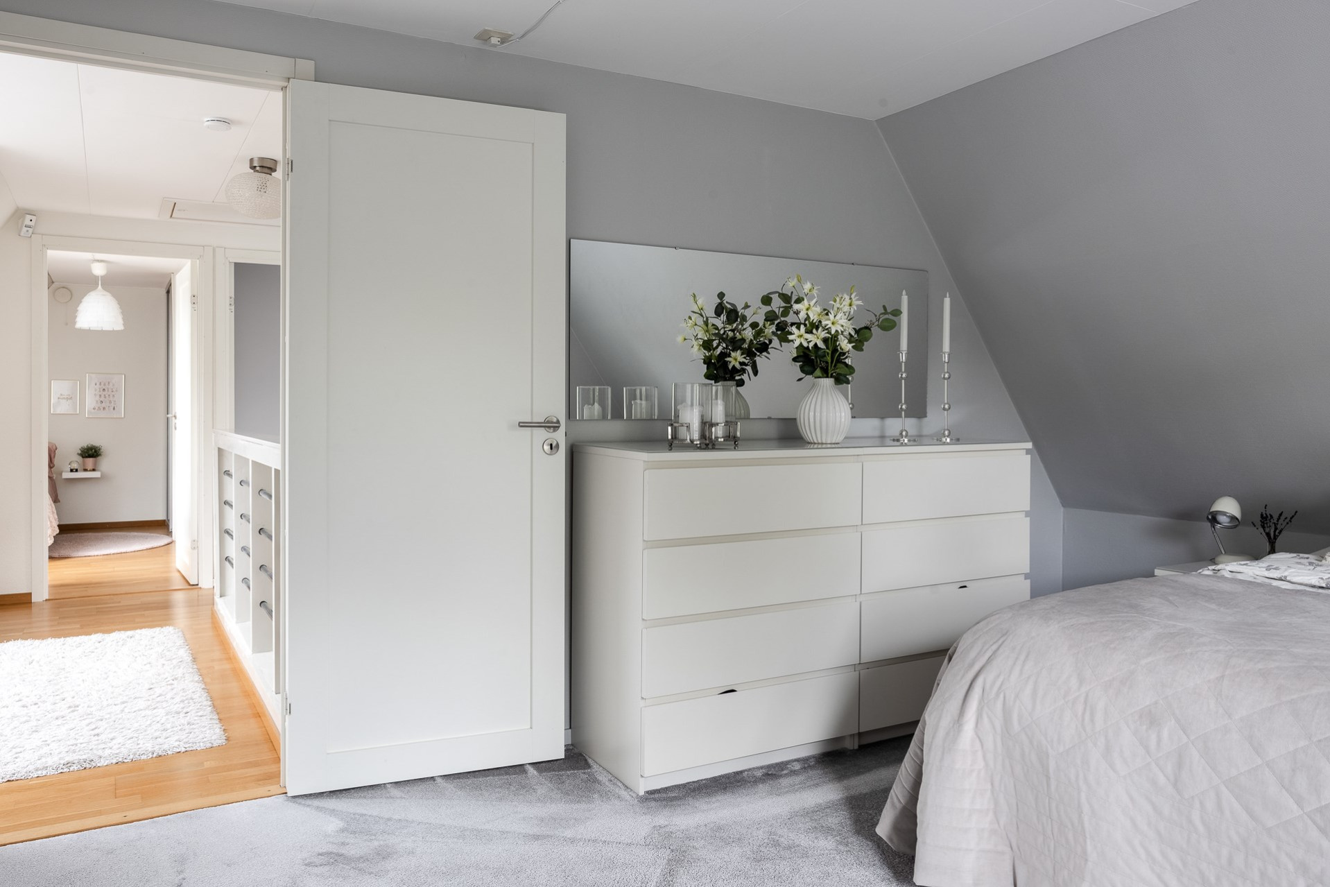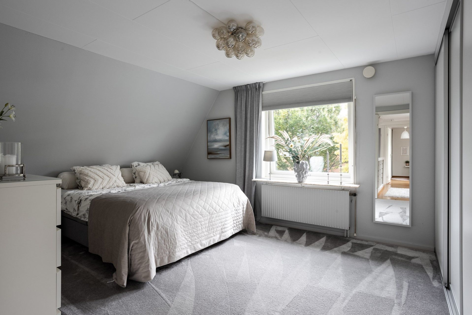 Stort härligt sovrum med parkettgolv samt väldigt god förvaring via skjutdörrsgarderober. Dubbelsäng, extra möblemang, här ryms det man behöver.