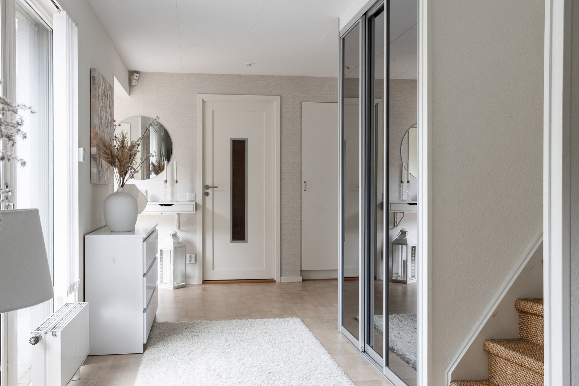 Nyrenoverad entré med ljust klinkergolv som samspelar väl med den ljusa parketten som ligger på nedanvåningen. Plats för avhängning och gott om garderober längre in. Hallen och entrén är navet på nedanvåningen och härifrån nås egentligen de flesta rum och ytor. Utgång i hallen till uteplatsen. Extra förvaring under trappan.