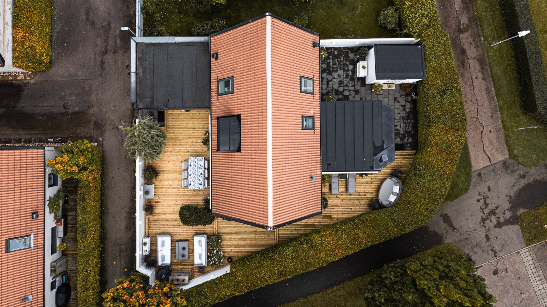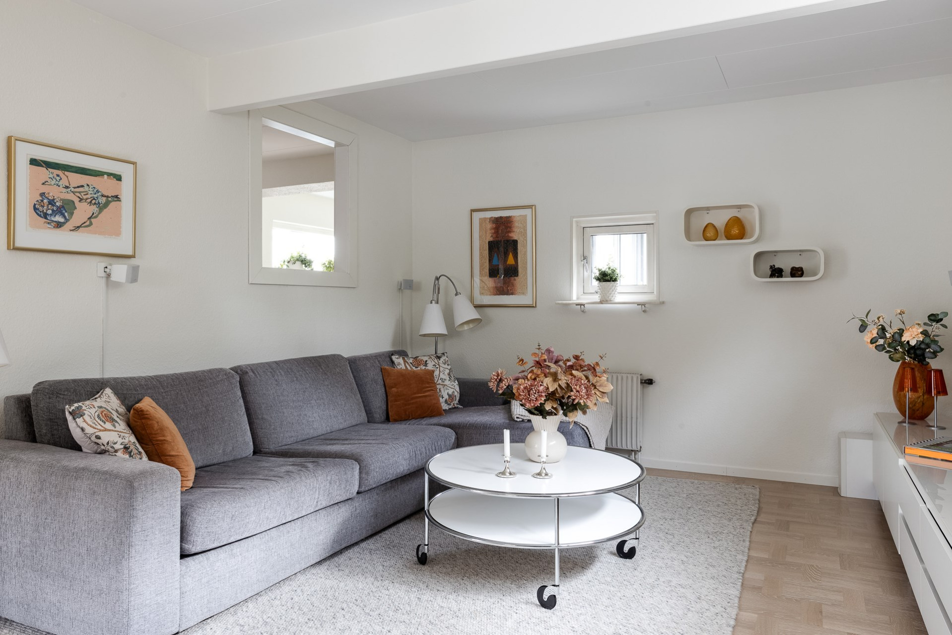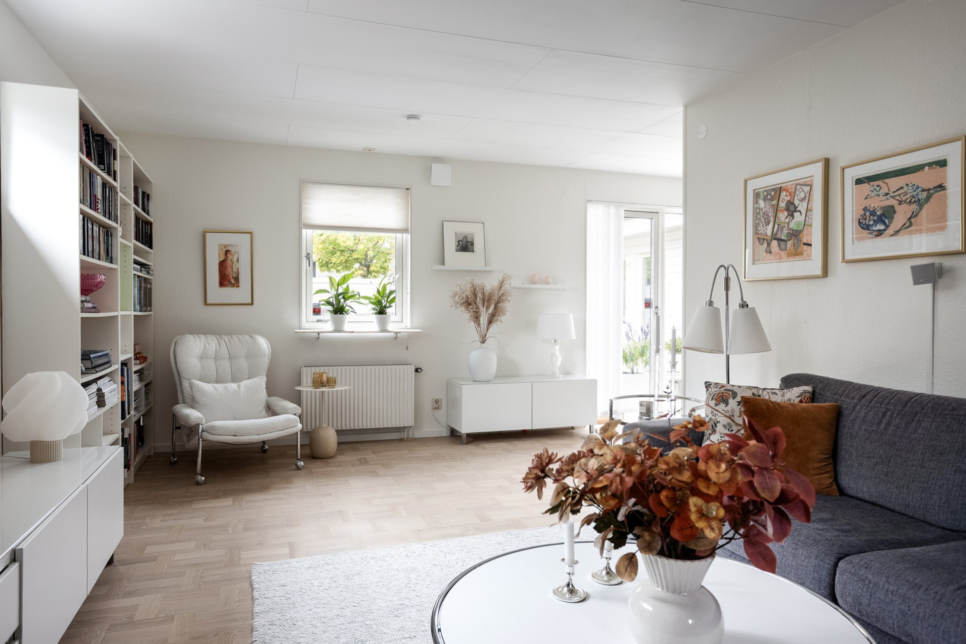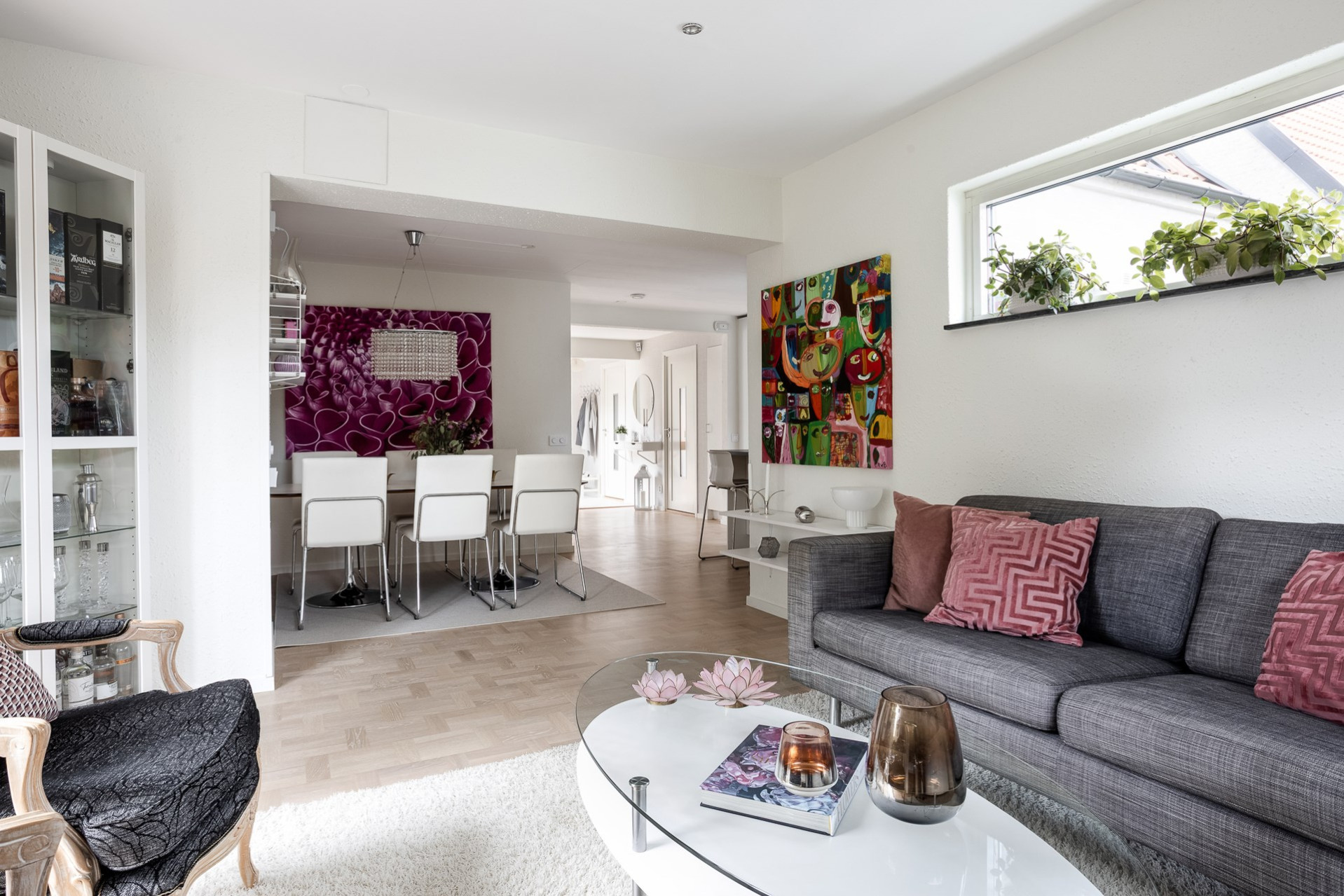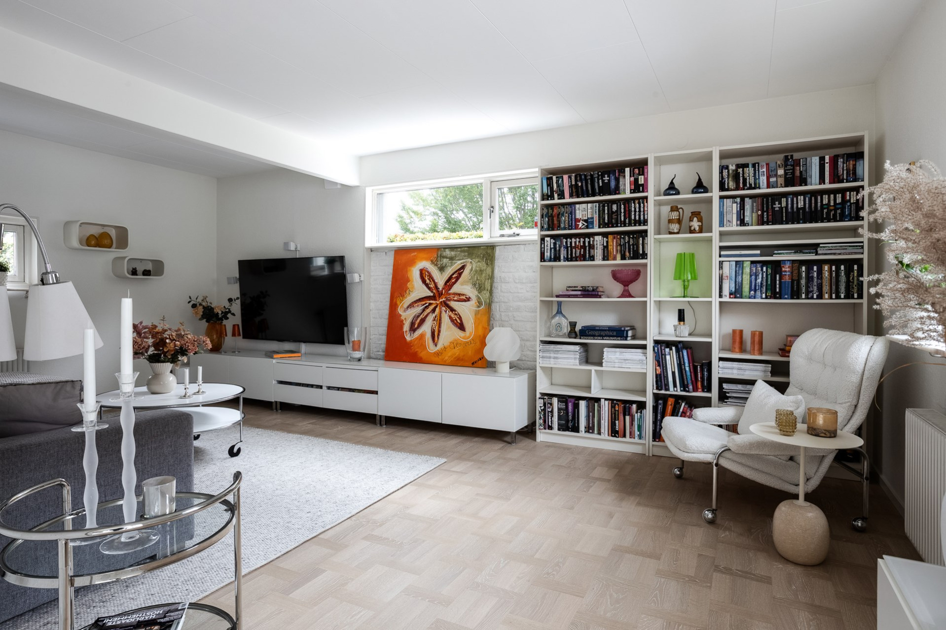 I andra änden finns ytterligare en rejäl sällskapsdel, vardagsrummet. Här kör man naturligt med stor soffgrupp och tv-häng. Samma läckra golv. Denna del kan avgränsas om man vill skapa ytterligare sovrum.