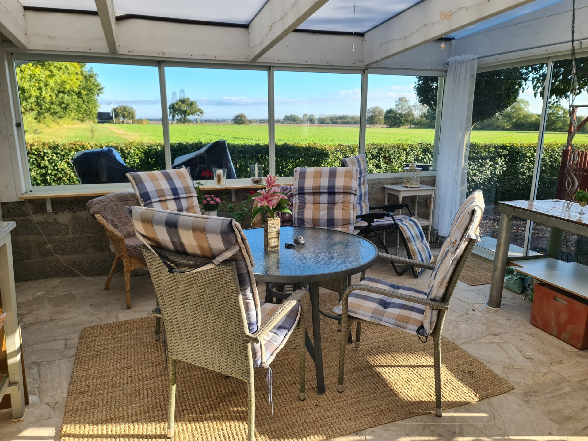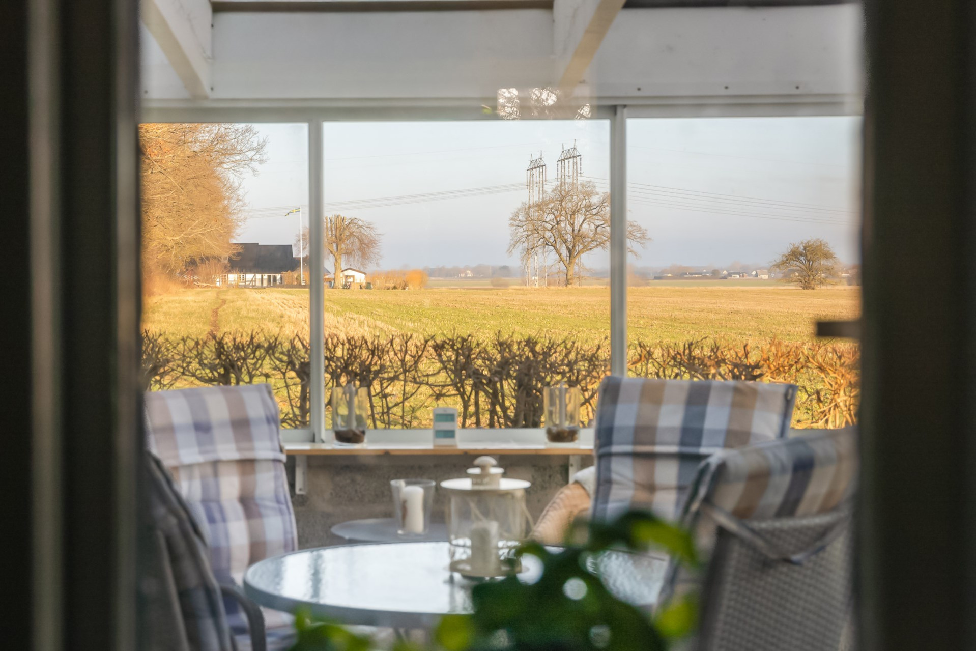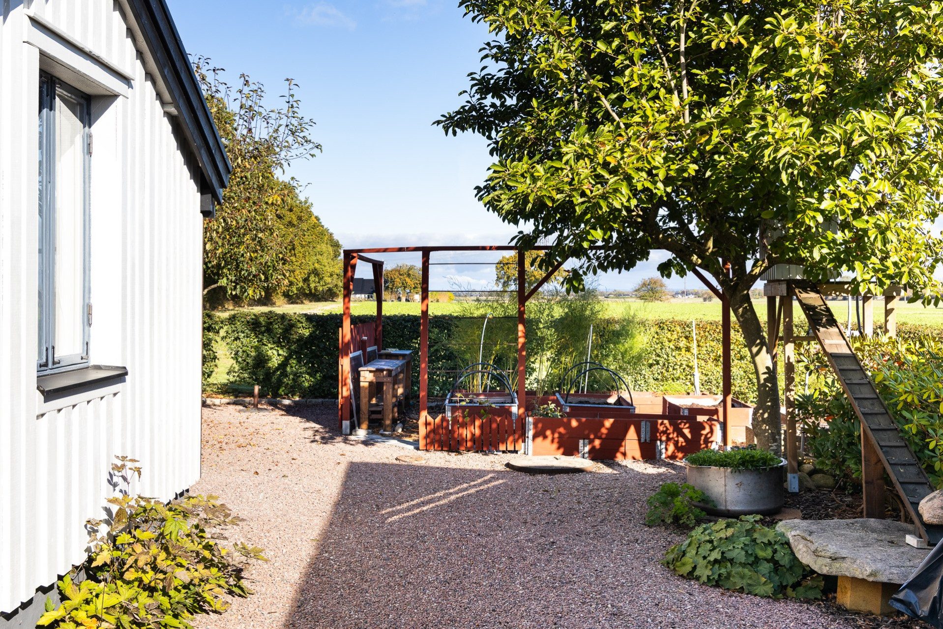 Stort uterum med plats för många sittande. Härifrån erbjuds en generös utsikt över fälten som börjar direkt utanför tomten.