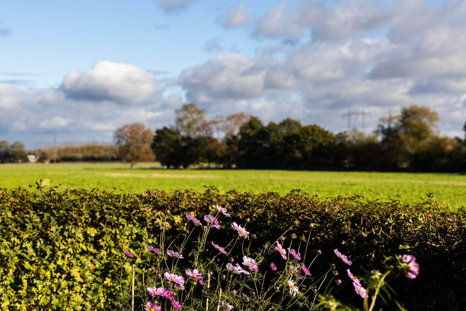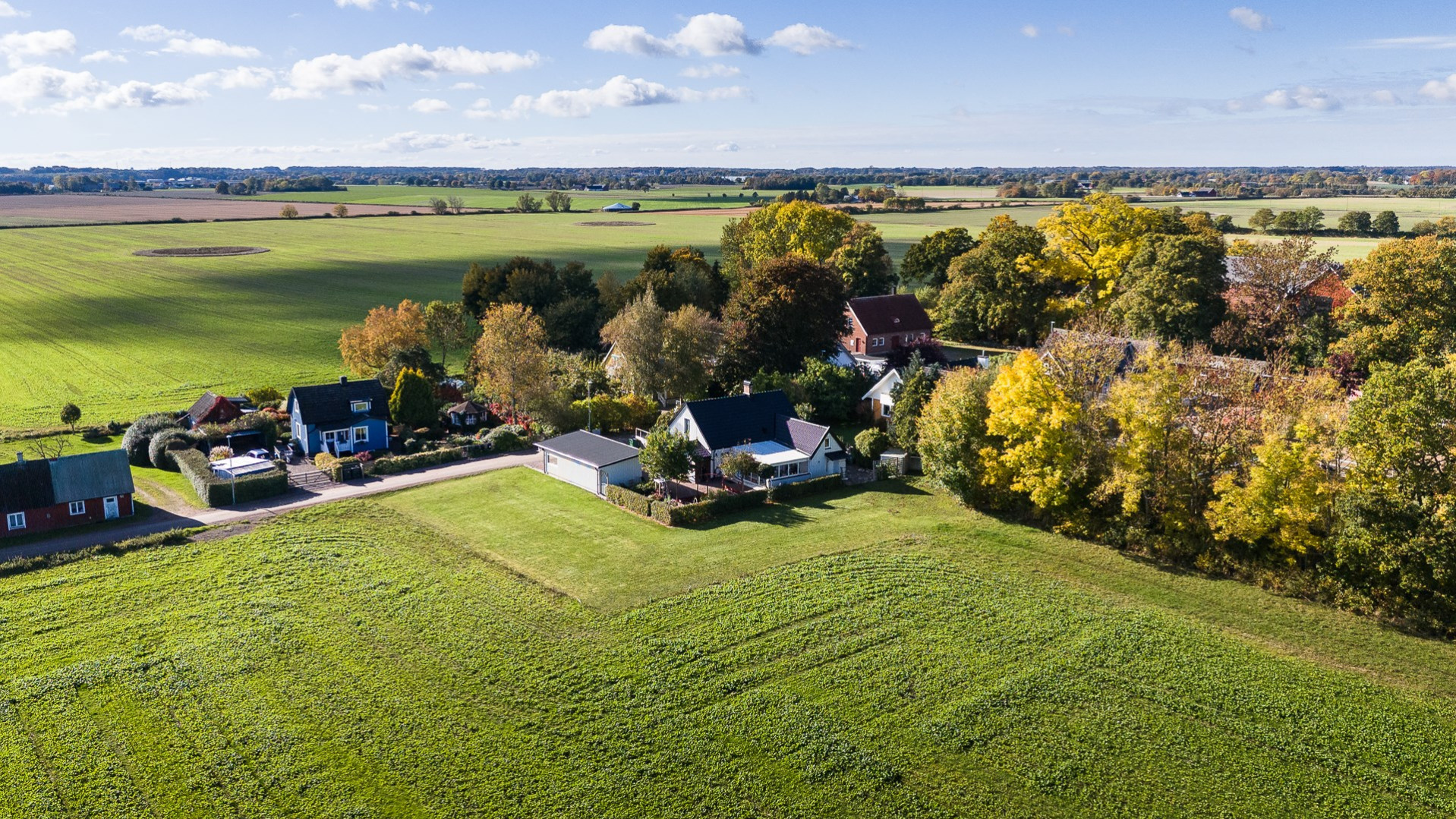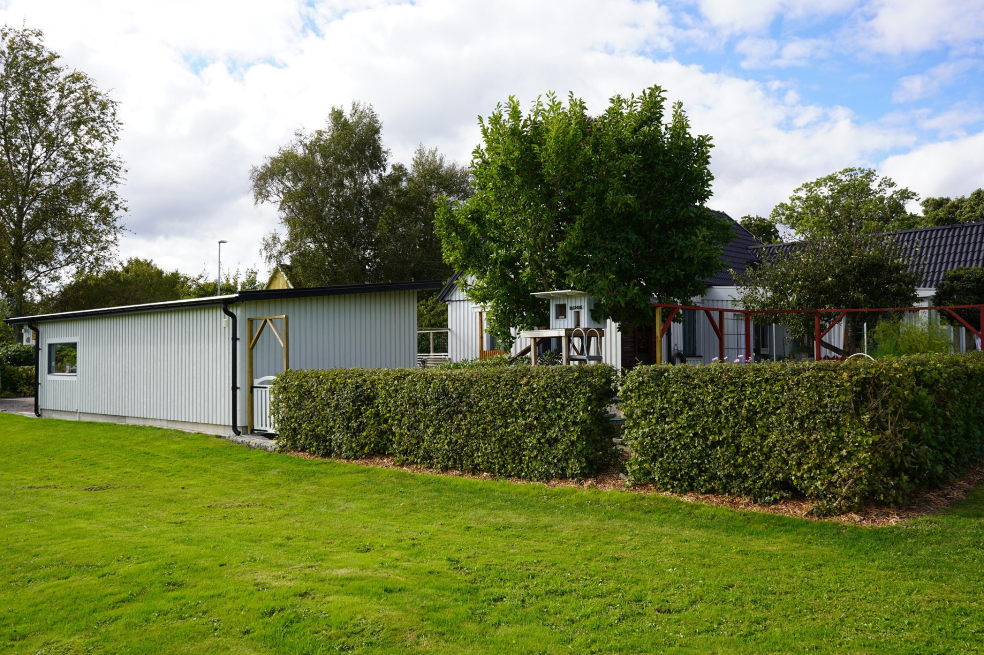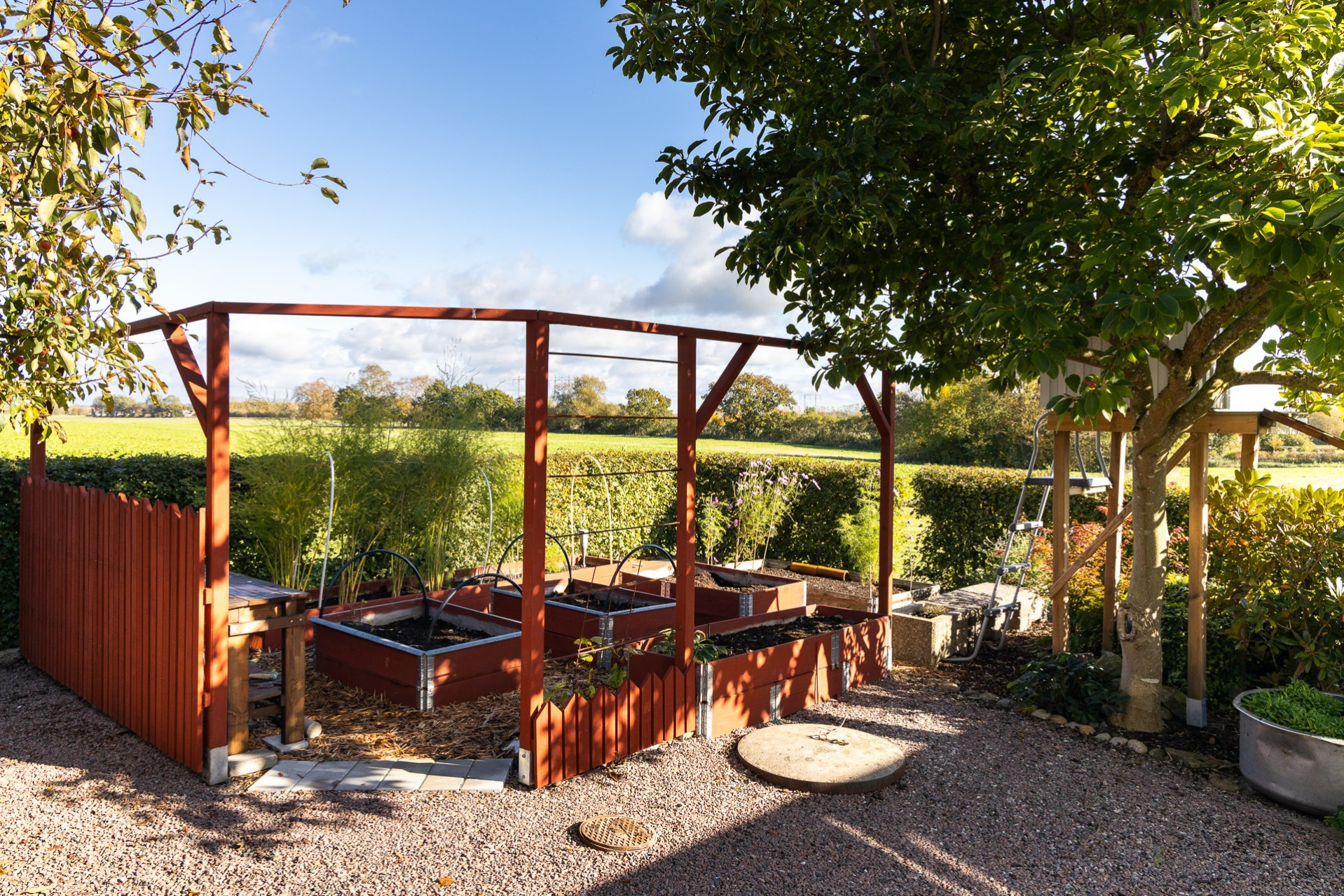 Stort uterum med plats för många sittande. Härifrån erbjuds en generös utsikt över fälten som börjar direkt utanför tomten.