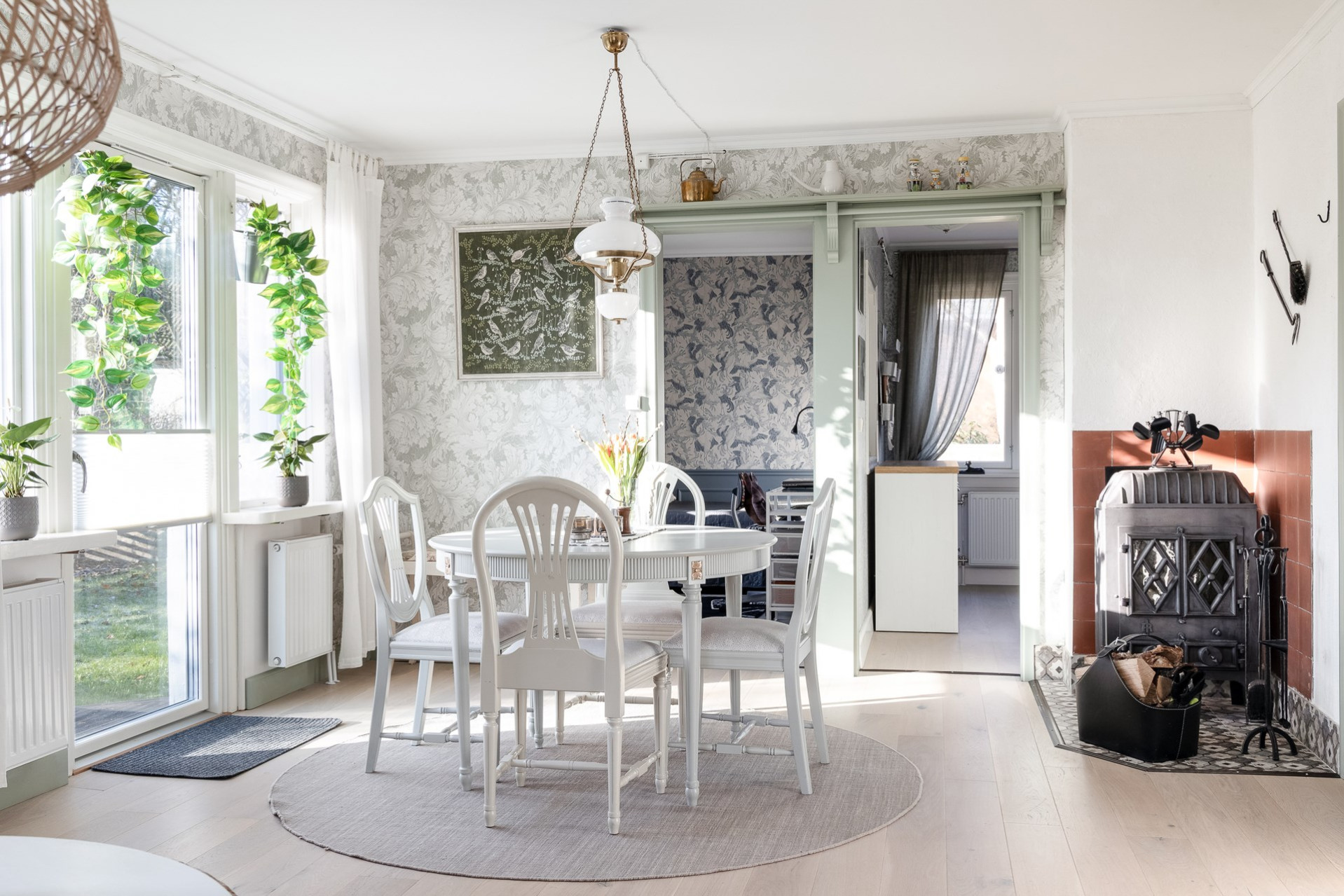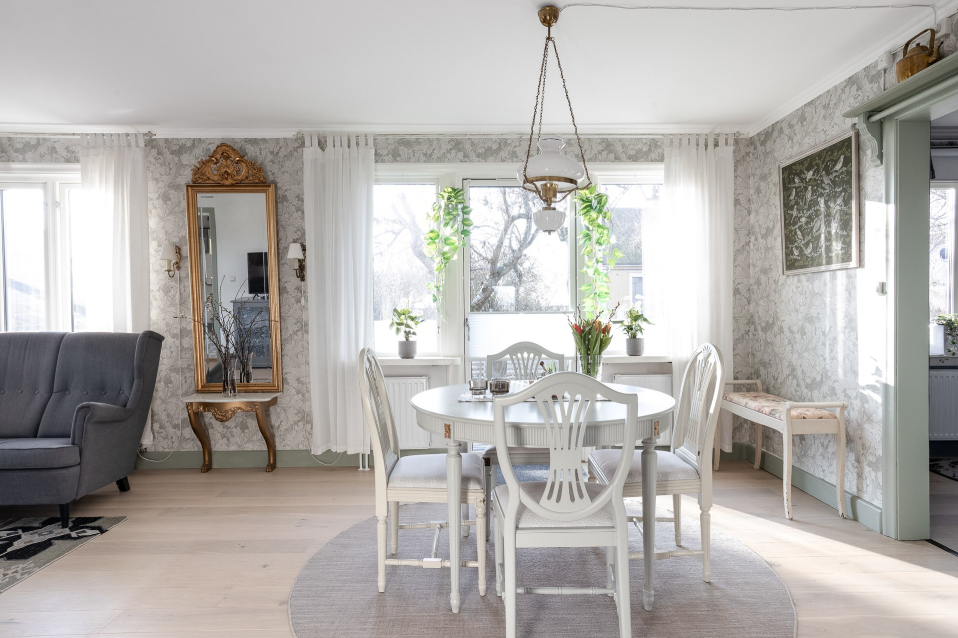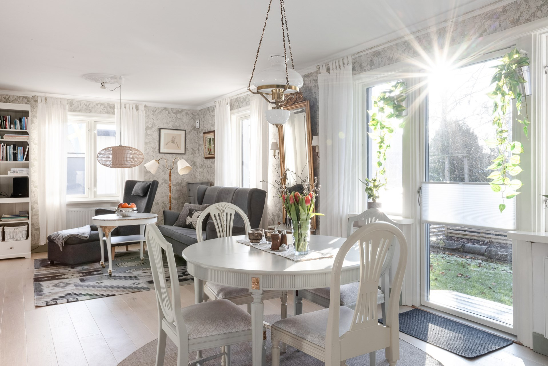Inbjudande och härligt ljust rum med många fönster samt även utgång till trädgården via altandörr. Här ryms både soffhörna och matsalsmöblemanget.