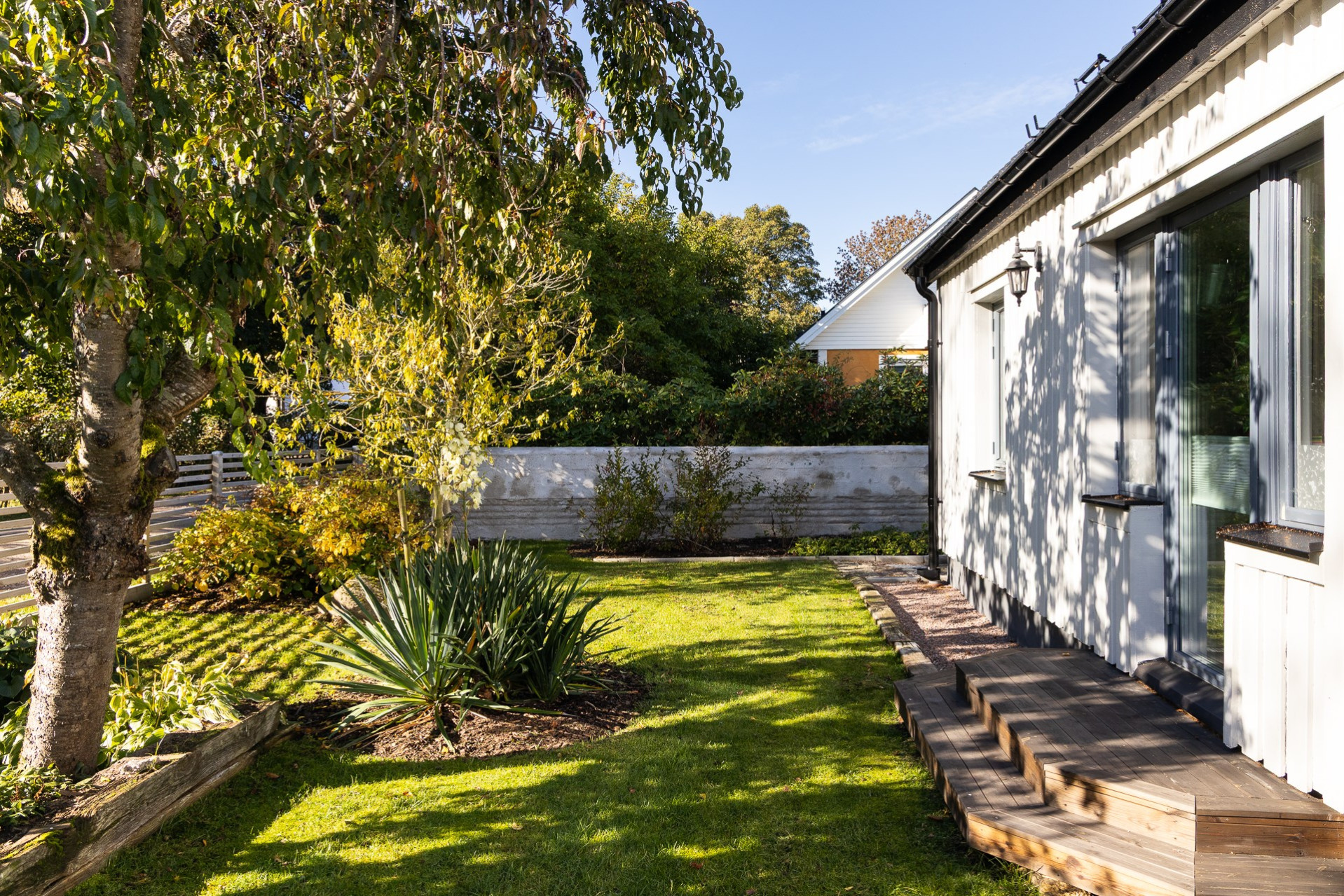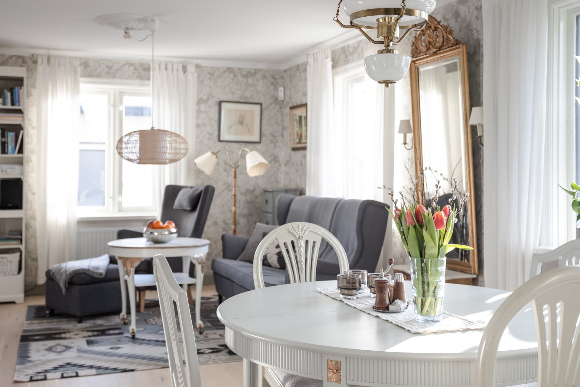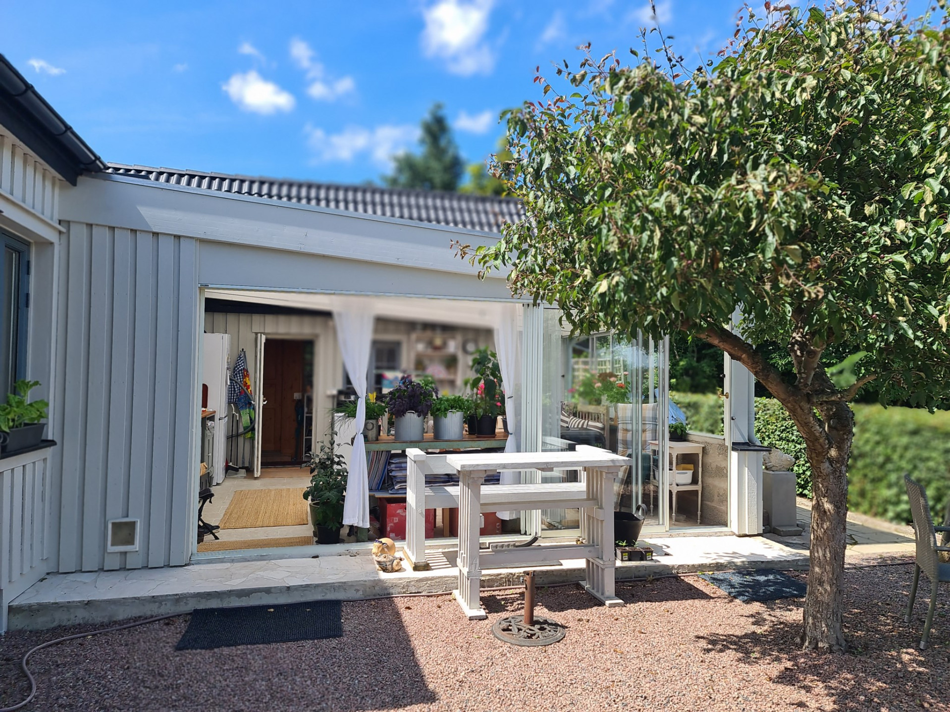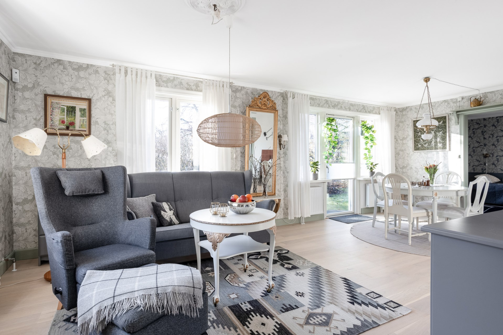 Inbjudande och härligt ljust rum med många fönster samt även utgång till trädgården via altandörr. Här ryms både soffhörna och matsalsmöblemanget.