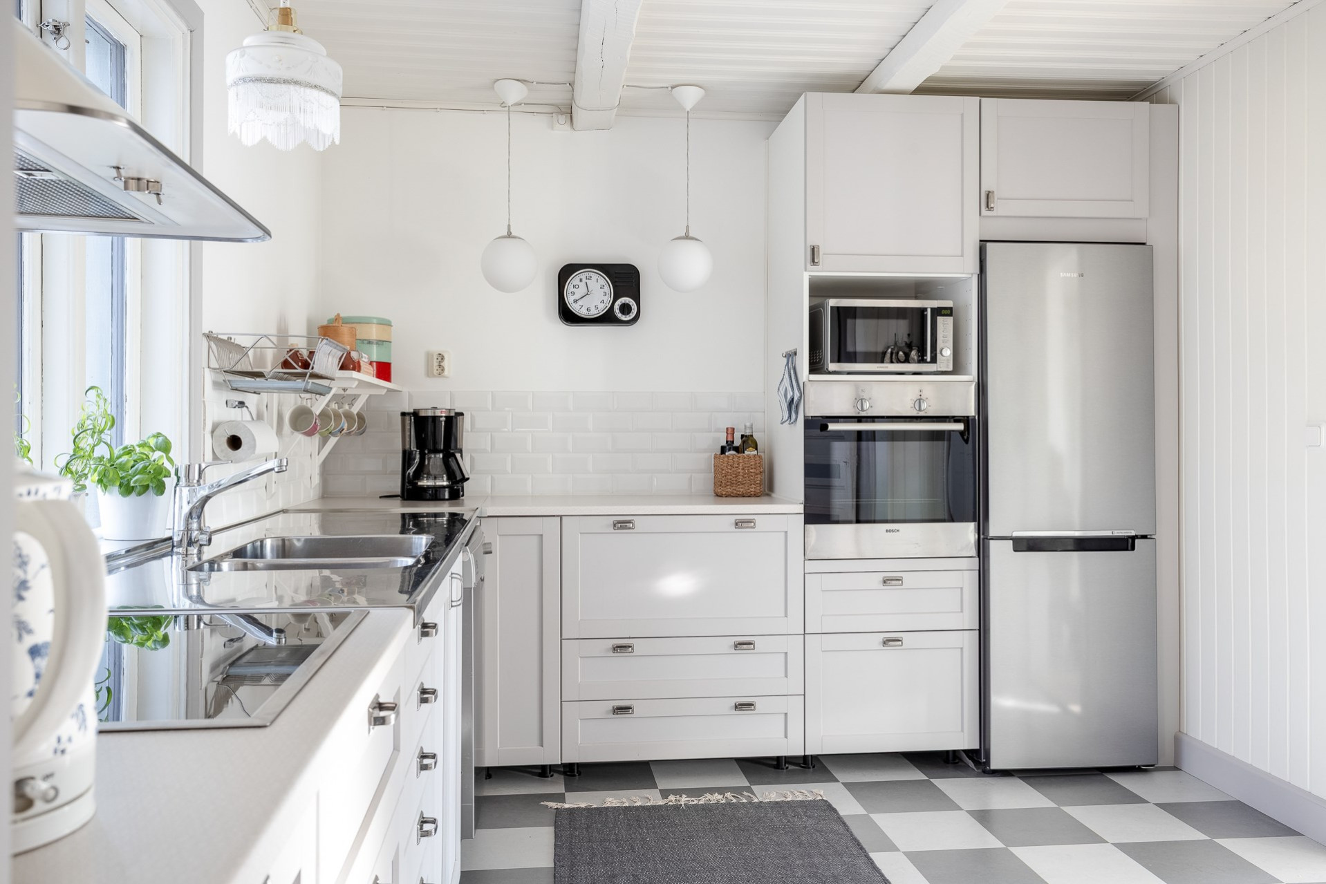 Fint kök med inredning från 2021 som verkligen passar husets ålder och karaktär. Den maskinella utrustningen består av kombinerad kyl/frys, diskmaskin, inbyggnadsugn, spishäll och fläkt. Golvet i köket är linoleumgolv i samma färgskala som själva köksinredningen.