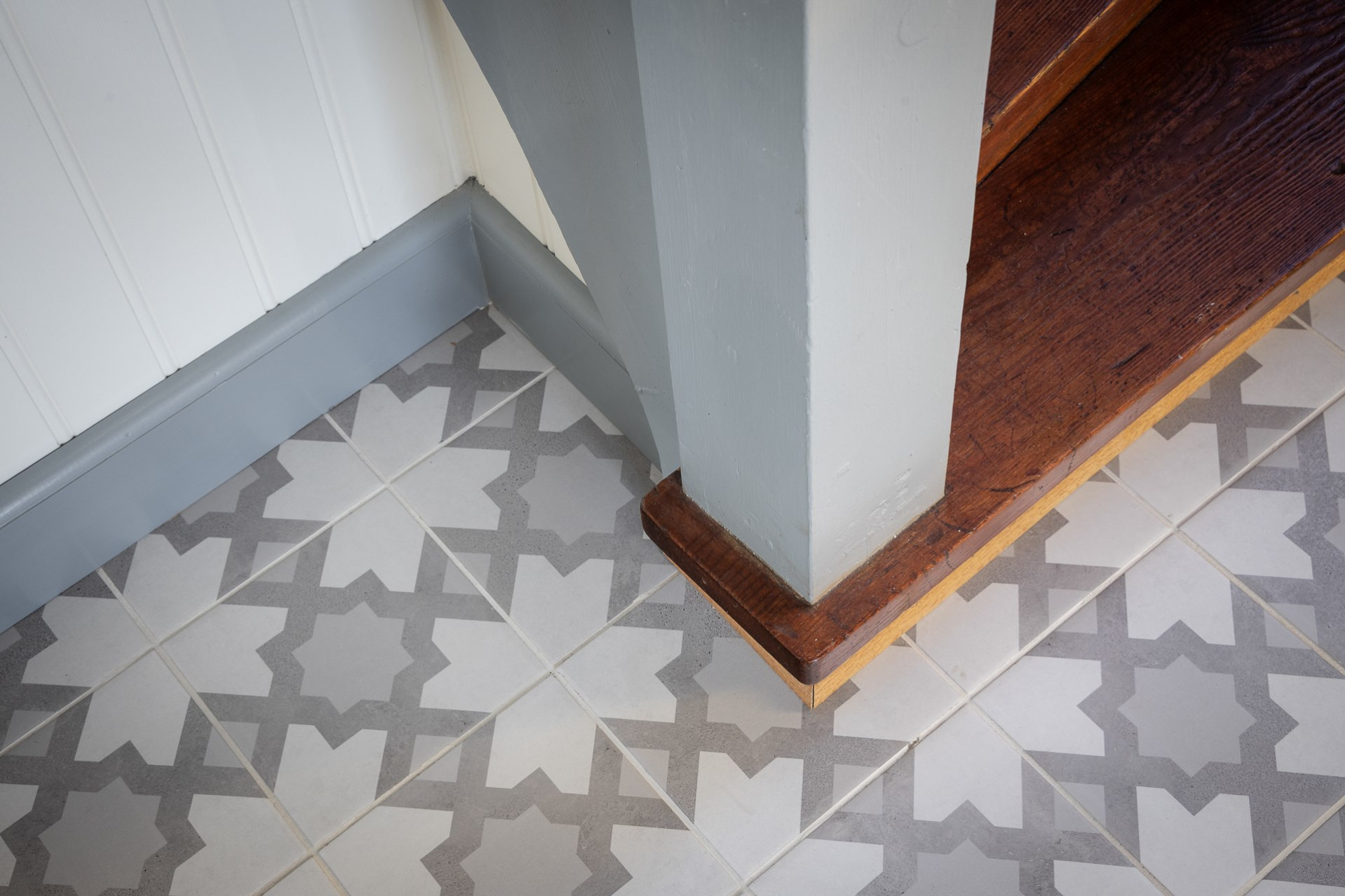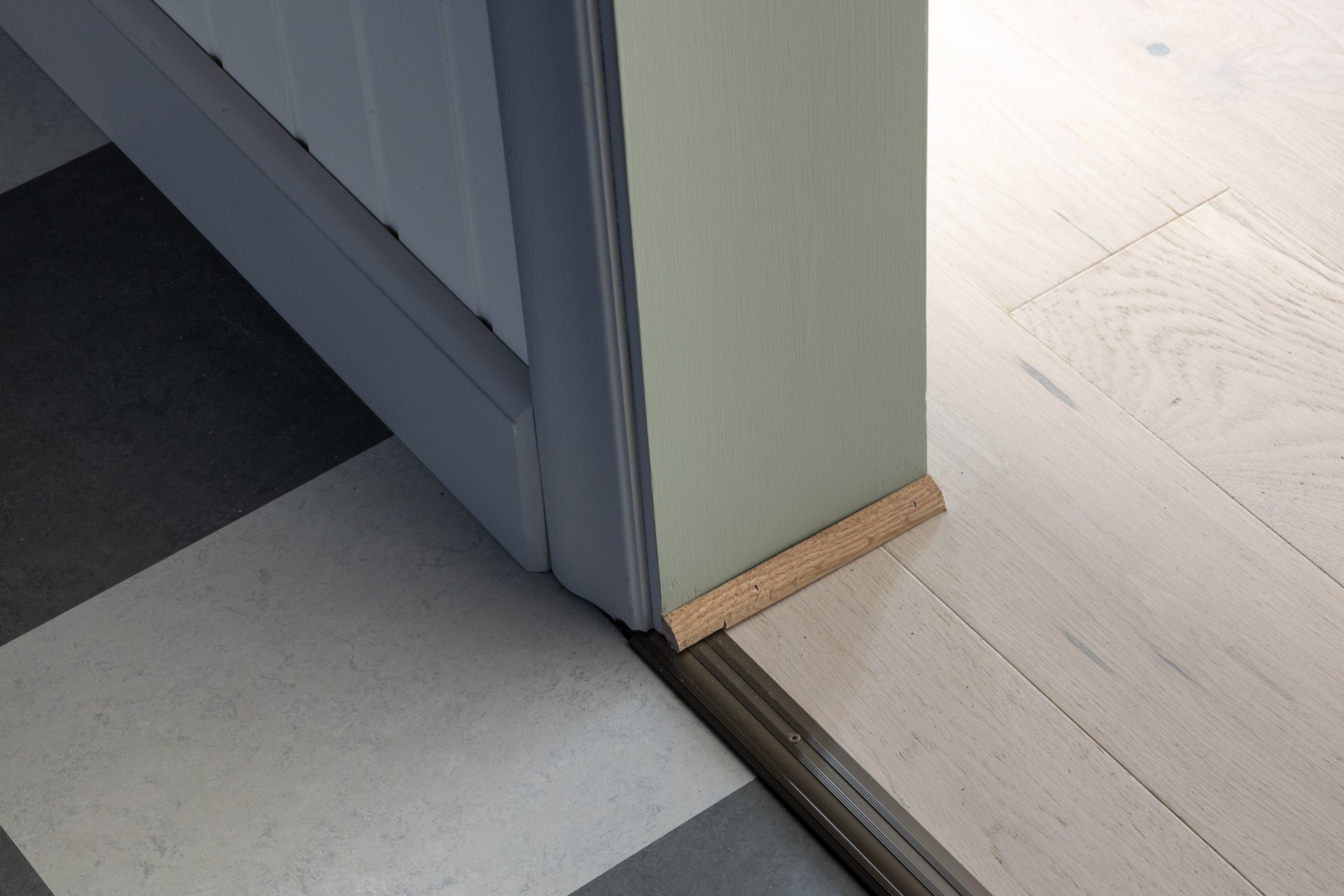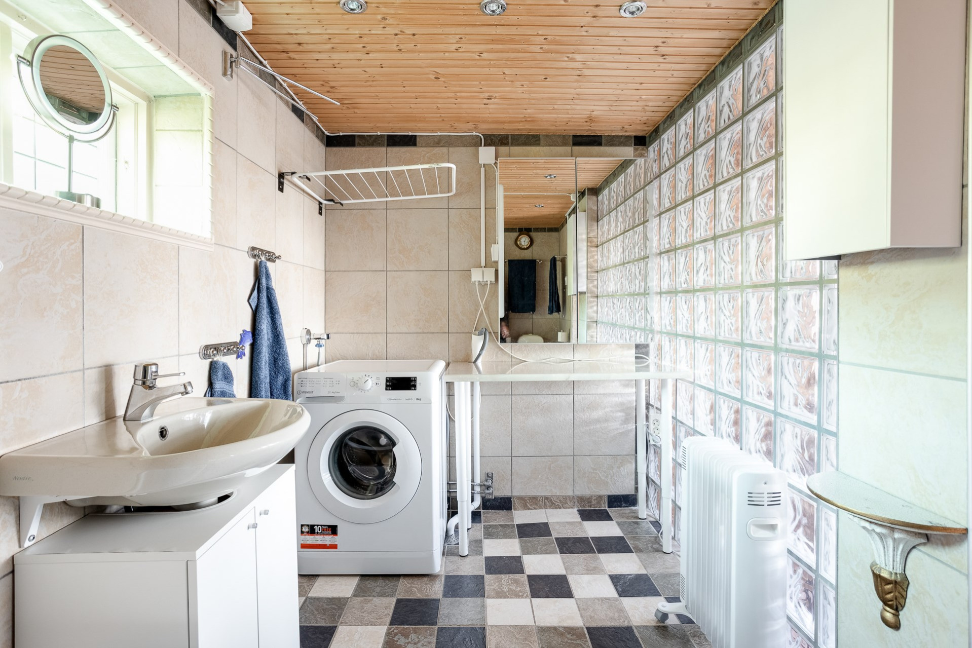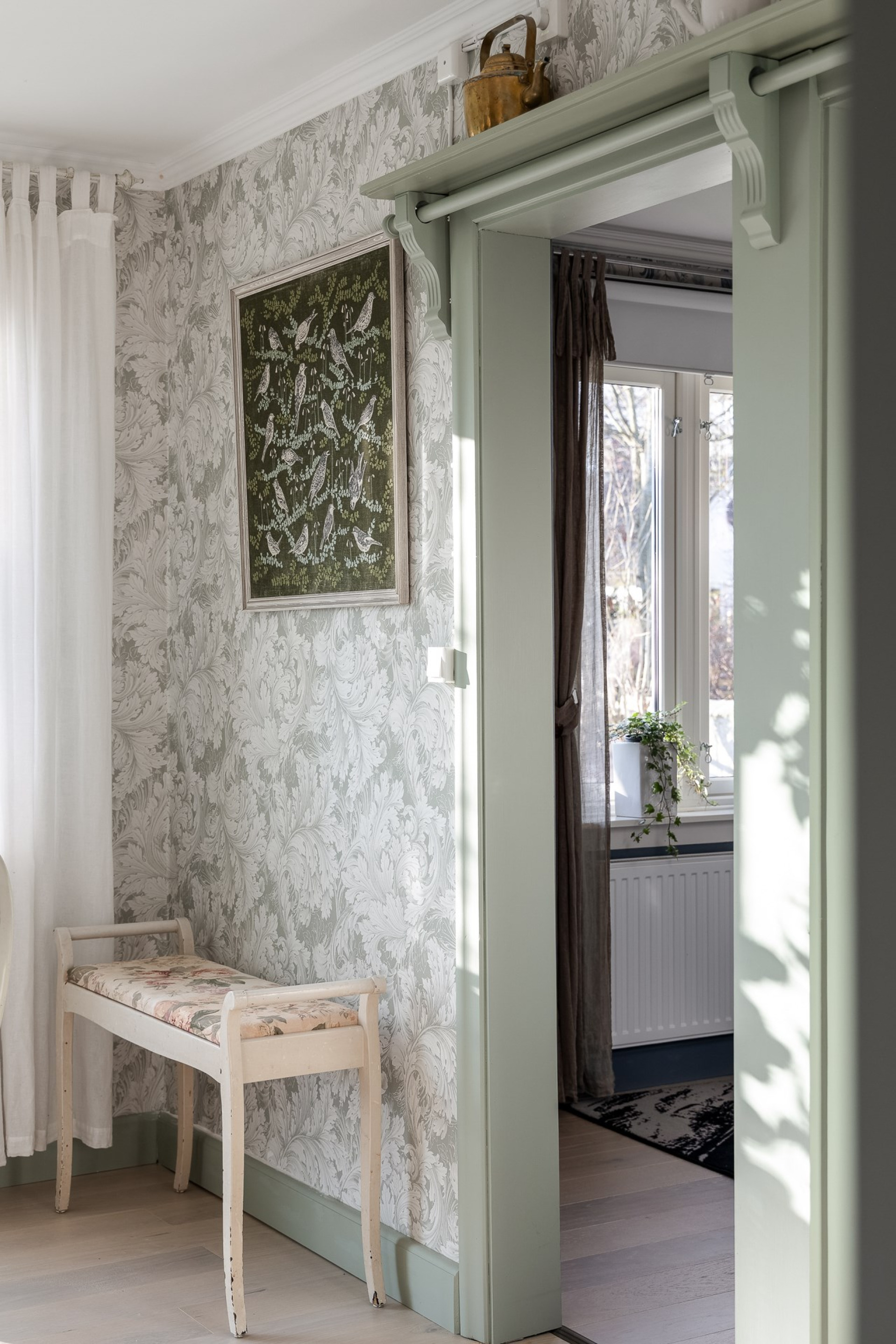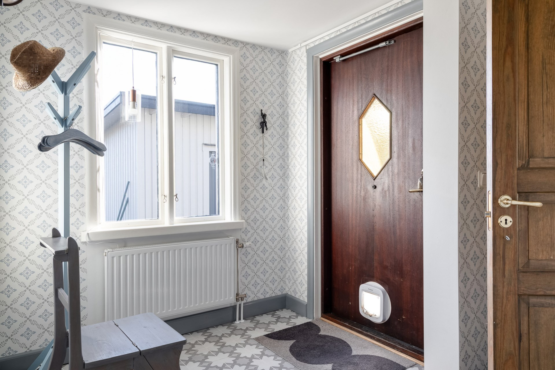 Utanför köket finns passage som leder till både badrum, uterum och förrådet längst in. Golvet är linoleum i samma färgtoner som det i köket.