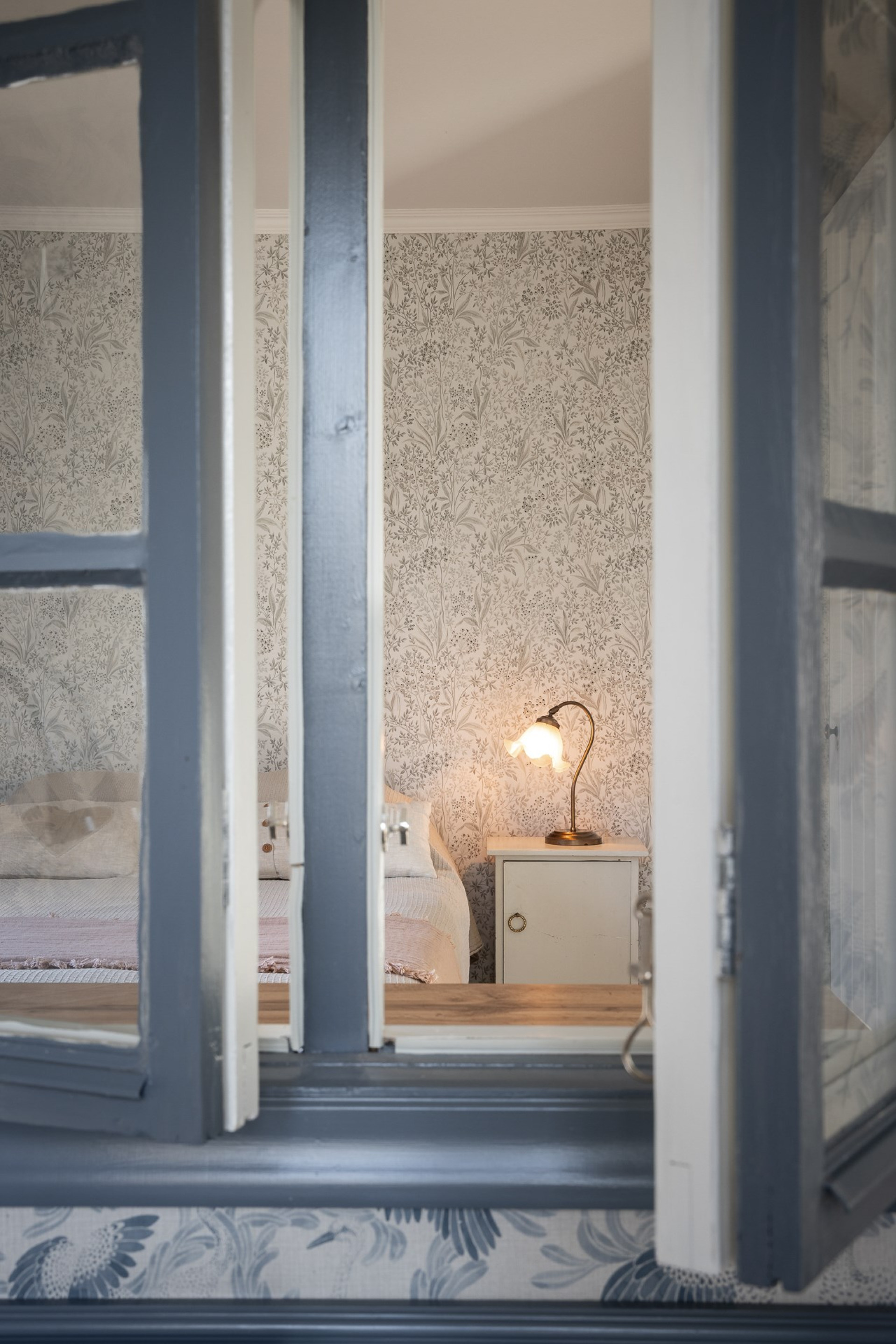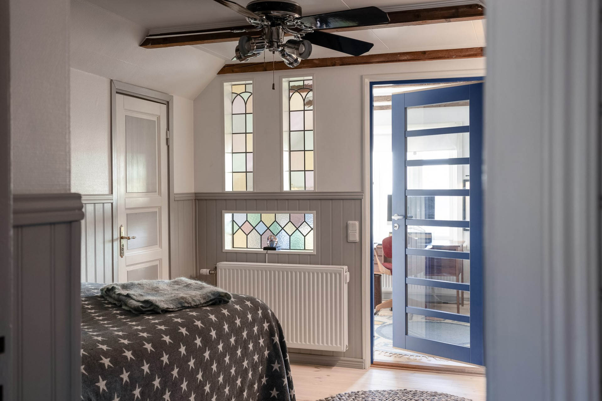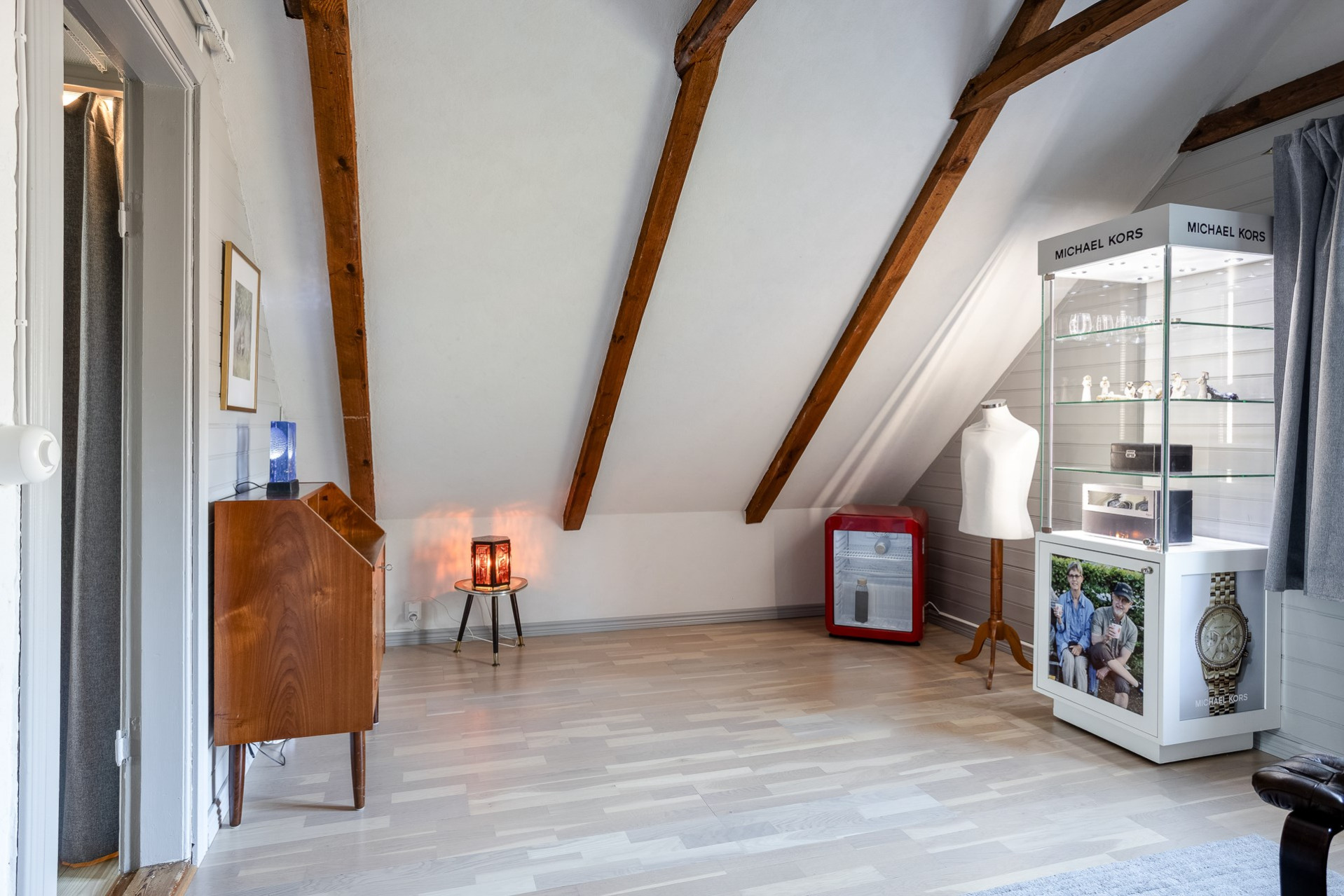 Innanför kontorsutrymmet finns ett genomgångsrum som idag används som gästrum med säng. Även här är det ljusbetsat furugolv och förvaring erbjuds på båda sidor mot snedtaket, på ena sidan i klädkammare och på den andra i garderobsutrymme bakom draperi.