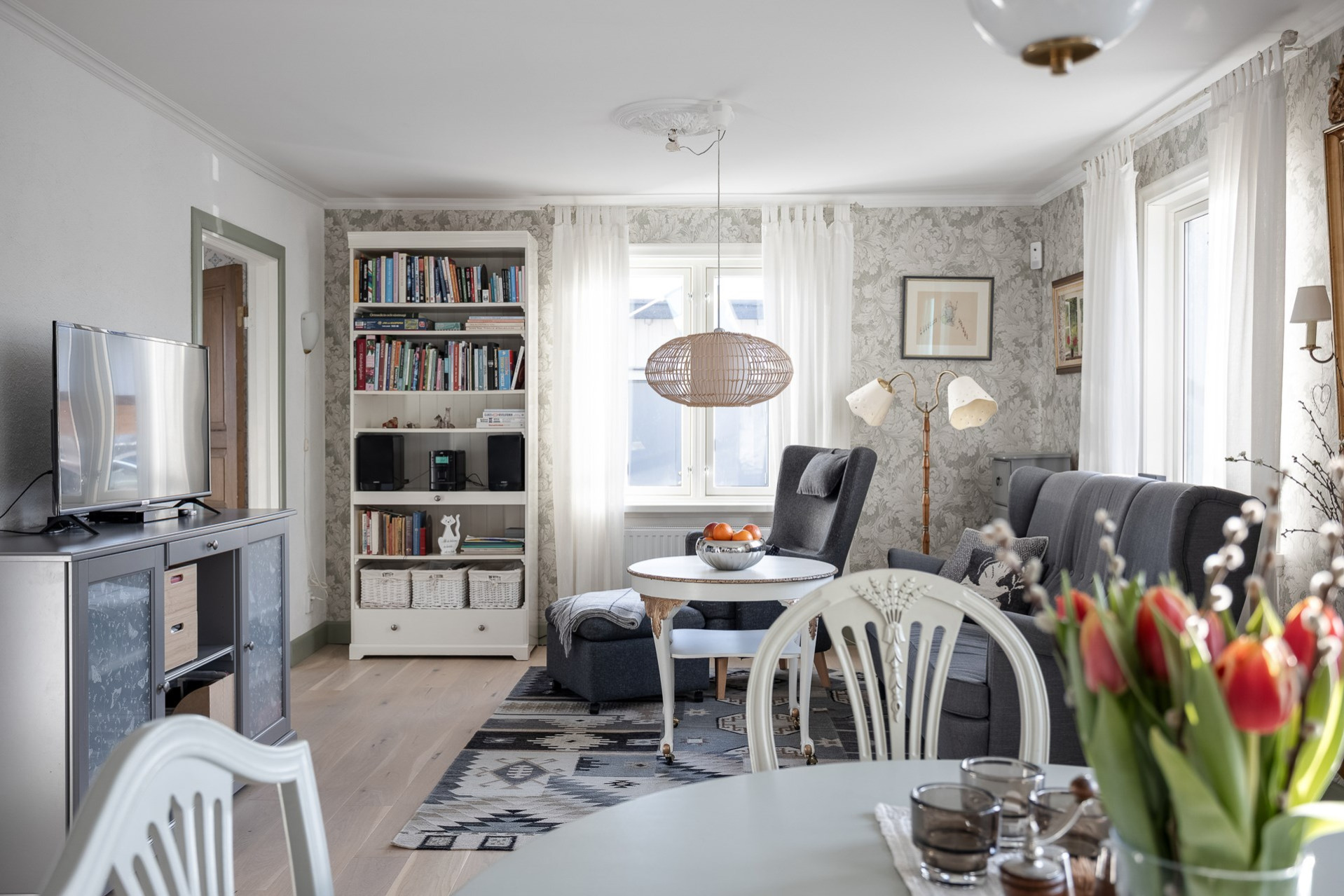 Golvet i vardagsrummet är enstavs ekparkett i ljus nyans och i rummets ena hörn finns en vacker kamin i gjutjärn som ger extra värme under kyliga höst- och vinterkvällar!