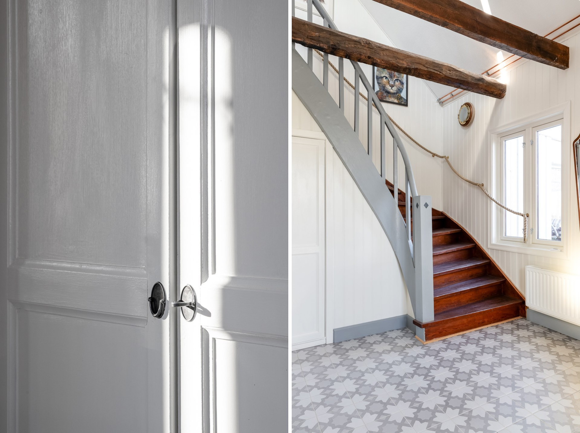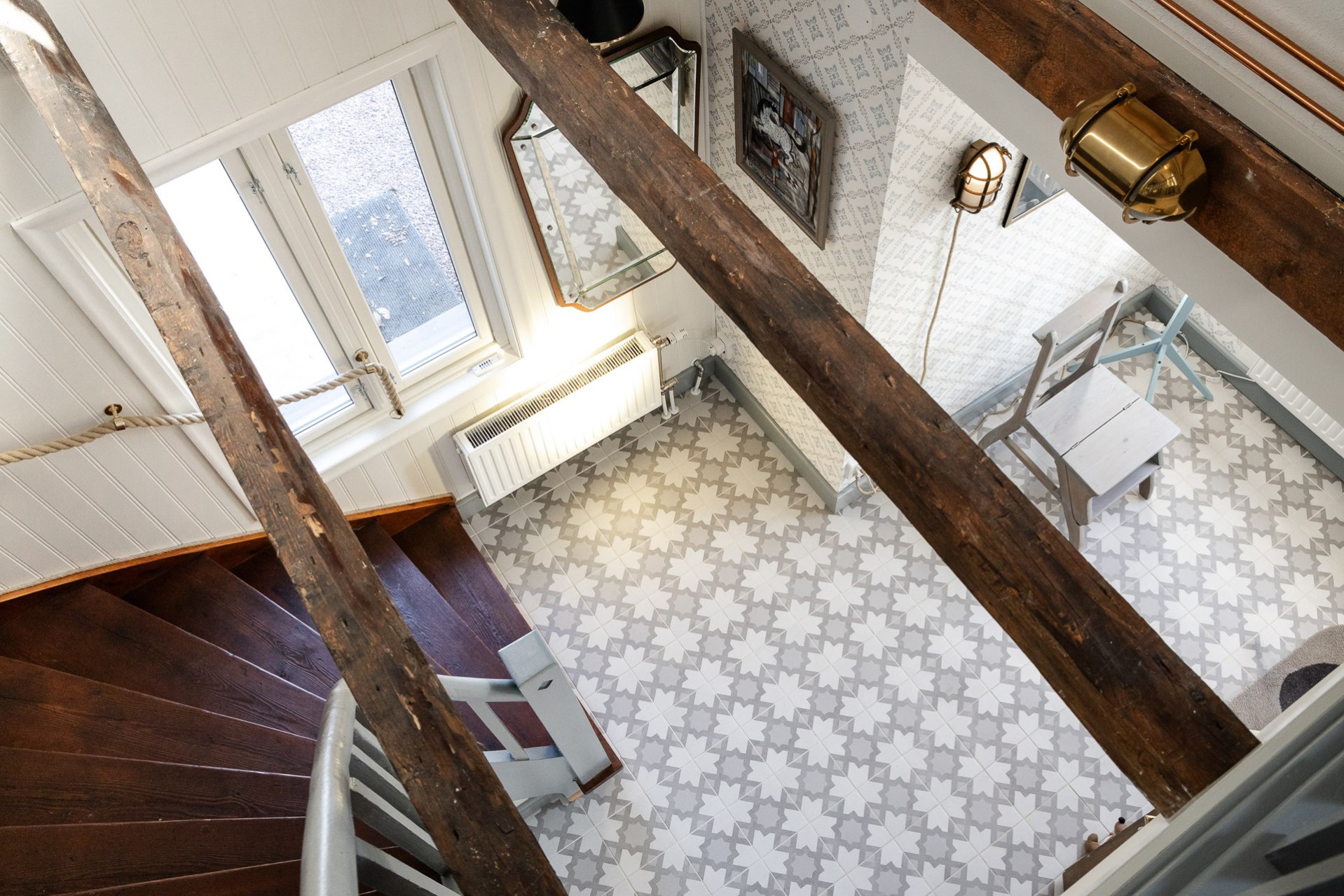 Hallen fortsätter även innanför entrédelen med samma klinker och riktar man blicken uppåt och följer trappan till ovanvåningen så är de frilagda bjälkarna en inredningsdetalj i sig själva!