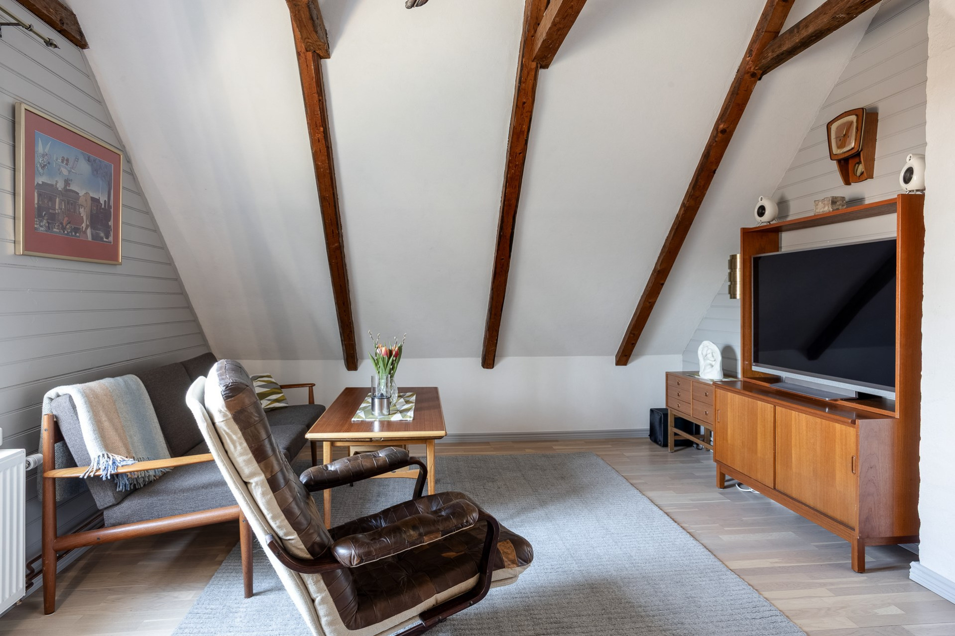 Innanför gästrummet ligger ett större tv-rum som även hade fungerat utmärkt som sovrum beroende på behov. Golvet här är ljusbetsad ekparkett i samma nyans som brädgolvet i rummen utanför.