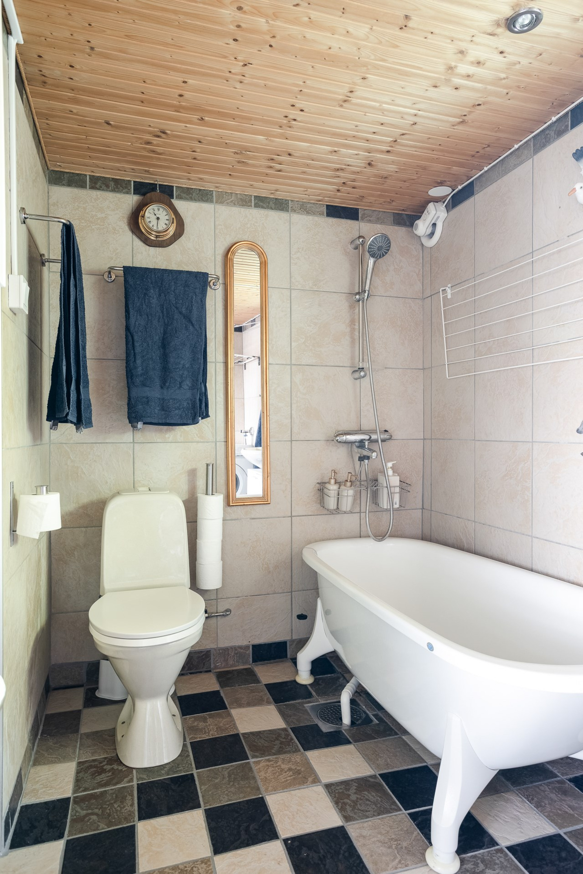 Helkaklat badrum med badkar, tvättmaskin, handfat och wc.