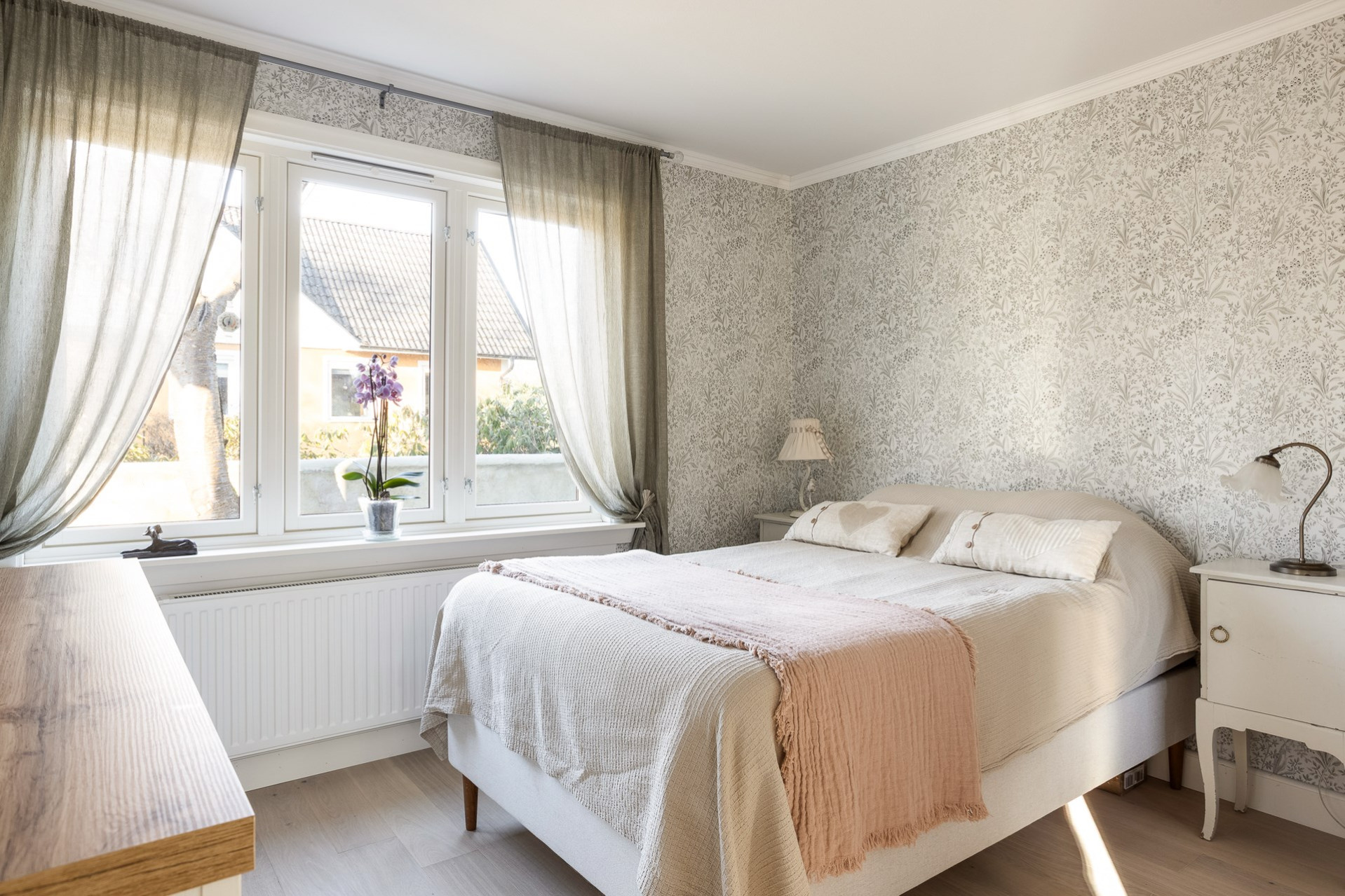 Större sovrum med ljusbetsad ekparkett. Gott om plats för både dubbelsäng och övrig möblering.
