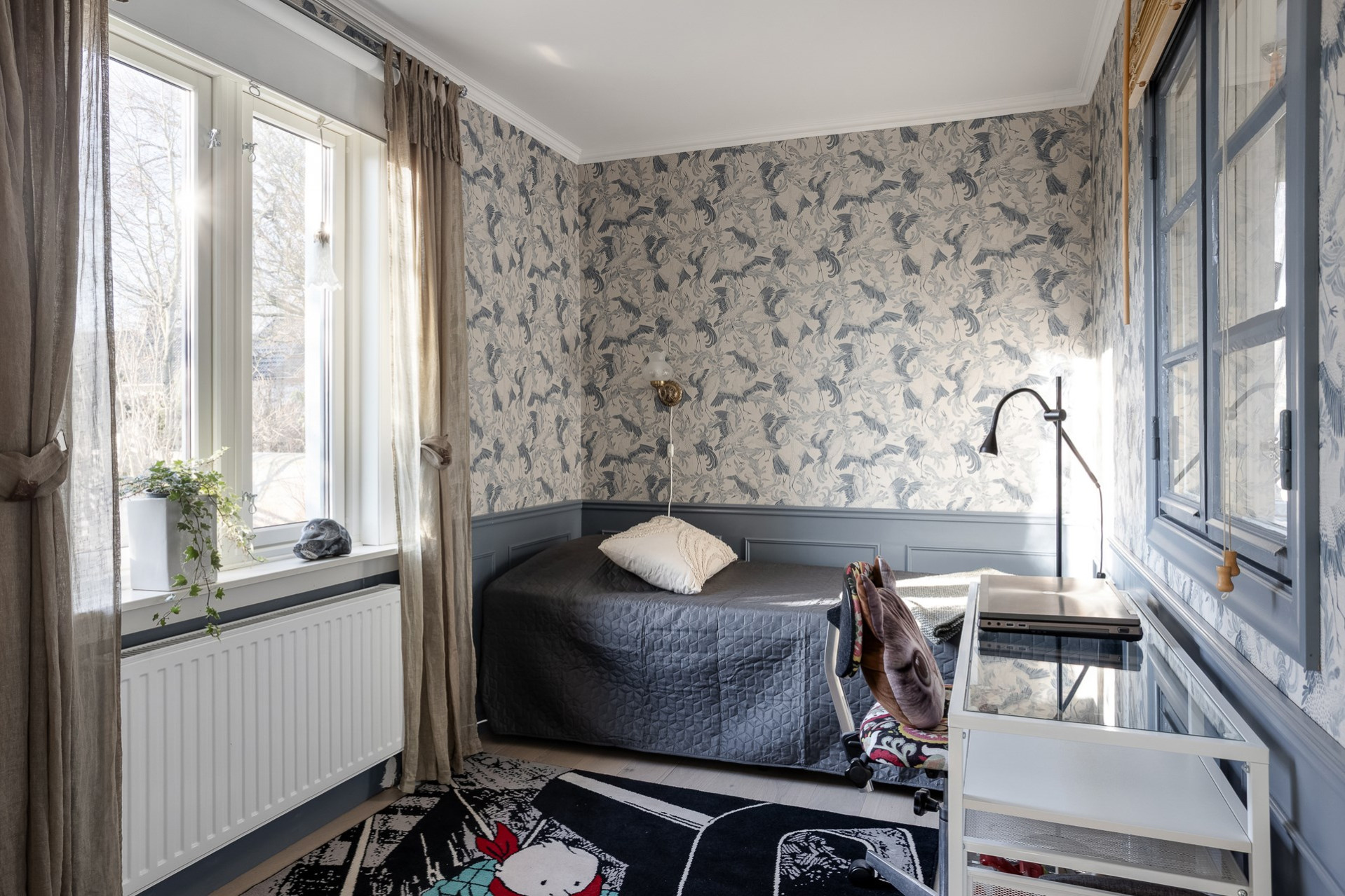 Något mindre än sovrum 1 men rymmer likväl en rejäl säng och diverse övrig möblering. Ljusbetsad ekparkett.