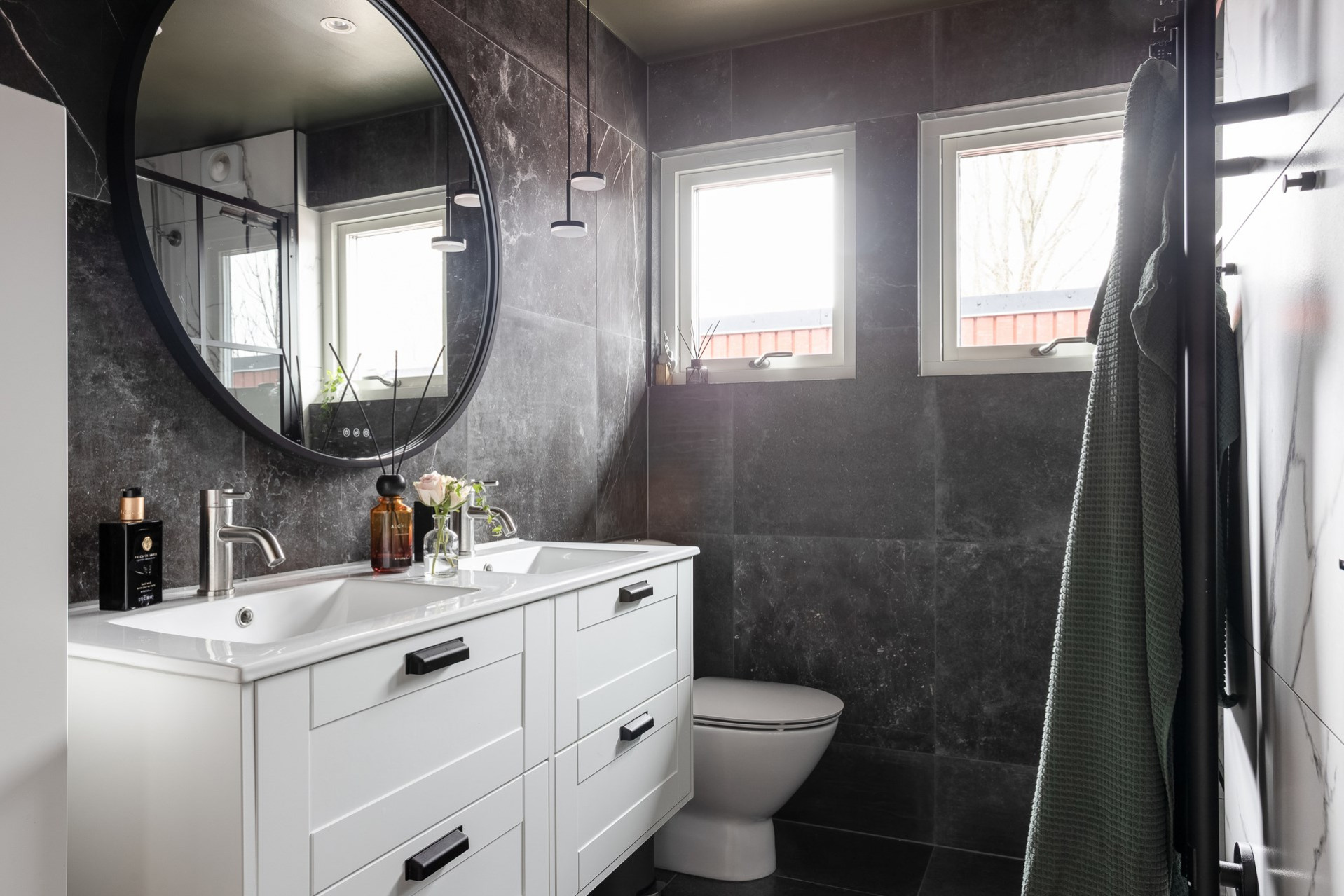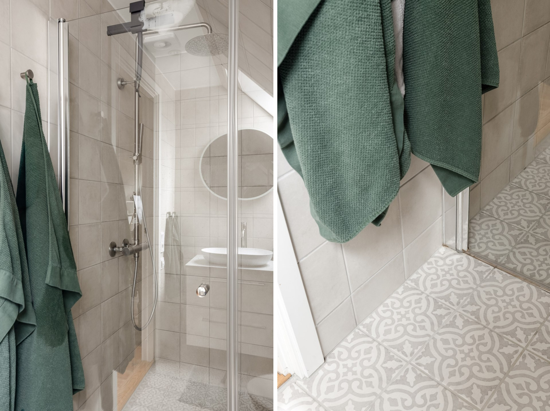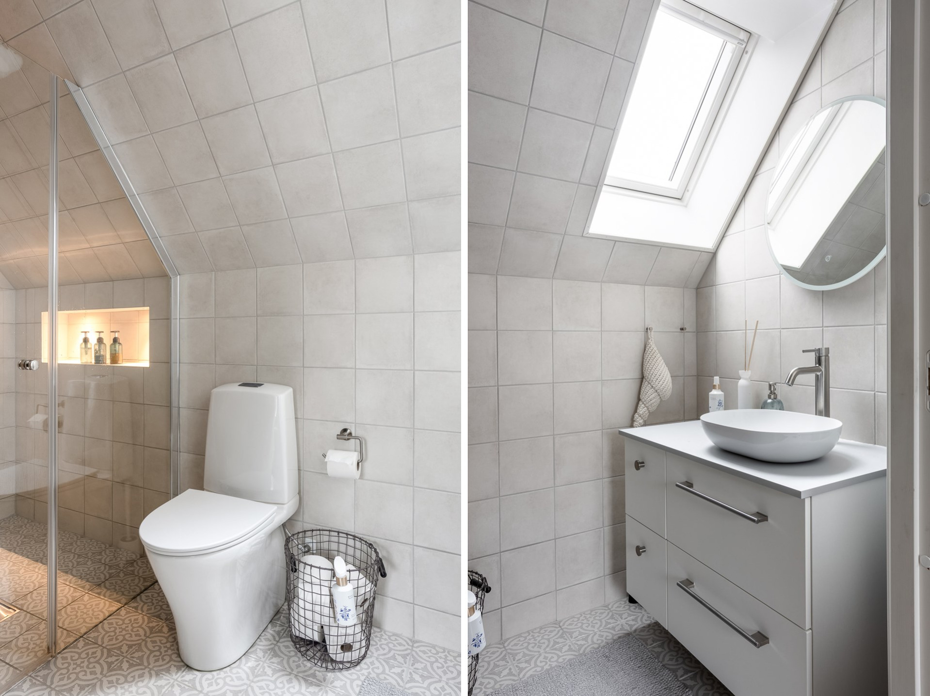 Badrum ovanvåning 2022 – Temal bänkskiva, Primy kranar, kakel och klinker samt golvvärme.