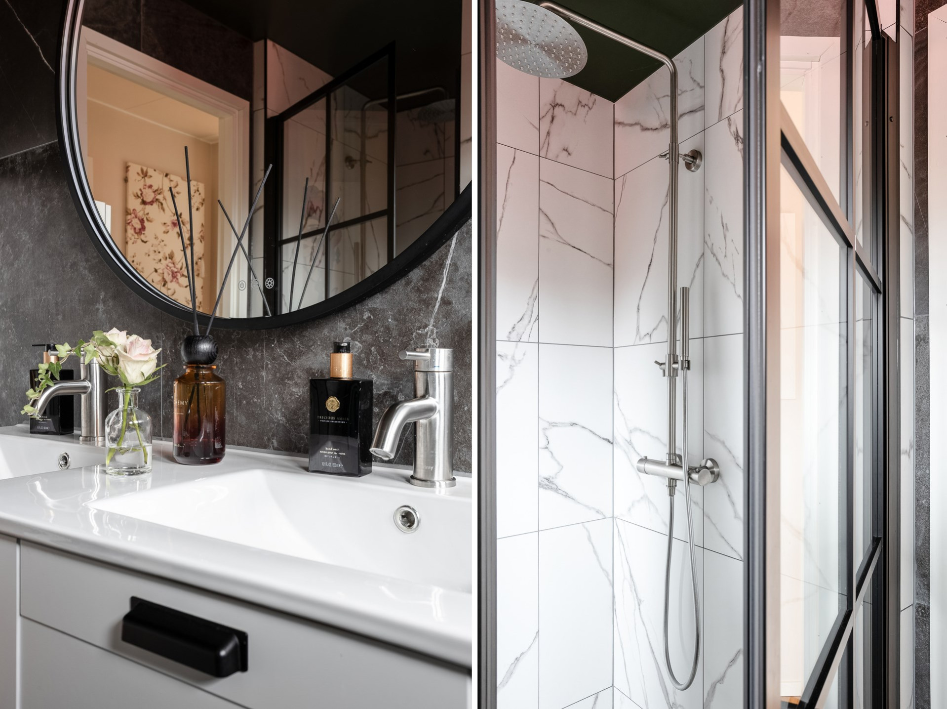 Badrum renoverades på nedervåningen 2021 med fönsterbyte (traryds fönster). Våtrumsintyg finns på båda badrummen. Vi har även satt paxfläktar till bägge badrummen. Kranar och dusch märket Primy. Golv och väggar i granitkeramik. Golvvärme. Byte av alla innerdörrar