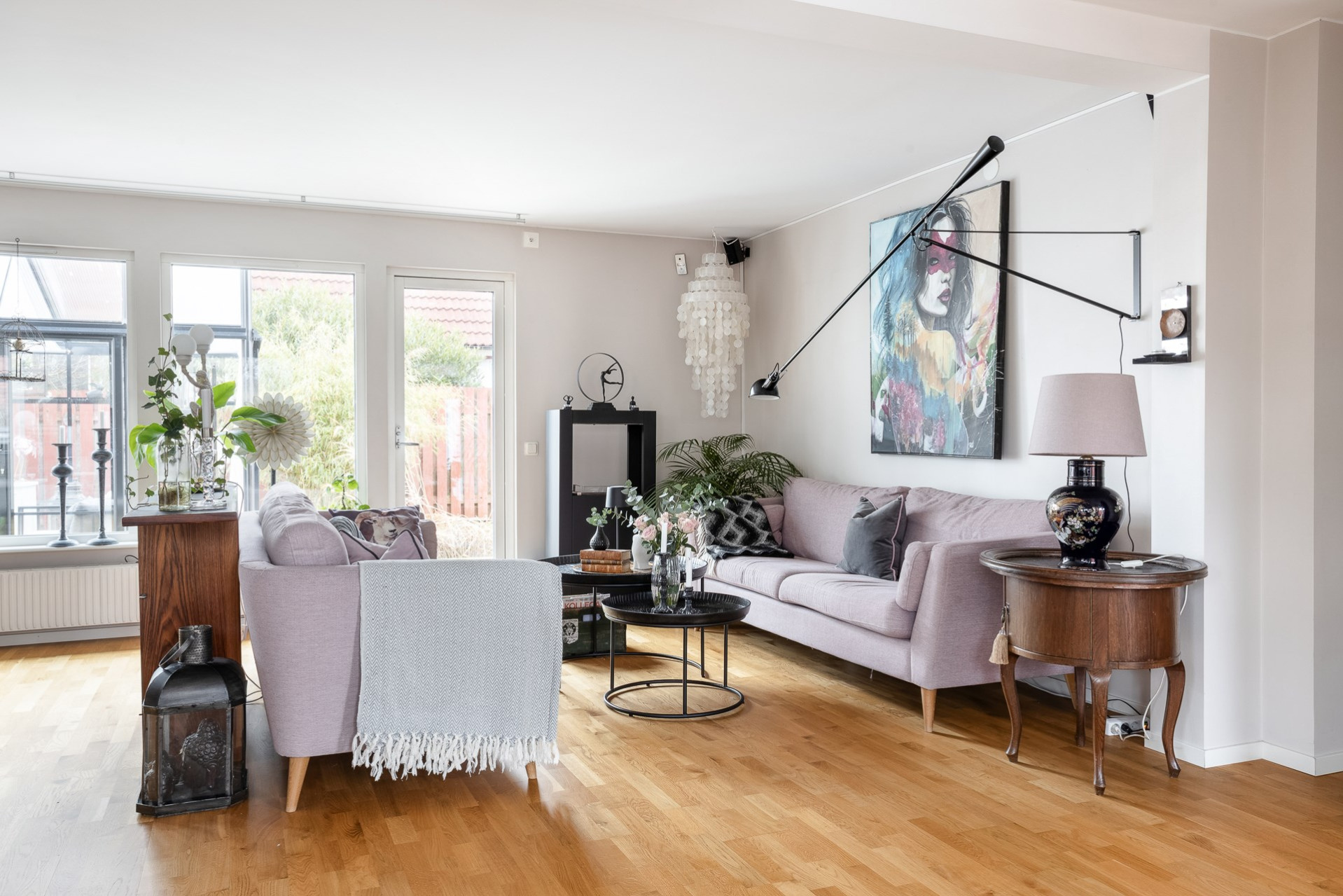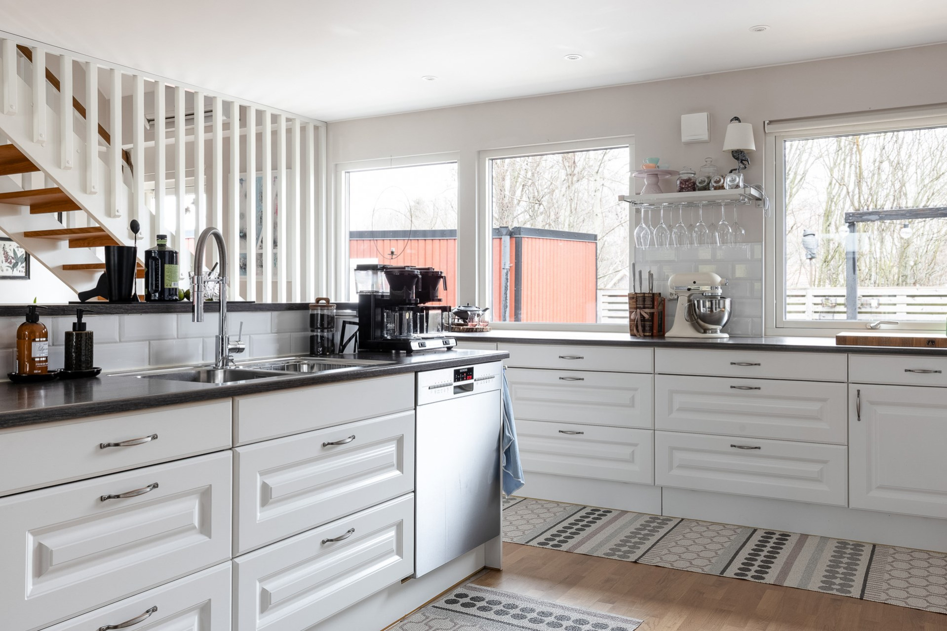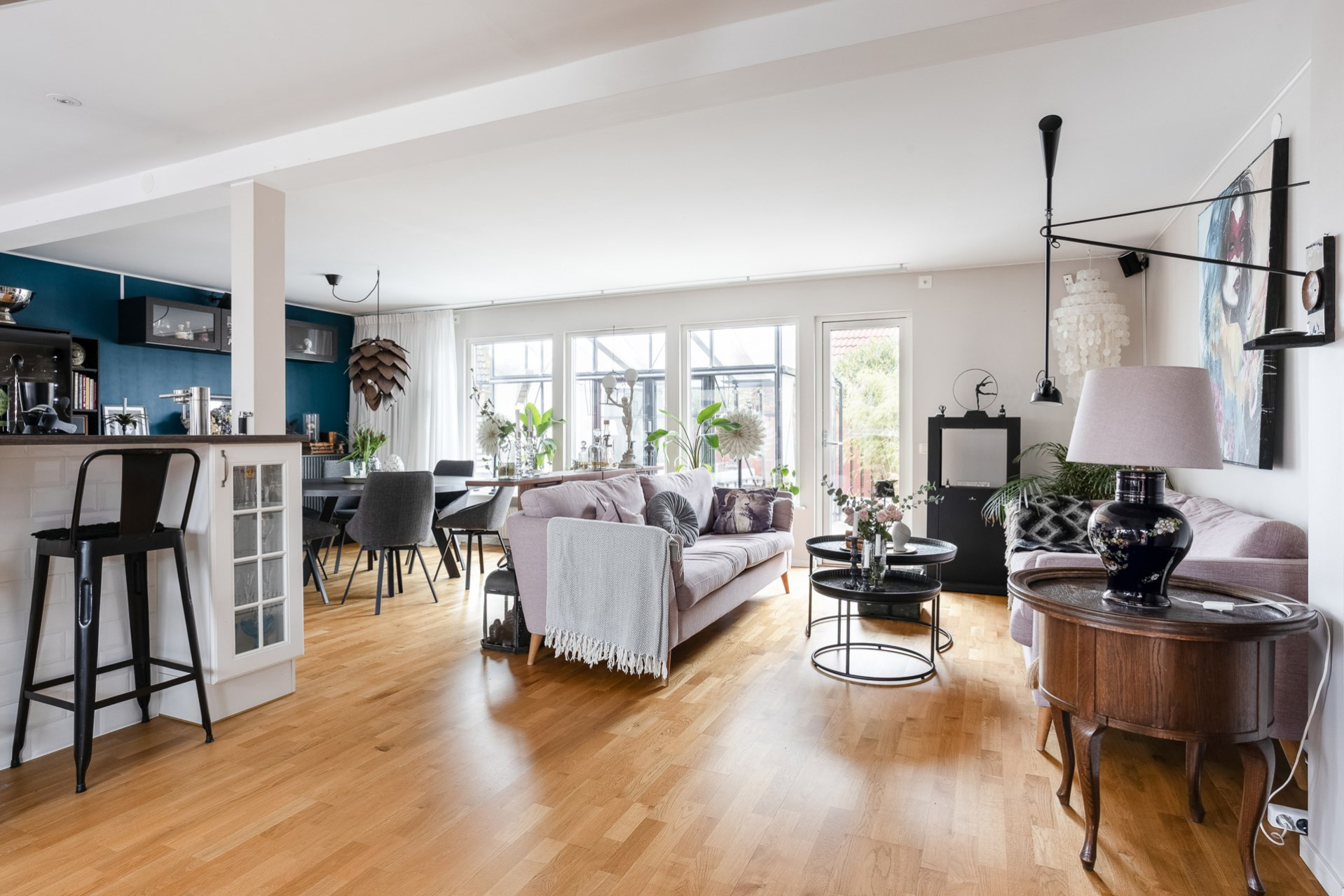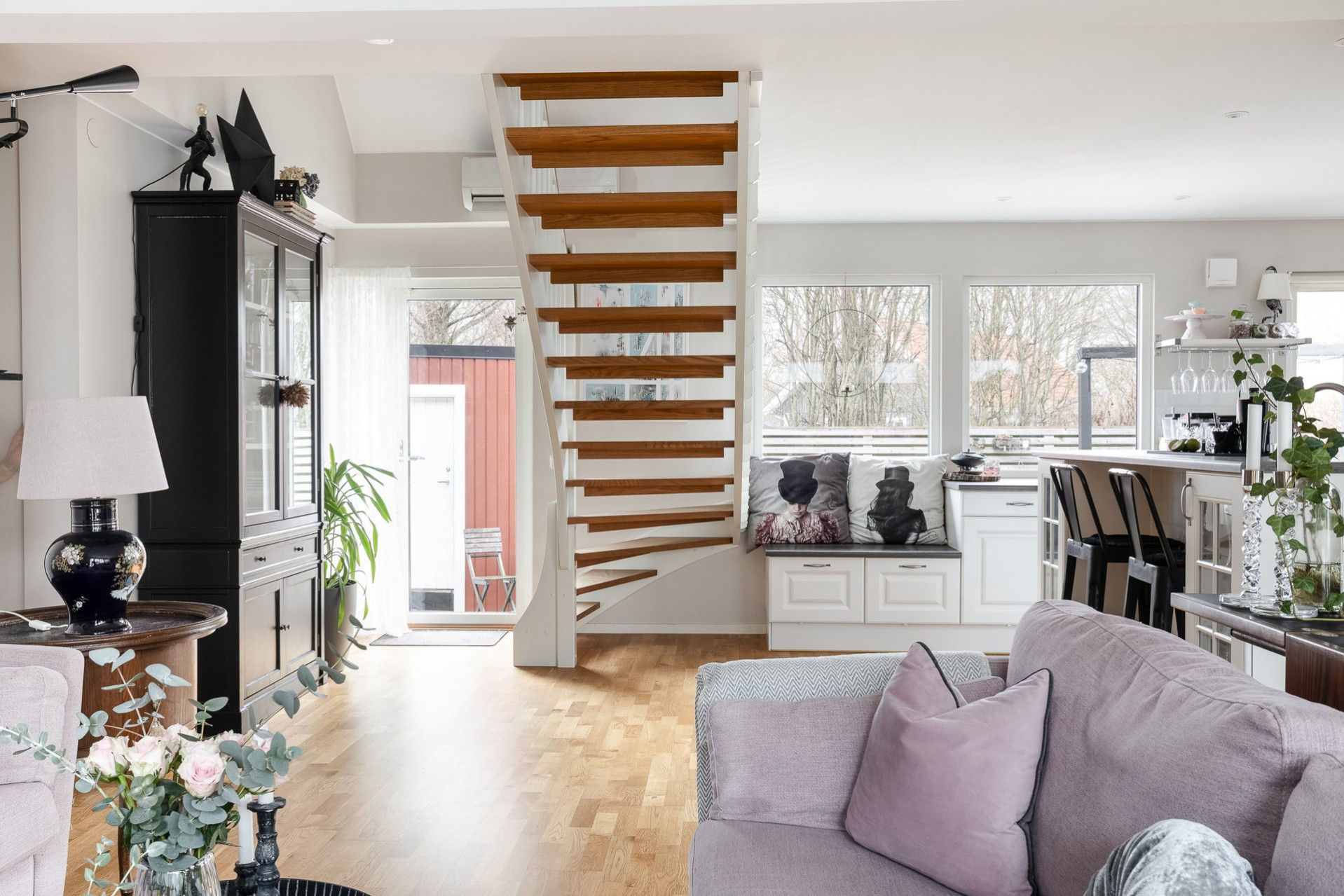 Byte av ytterdörr på långsidan av huset till altandörr i köket. Golvet byttes ut också i kök, vardagsrum och hall. Trestavsparkett mattlackat.