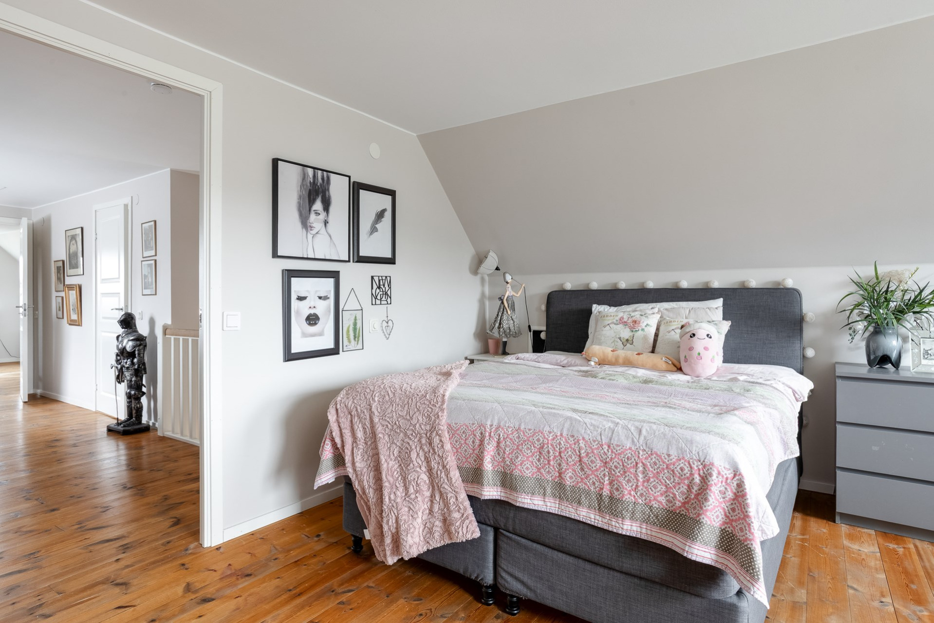 Golv i sovrum 1 och 2 på nedervåningen lades troligtvis 2008 och då tapetserade vi. Vi har dock målat om 2015 och satt gipsskivor på spontskivor (ej bytt ut golv). Trestavsparkett mattlackat i hela undervåningen.