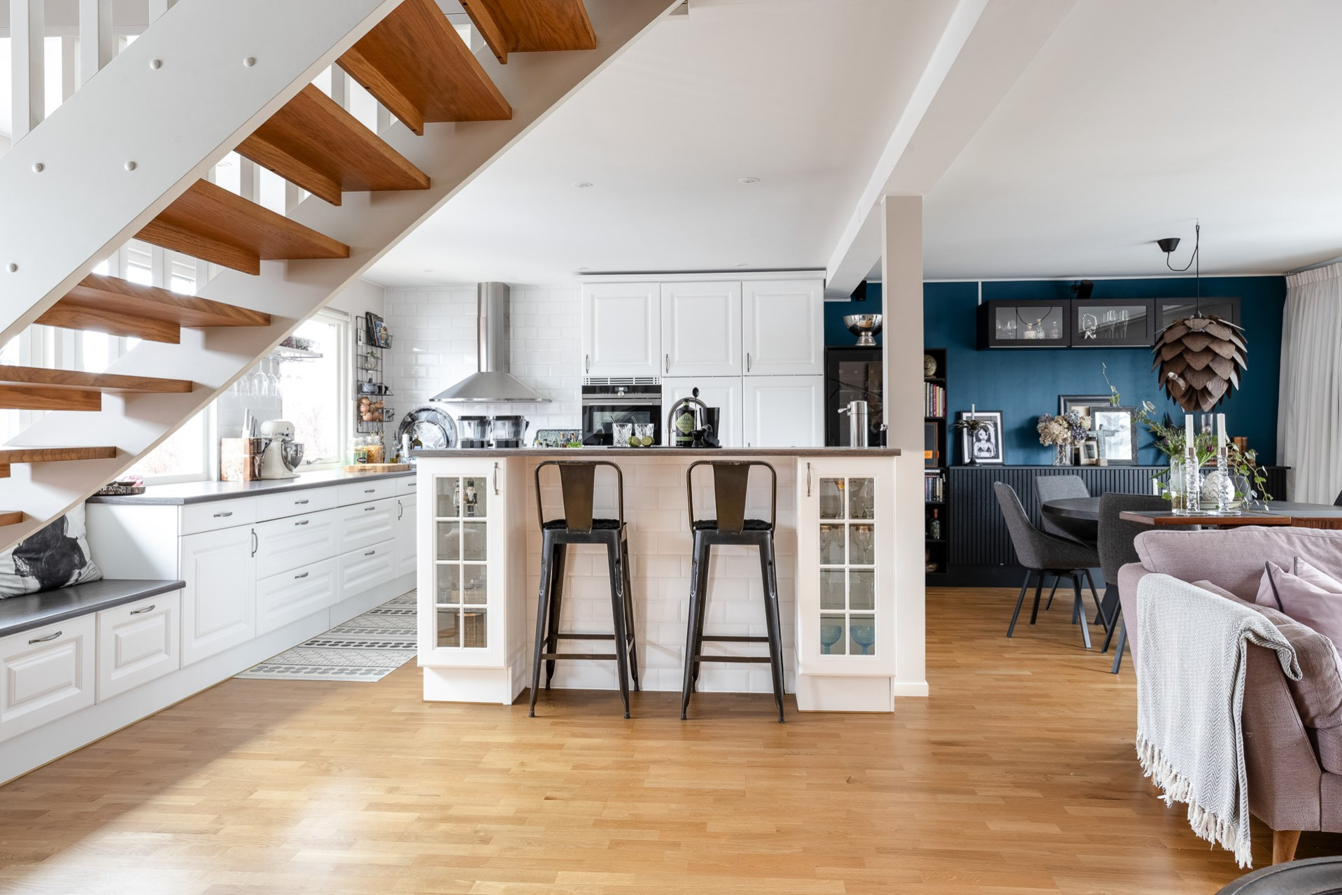 En stor renovering där vi tog bort en bärande vägg (enligt konstruktör och bygglov) 2015 till öppen planlösning. Takfläkten till köket byttes ut 2009. Köket har en mekaniskfrånluft ventilation och köksfläkten byttes ut när köket bytes ut, dvs 2015. Köket är från JKE. Dubbelugn finns då en av ugnarna är kombination micro och ugn.