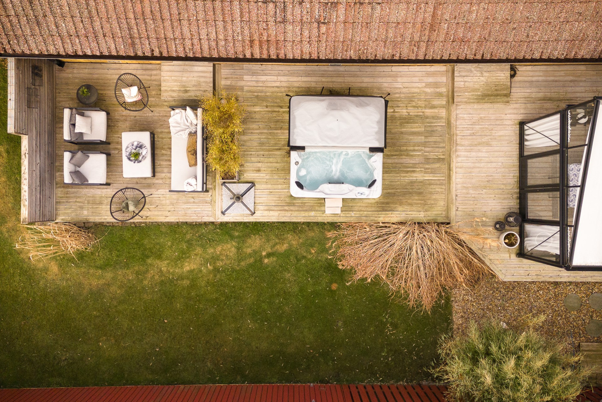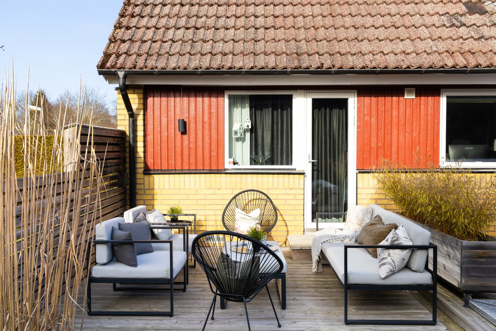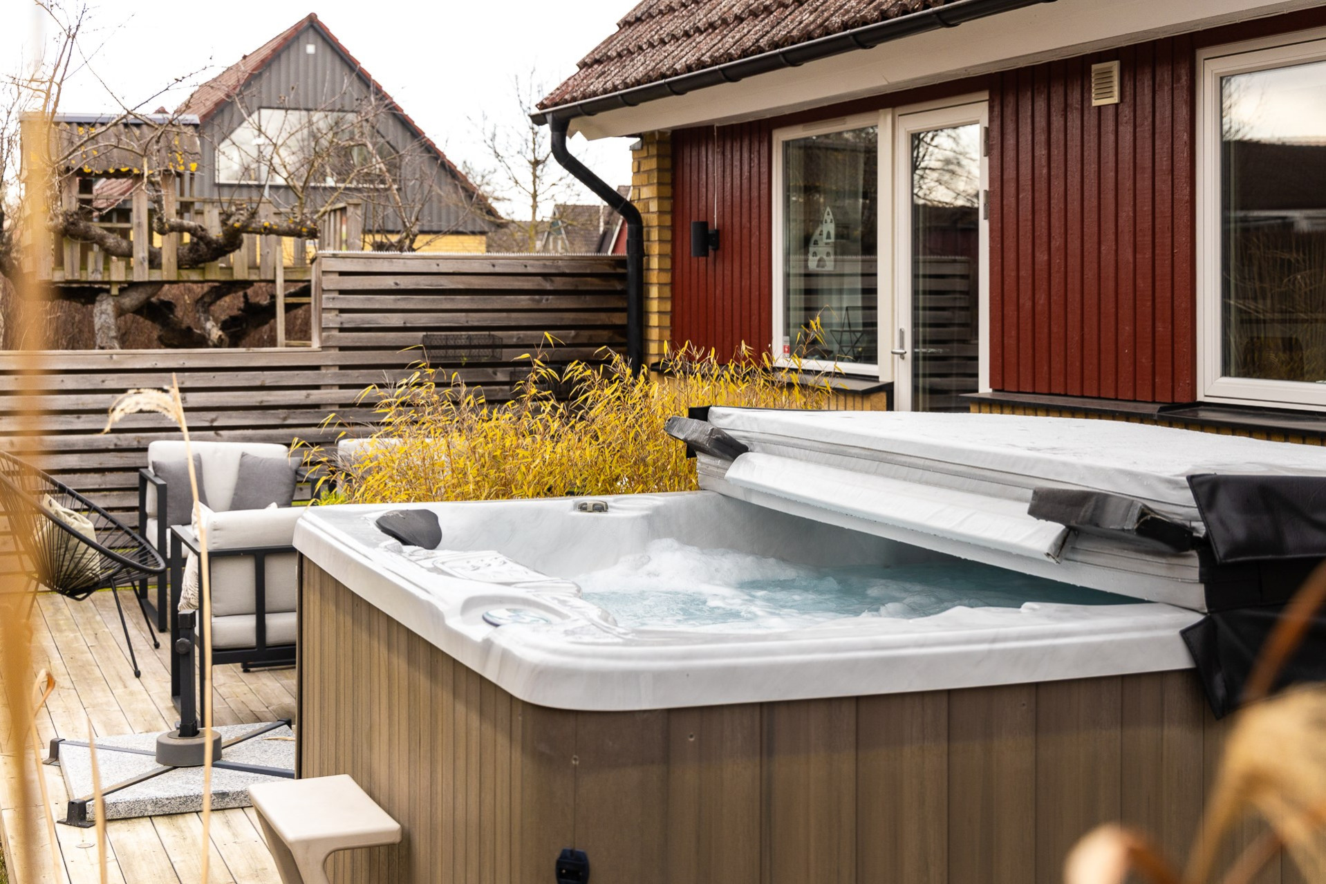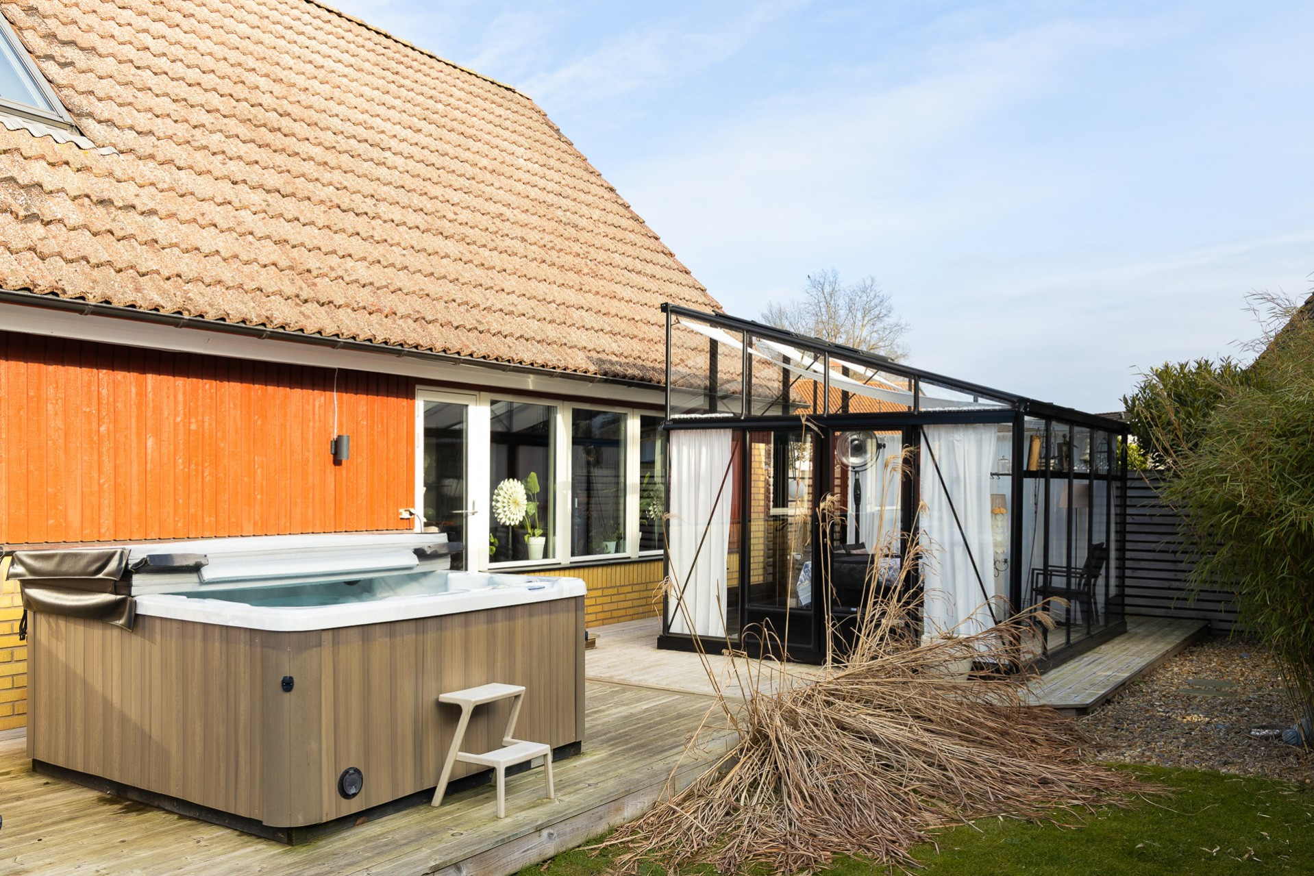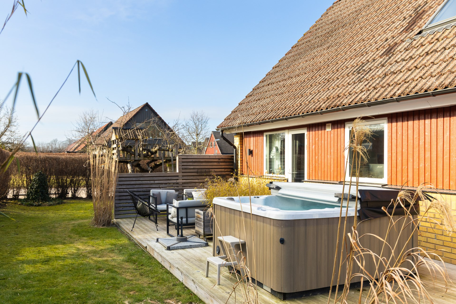 Vi har även dragit varmvatten till utsidan av huset för att nyttja till uteduschen. Byte av panel: 2007 med byte av 4 SP fönster på utsidan av huset. Spa från 2019. Orangeri från 2020. Orangeriet har framdragit el och det finns även el draget i trädgården vid sjöstenen bakom orangeriet och även i trädäcket, dock behöver spottarna bytas ut. Klinkergolv lades i bastun 2024 (ej golvvärme) och vi har även målat om väggar och tak. Panel på garaget och förrådet har bytts ut osäker på när dock, kan ha varit 2015. Porten till garaget byttes ut 2011 och garagefönster byttes ut 2015. All utebelysning byttes ut 2021.