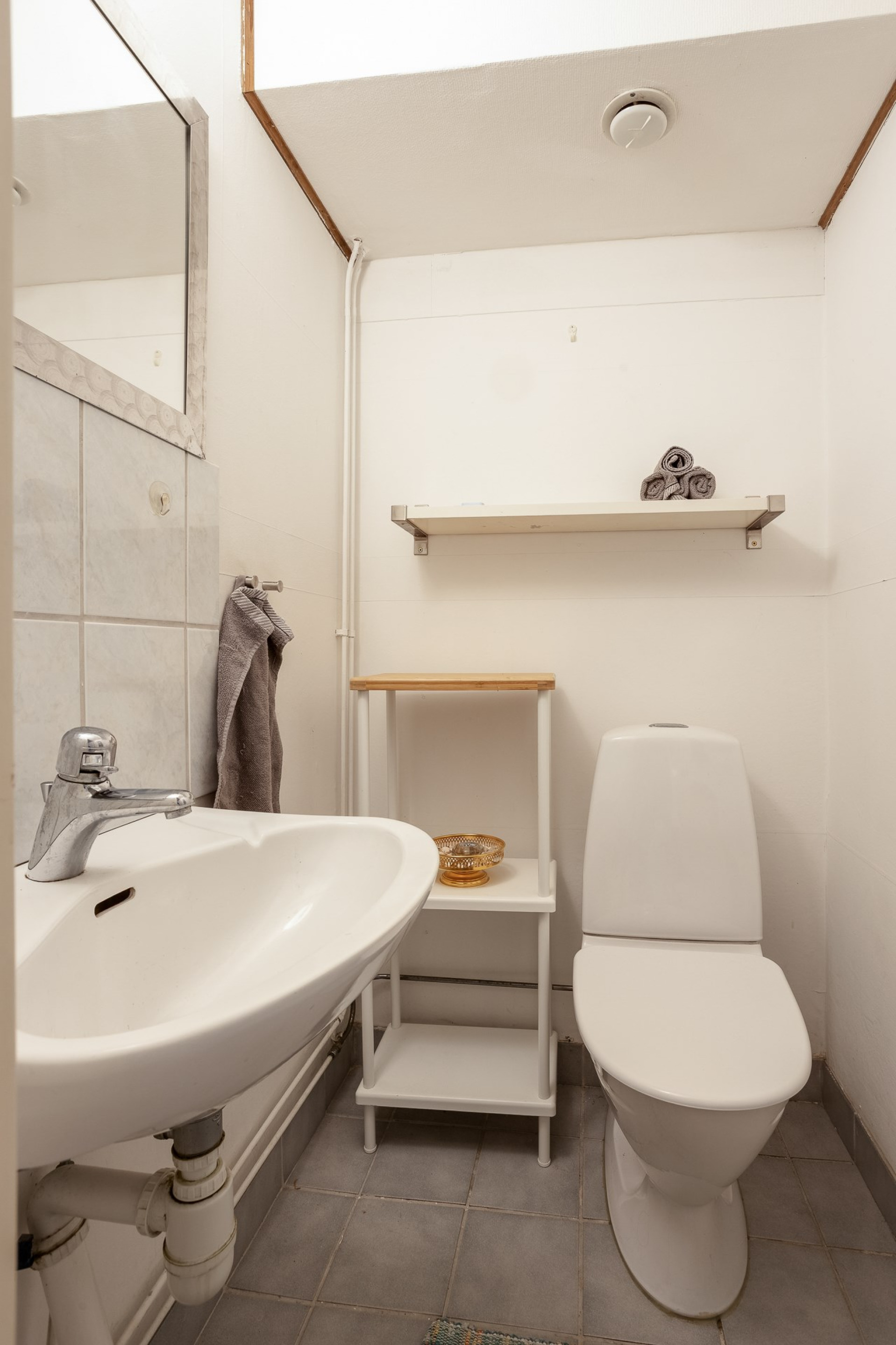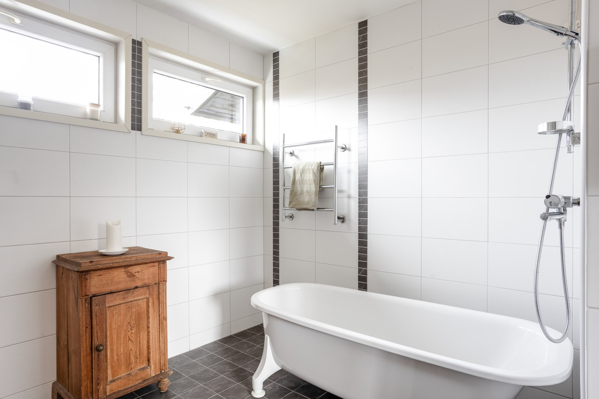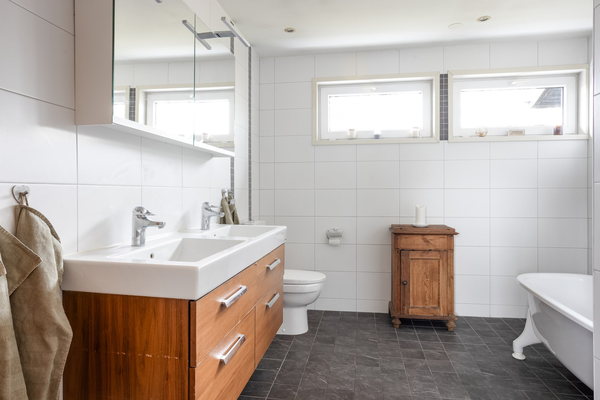 Badrummet har ett tidlöst uttryck med klassisk grå klinker på golv samt större vita kakelplattor på väggarna. Rummet är generöst till sin storlek och erbjuder dubbelkommod, spegelskåp, badkar, toalett och handdukstork. Två fönster för bra ljusinsläpp samt vädringsmöjlighet.