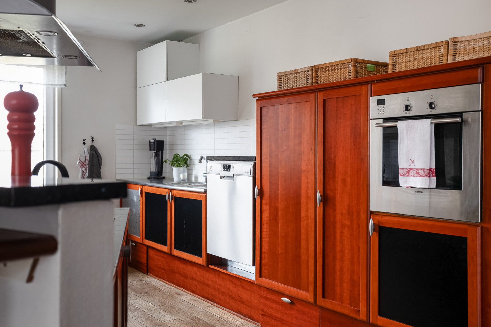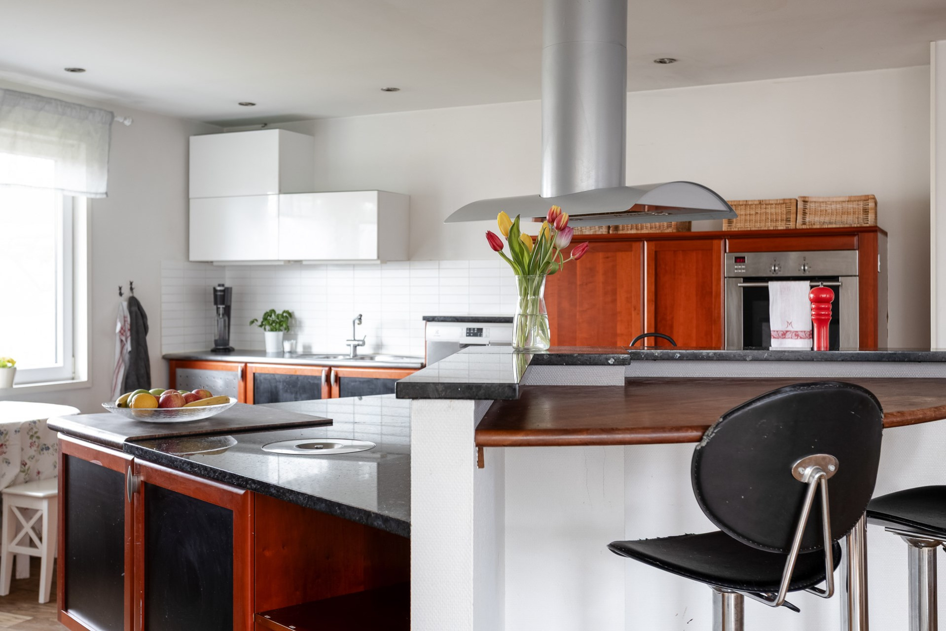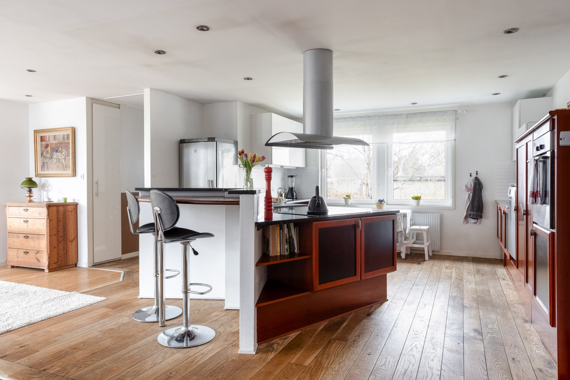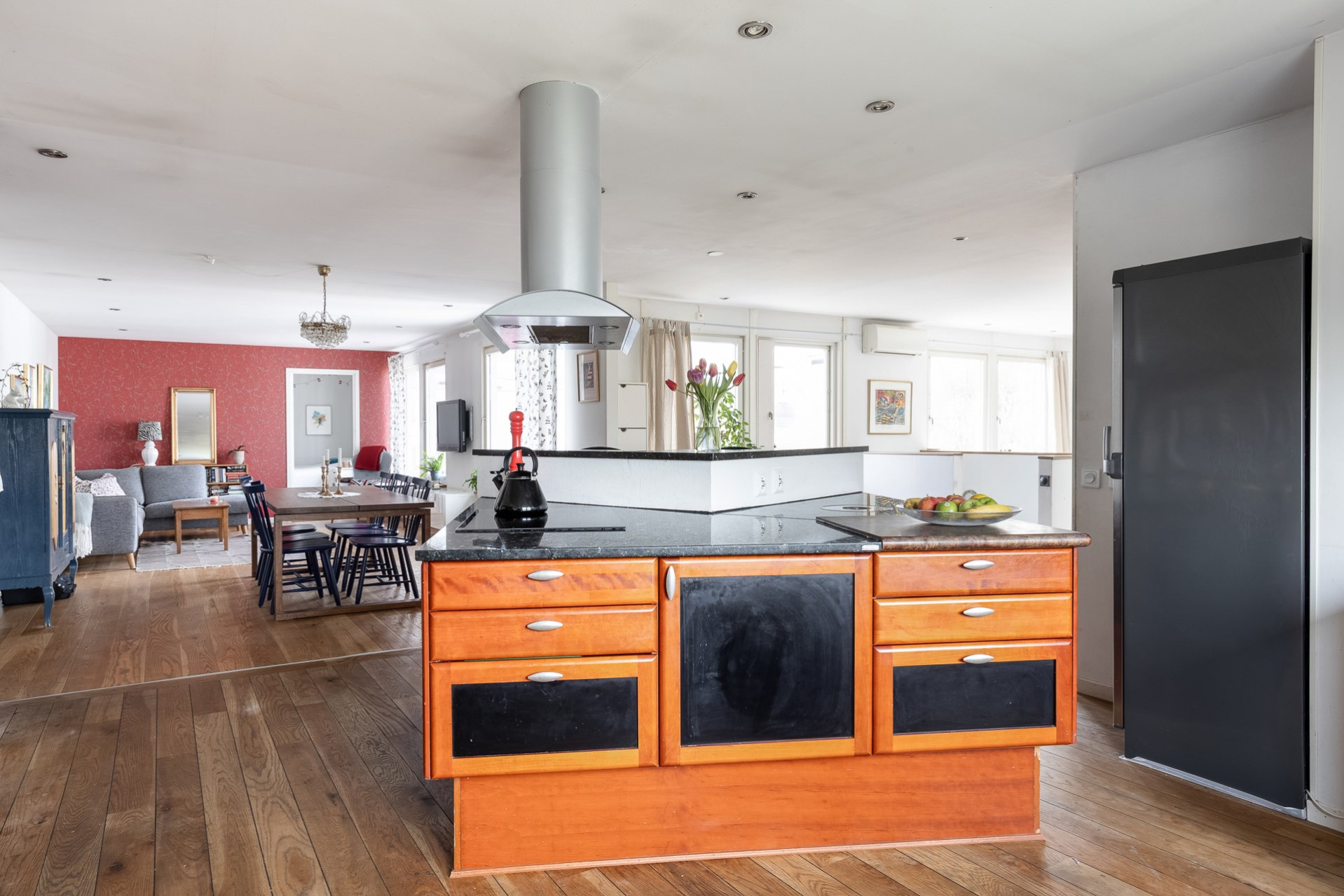 Ett stort och mycket karaktärsfullt kök. Här möts du av körsbärsröda köksluckor i hög kvalitet, gedigna granitbänkskivor och ett vackert 1-stavsgolv. Det genomtänkta snickeriet kompletteras av detaljer som infällda skärbrädor och praktiska sockellådor som utnyttjar varje centimeter på bästa sätt. Tack vare den höga materialkvaliteten finns säkerligen goda möjligheter att enkelt ge köket ett nytt uttryck genom att låta omlackera luckorna vid behov. Den snedställda köksön blir ett tydligt blickfång och rymmer två barstolar för social matlagning. Här finns även en mindre matplats för fyra personer invid kökets två stora fönster. Maskinparken består av spishäll, ugn, fläkt, diskmaskin samt en mindre kyl och en stor frys.