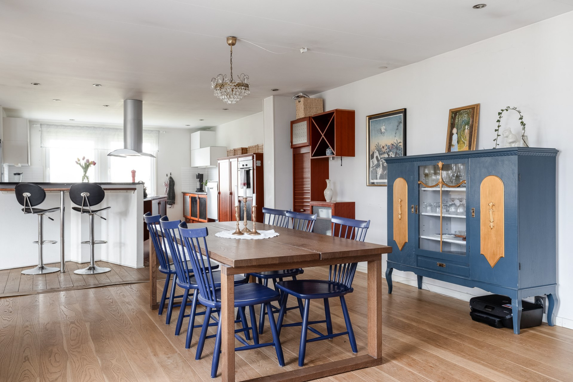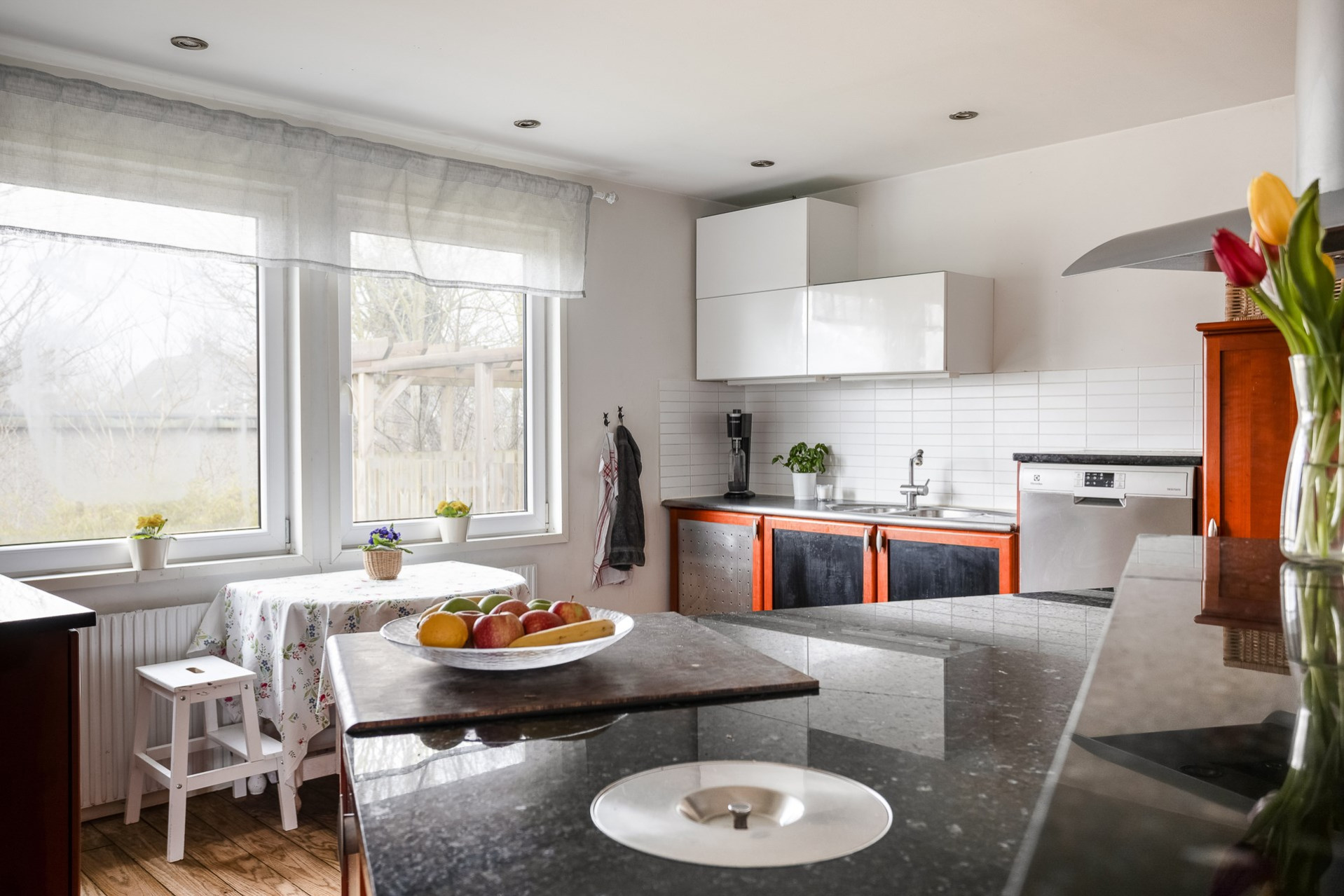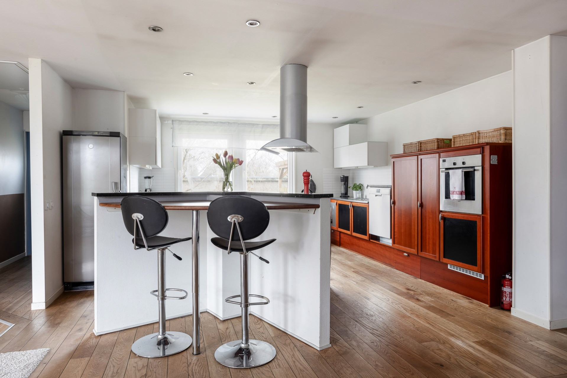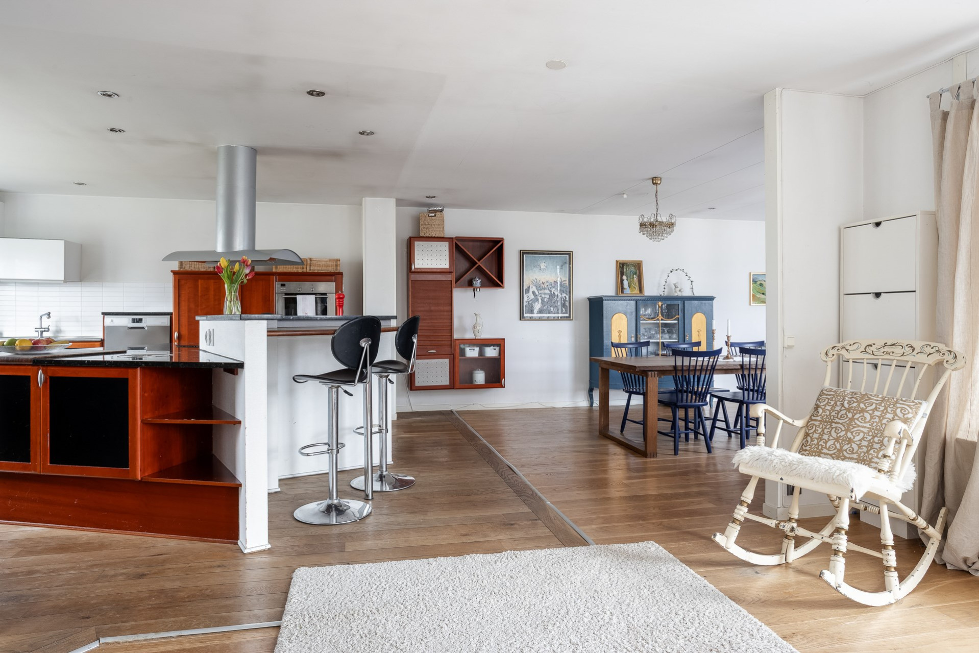 Ett stort och mycket karaktärsfullt kök. Här möts du av körsbärsröda köksluckor i hög kvalitet, gedigna granitbänkskivor och ett vackert 1-stavsgolv. Det genomtänkta snickeriet kompletteras av detaljer som infällda skärbrädor och praktiska sockellådor som utnyttjar varje centimeter på bästa sätt. Tack vare den höga materialkvaliteten finns säkerligen goda möjligheter att enkelt ge köket ett nytt uttryck genom att låta omlackera luckorna vid behov. Den snedställda köksön blir ett tydligt blickfång och rymmer två barstolar för social matlagning. Här finns även en mindre matplats för fyra personer invid kökets två stora fönster. Maskinparken består av spishäll, ugn, fläkt, diskmaskin samt en mindre kyl och en stor frys.