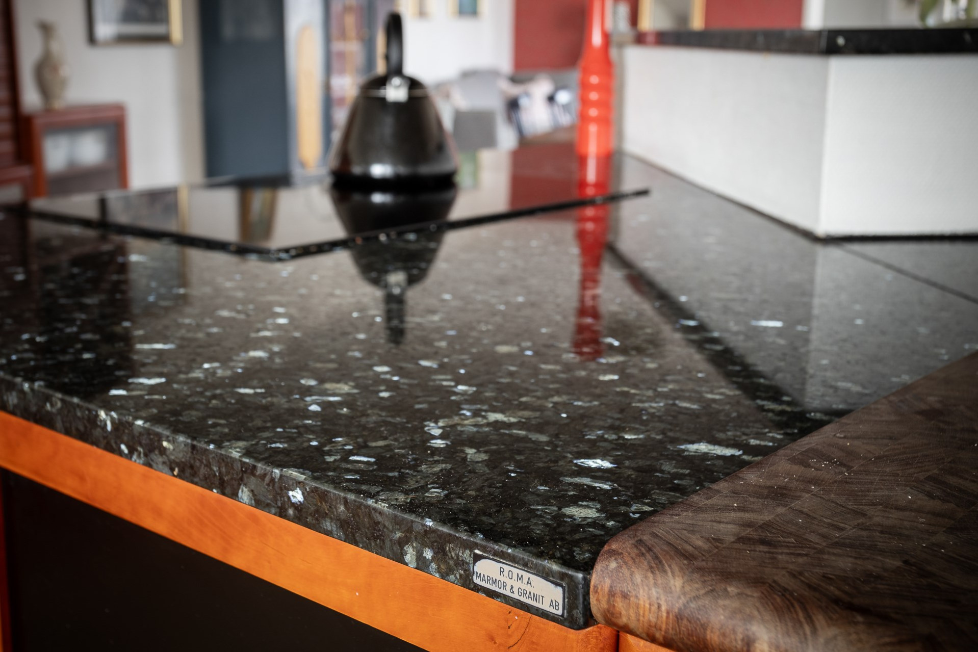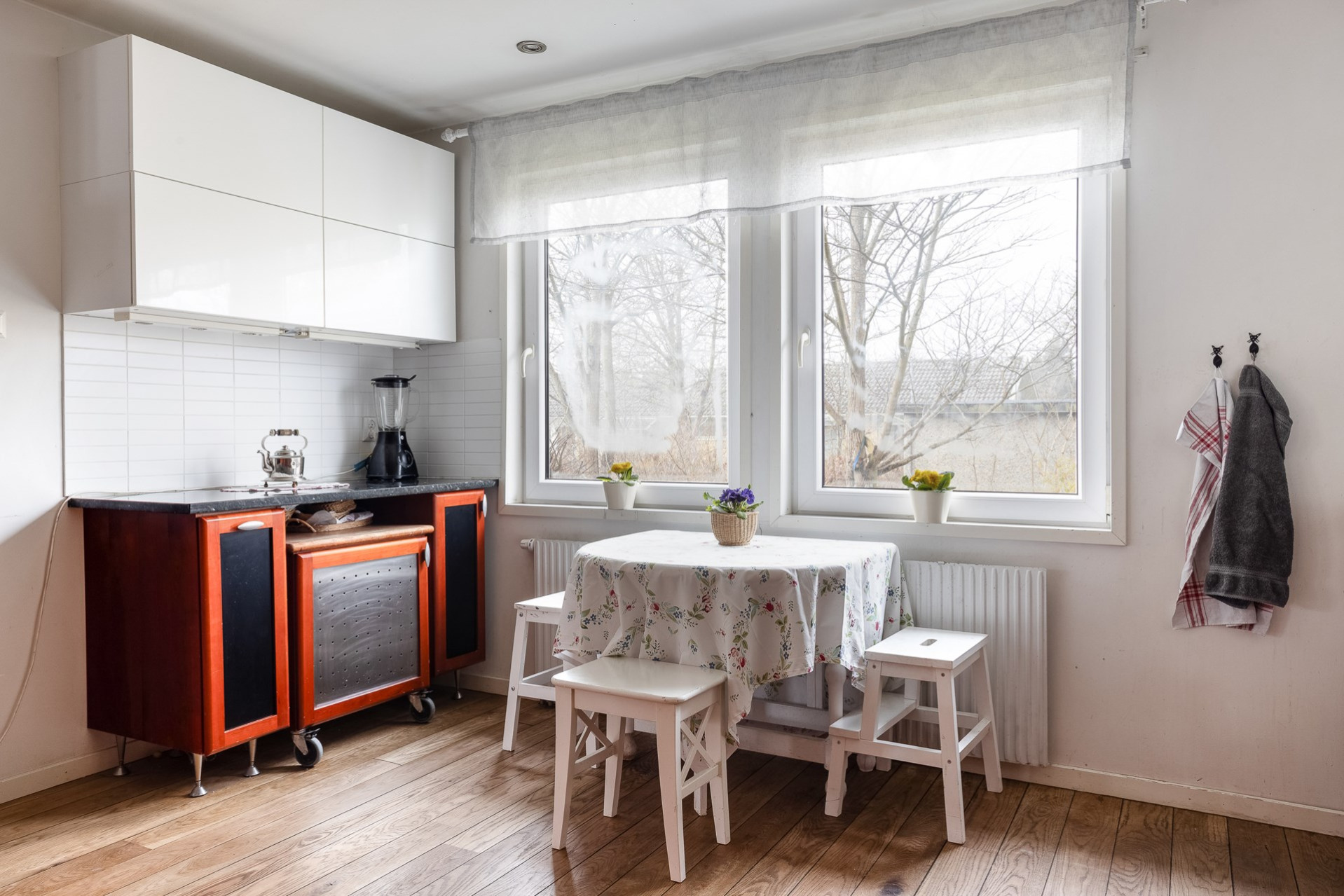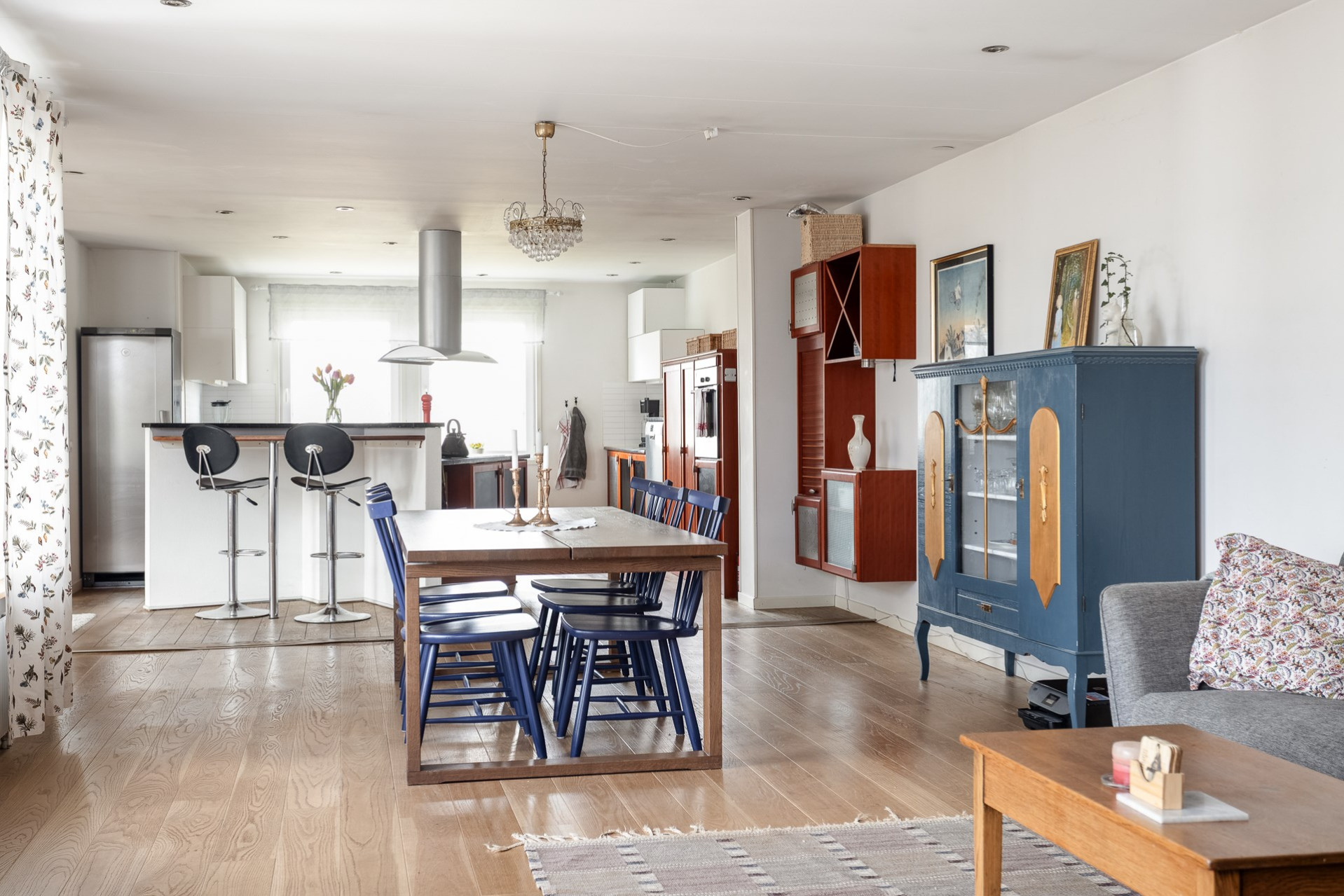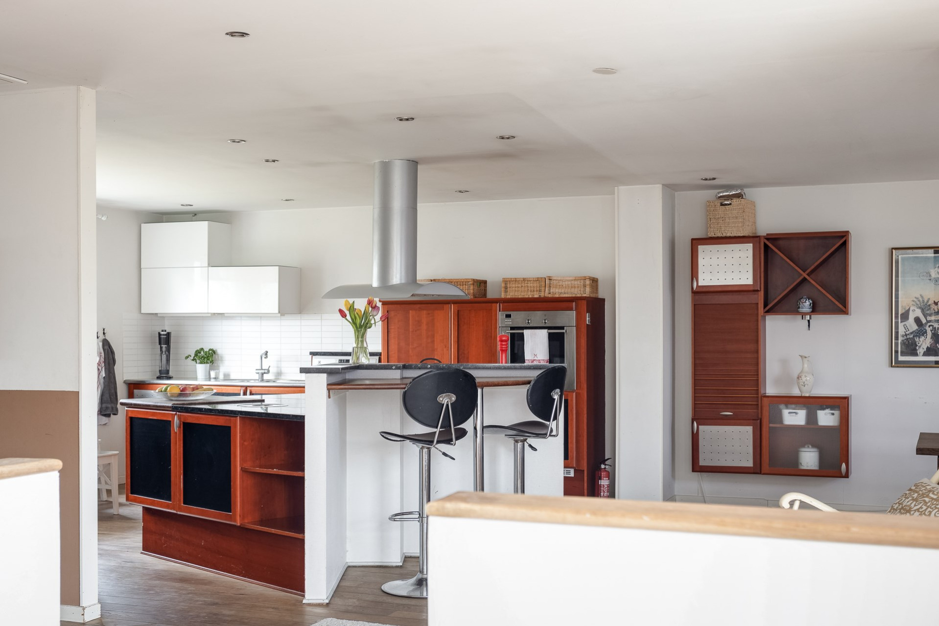 Ett stort och mycket karaktärsfullt kök. Här möts du av körsbärsröda köksluckor i hög kvalitet, gedigna granitbänkskivor och ett vackert 1-stavsgolv. Det genomtänkta snickeriet kompletteras av detaljer som infällda skärbrädor och praktiska sockellådor som utnyttjar varje centimeter på bästa sätt. Tack vare den höga materialkvaliteten finns säkerligen goda möjligheter att enkelt ge köket ett nytt uttryck genom att låta omlackera luckorna vid behov. Den snedställda köksön blir ett tydligt blickfång och rymmer två barstolar för social matlagning. Här finns även en mindre matplats för fyra personer invid kökets två stora fönster. Maskinparken består av spishäll, ugn, fläkt, diskmaskin samt en mindre kyl och en stor frys.