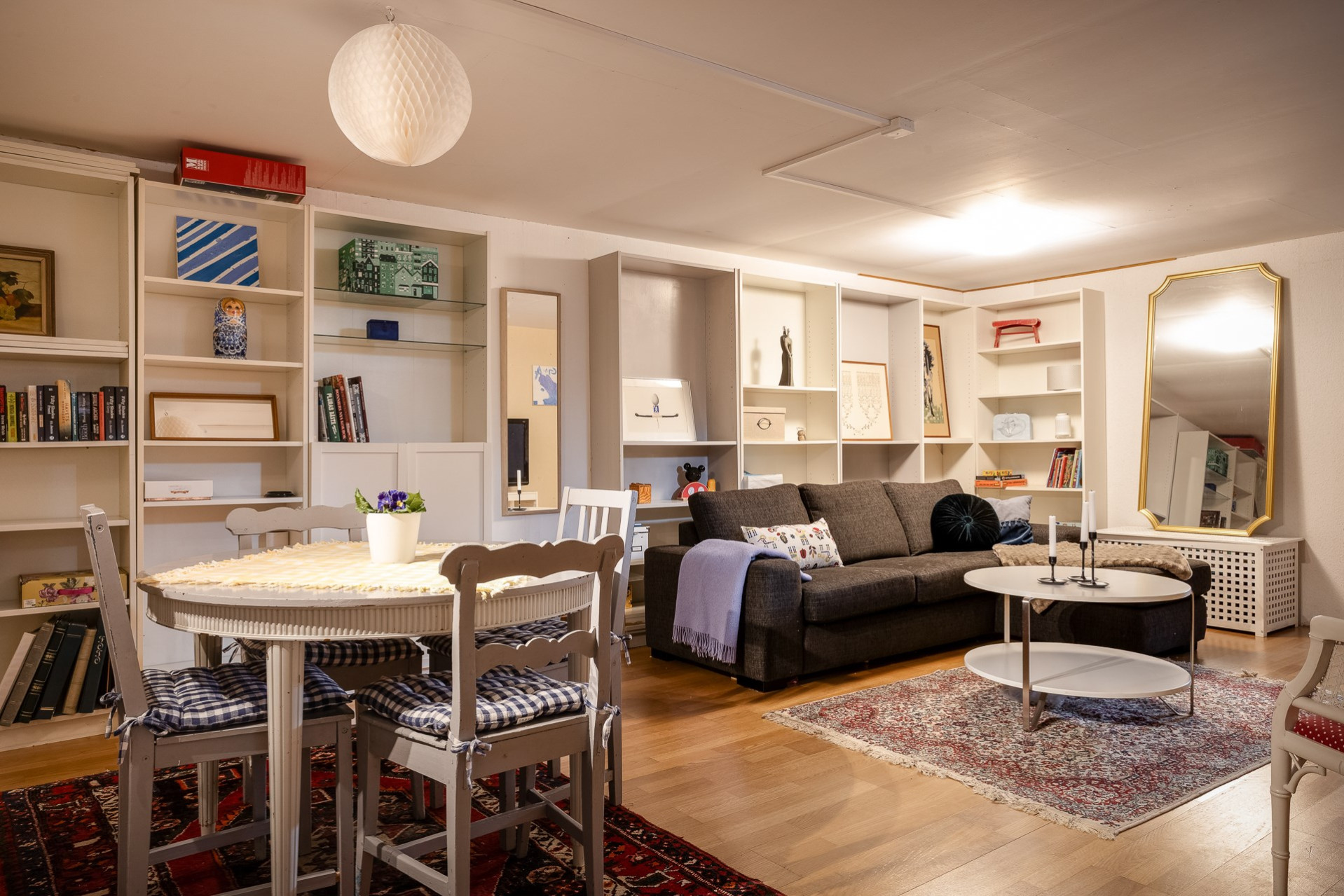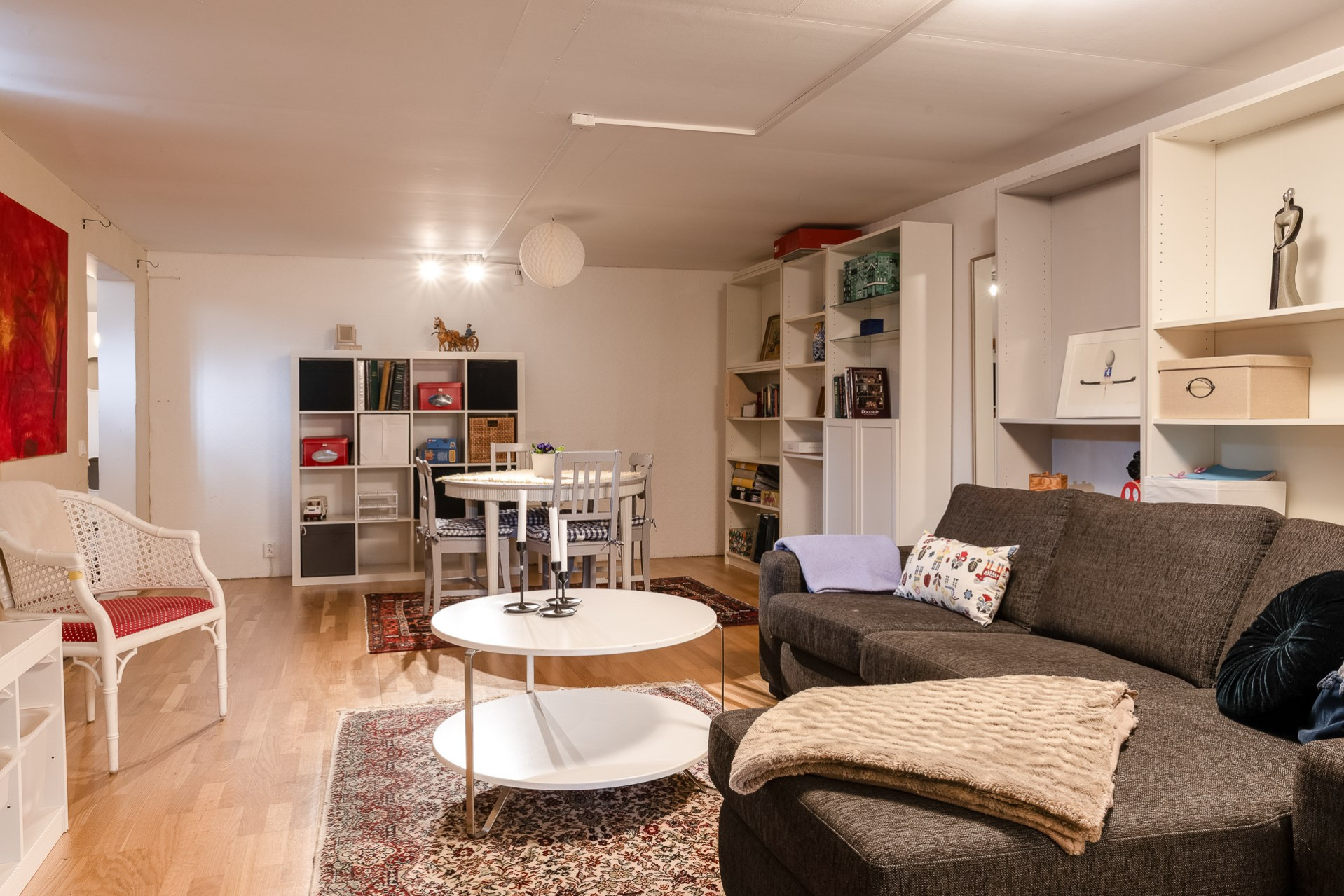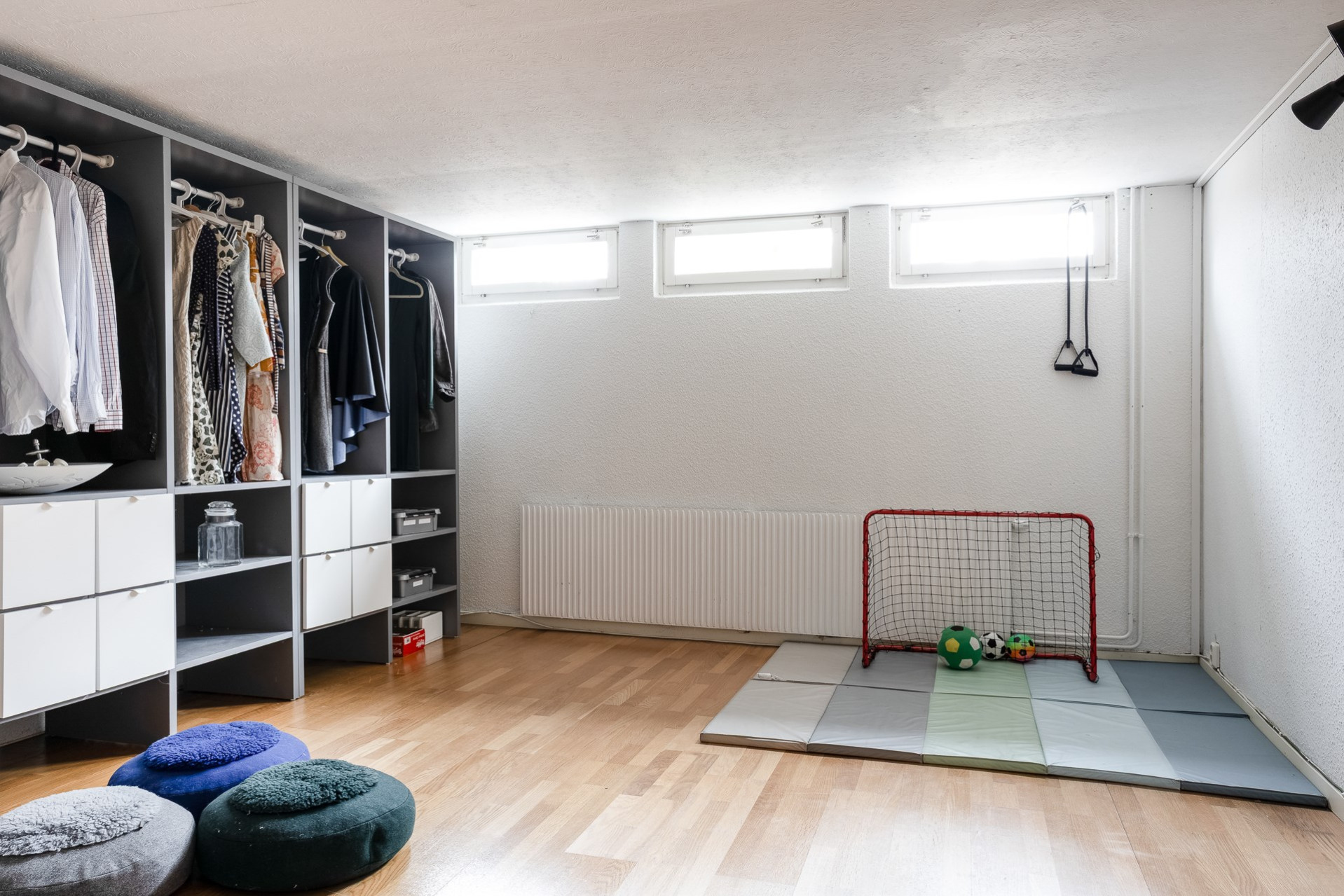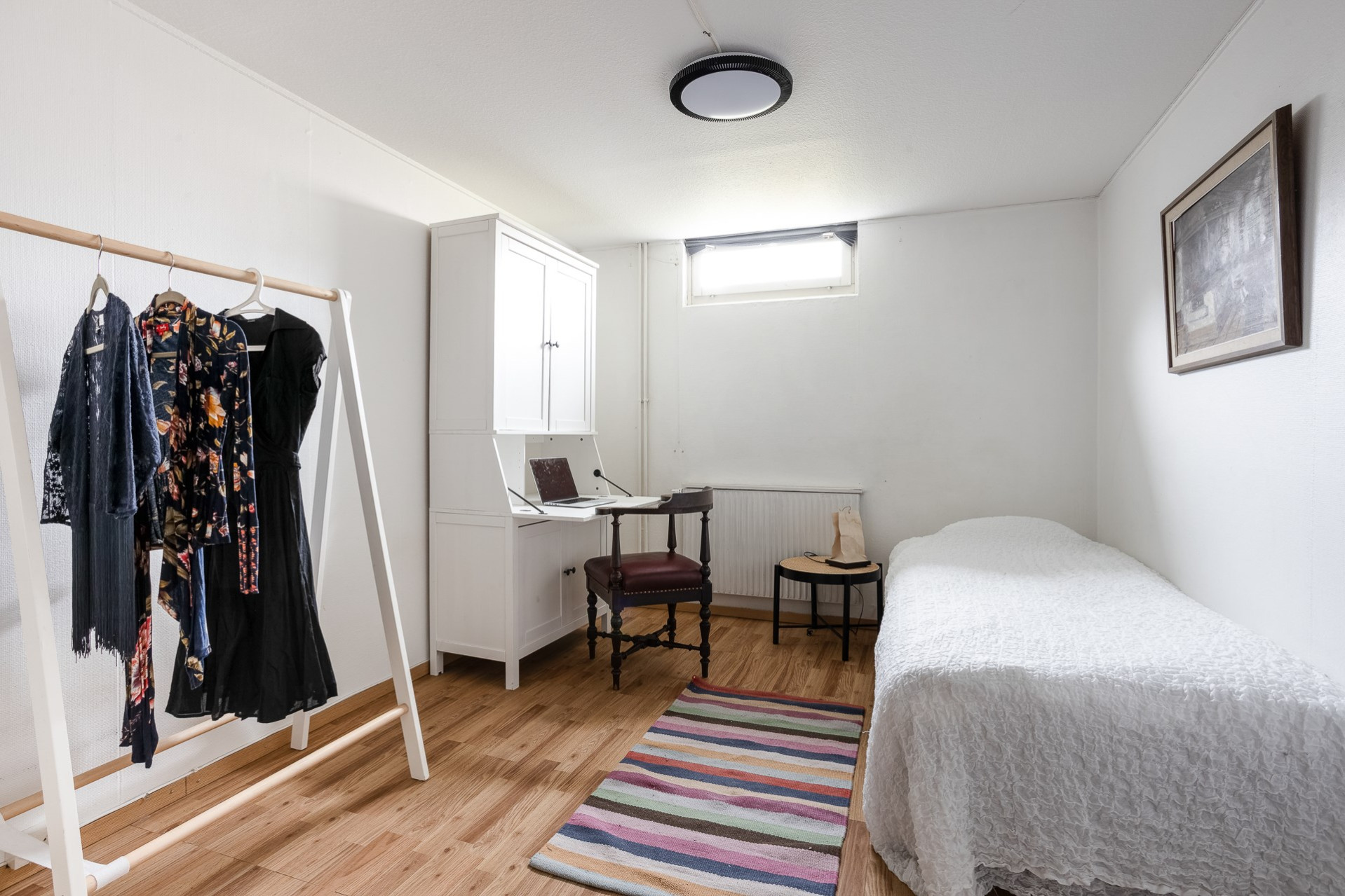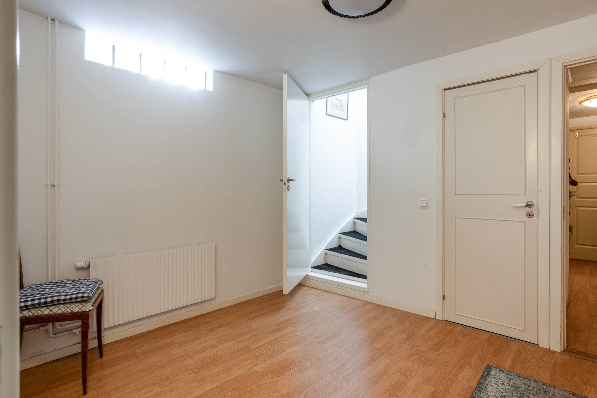 Källaren erbjuder ett helt extra våningsplan med fina ytor. Här nere finns ett stort allrum med ekparkett samt ett intilliggande sovrum med samma golv och god förvaring i form av flera garderober. Vidare finns även ett mindre gästrum eller kontor med ljusa väggar och parkettgolv.