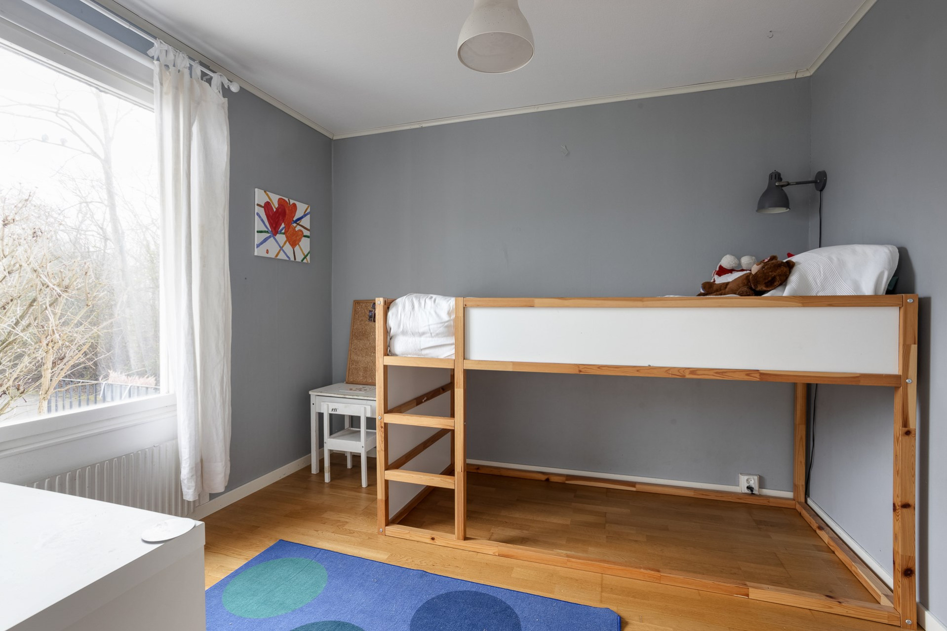 Sovrum i mindre storlek som fungerar alldeles utmärkt till barnrum, kontor eller gästrum. Ekparkett på golv samt gråa väggar.