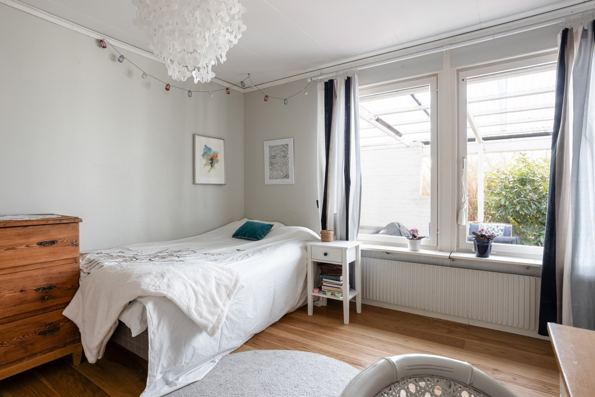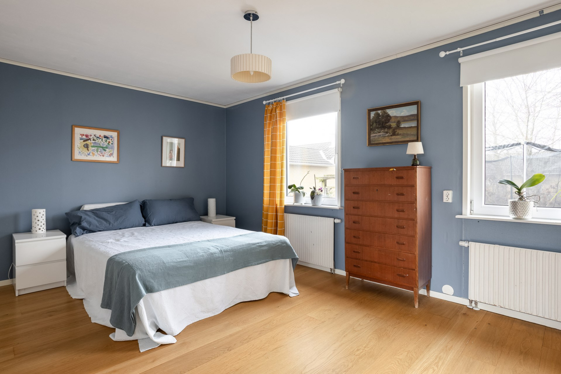 Ett riktigt stort sovrum som en gång i tiden var två. Rummet vetter mot husets framsida och erbjuder plats för flera stora möbler. Längs med ena väggen finner vi även här en enorm garderobslösning.