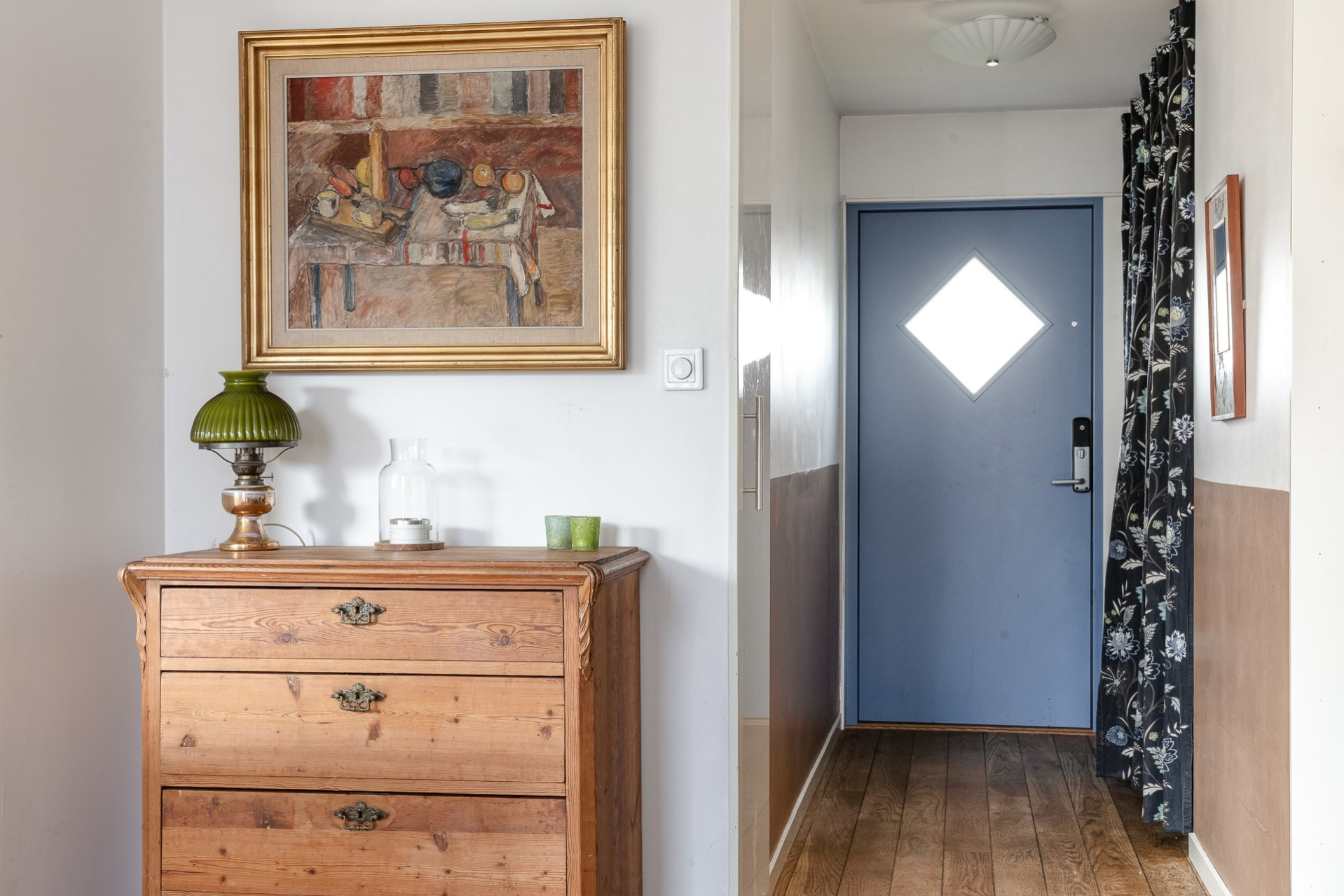 Långsmal hall med avhängning direkt till vänster eller genom en garderob längre ned i hallen. På golvet vilar en mörkare 1-stavsparkett som även är genomgående i de stora sociala ytorna.