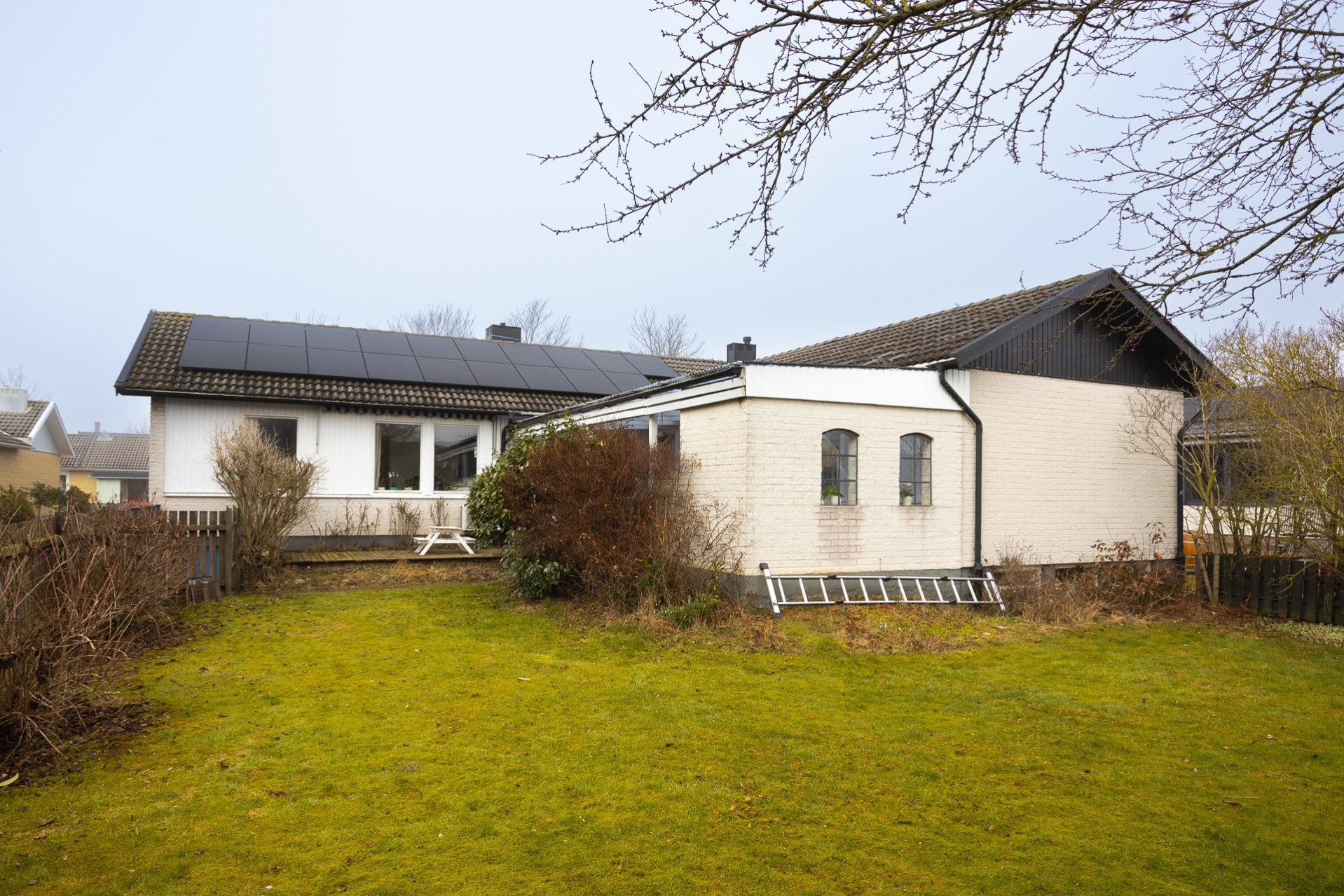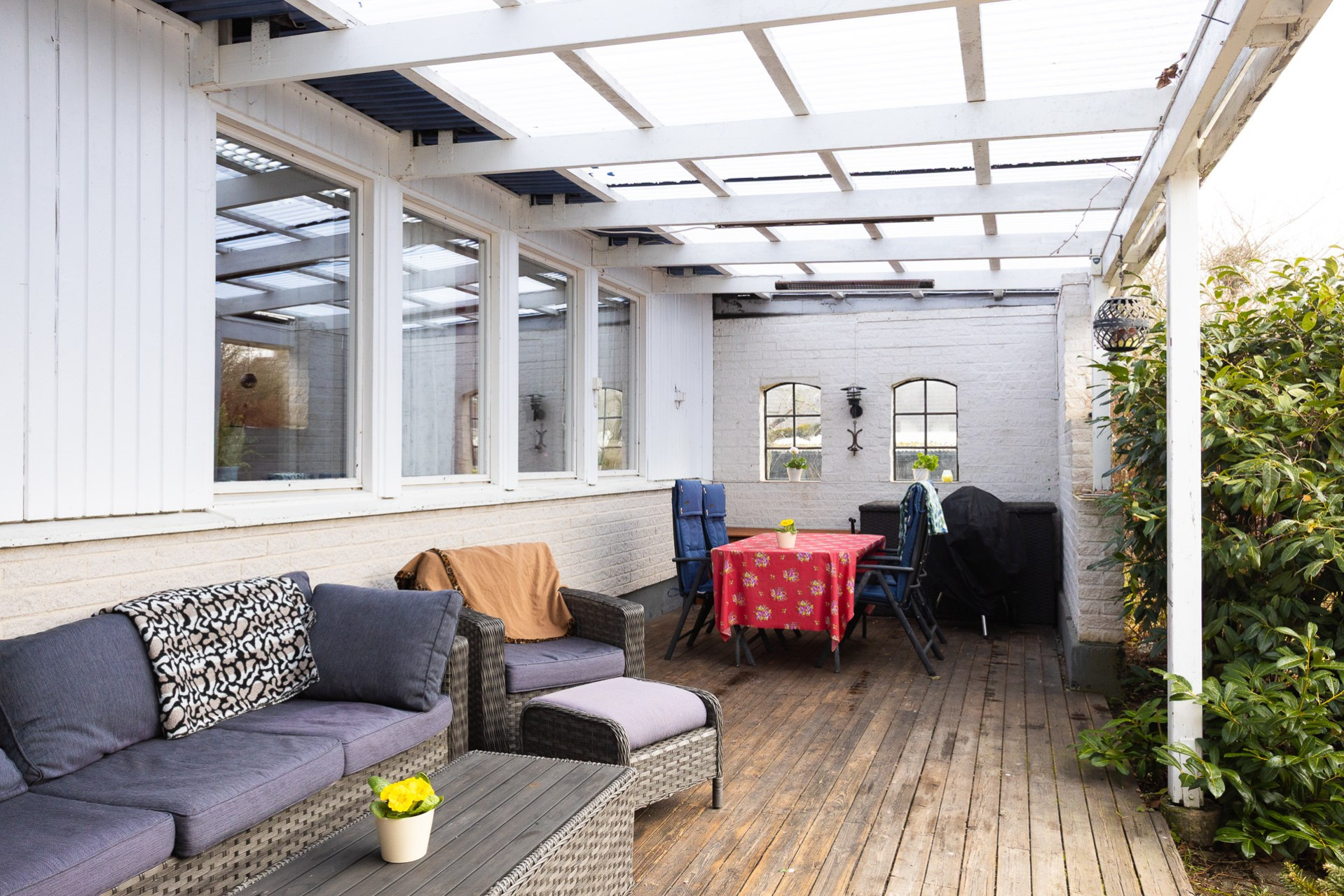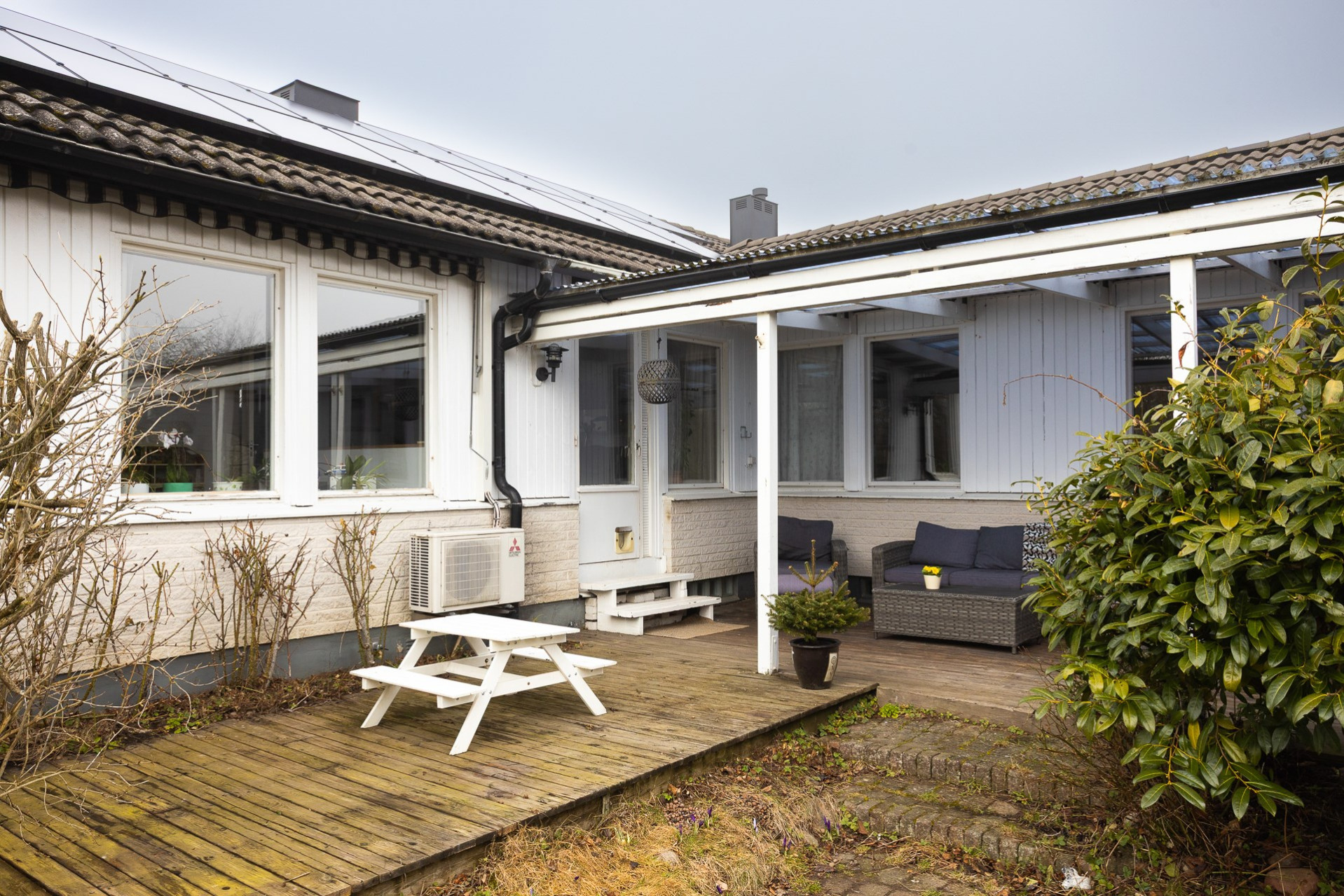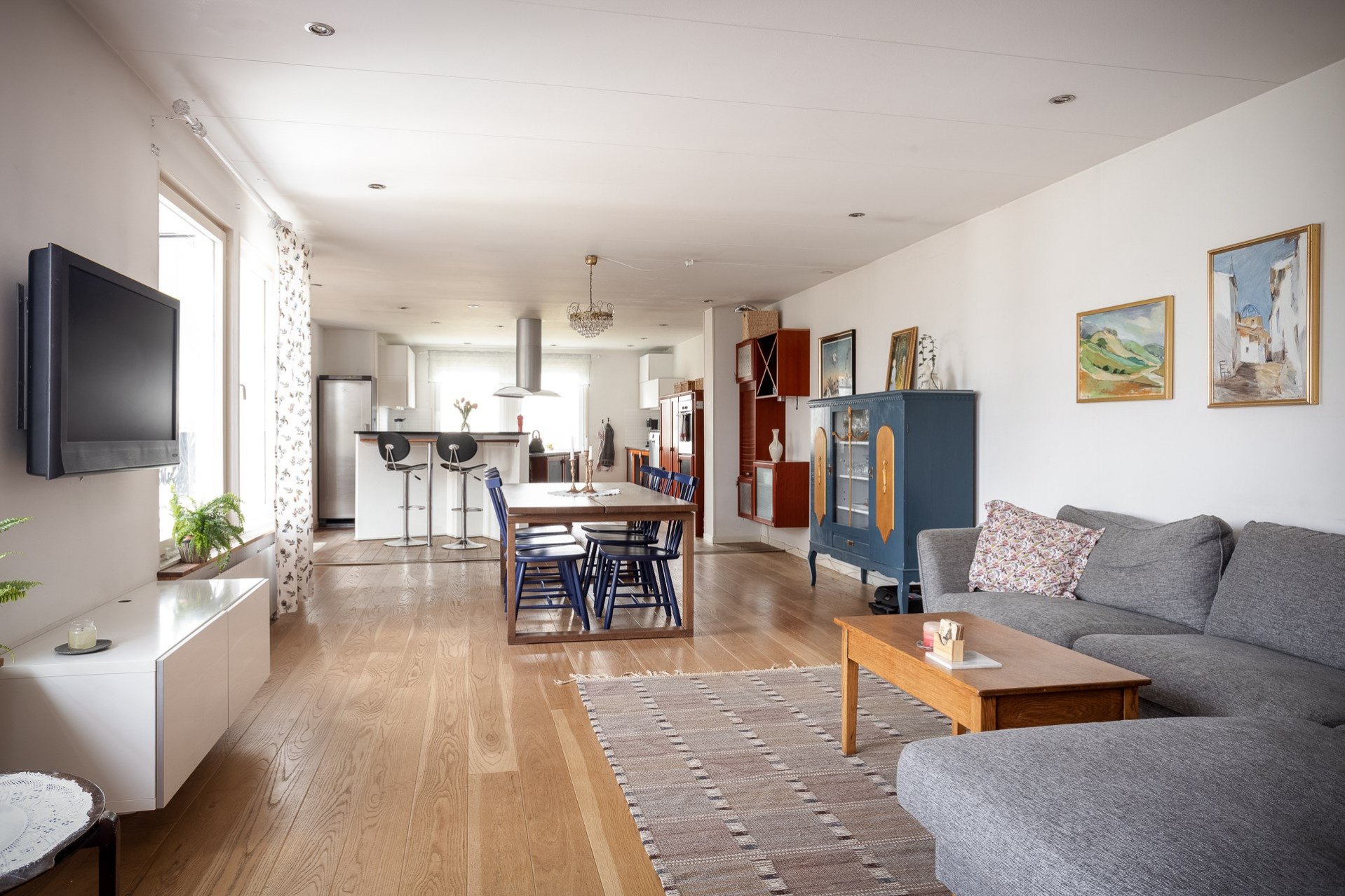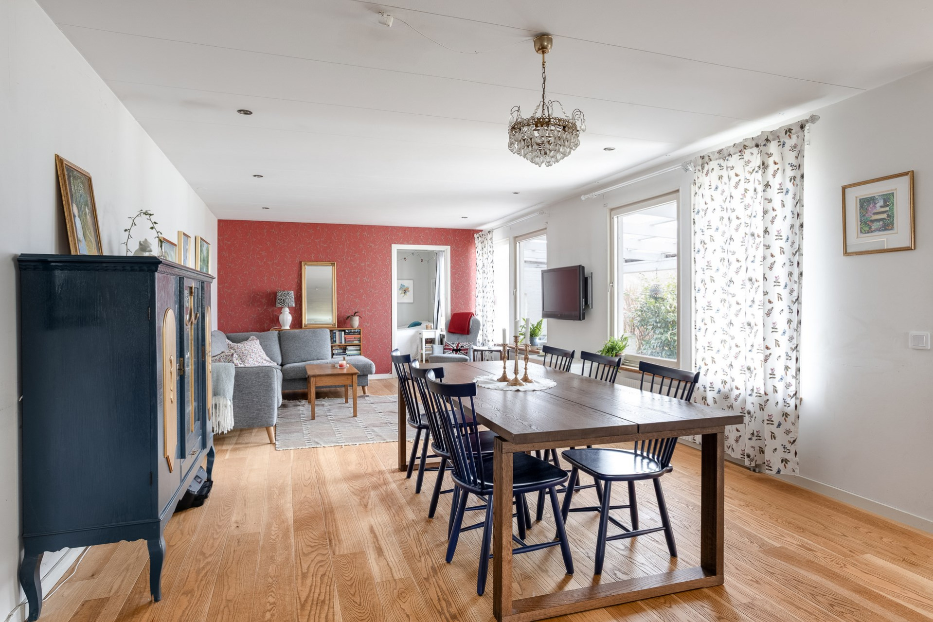 Ett stort och inbjudande vardagsrum med flera stora fönsterpartier mot bostadens trädgårdsbaksida. Här finns flera möbleringsalternativ som rymmer den stora familjesoffan men också det stora matsalsbordet utan problem.