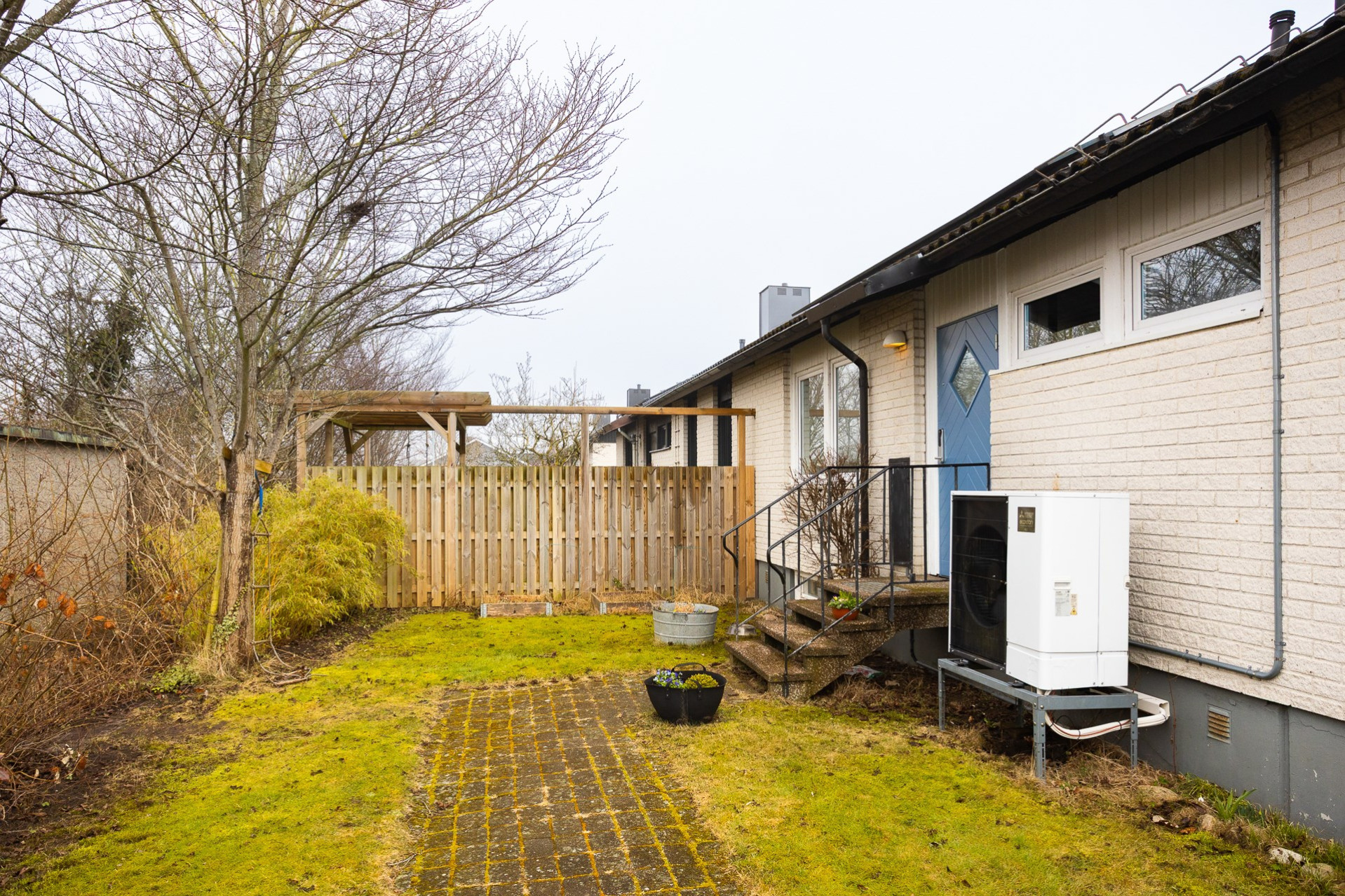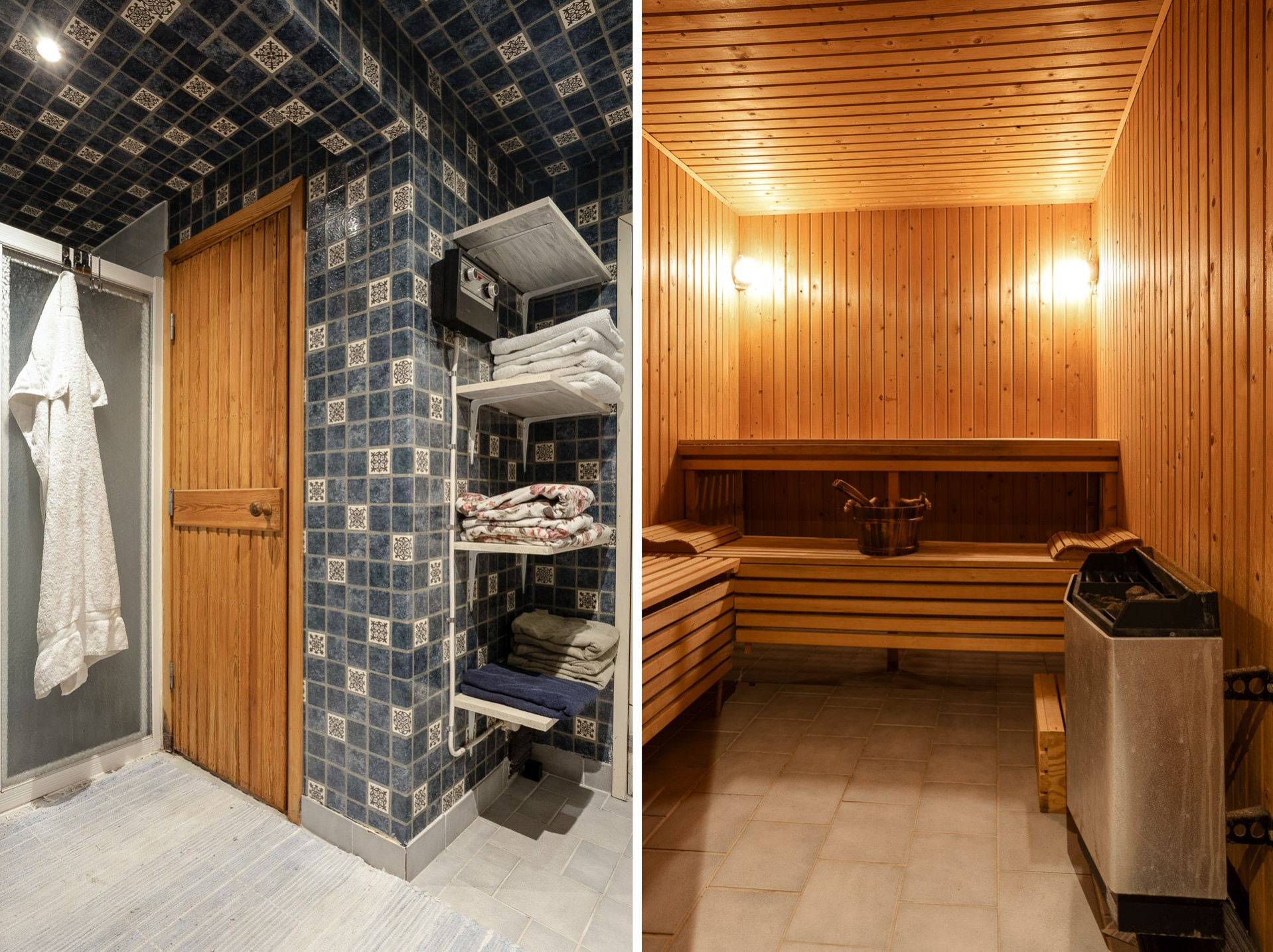Duschutrymmet är klätt i blåmönstrad våtrumstapet och rymmer både en generös bastu och ett separat torkrum. Intill ligger en fräsch toalett med klinkergolv. Tvättstugan är funktionell med dubbla tvättmaskiner, torktumlare och vask, även om den kan må bra av viss uppfräschning. Här finns också ett praktiskt pannrum samt ett mycket stort hobbyrum/verkstad med egen ingång från trädgårdens baksida.