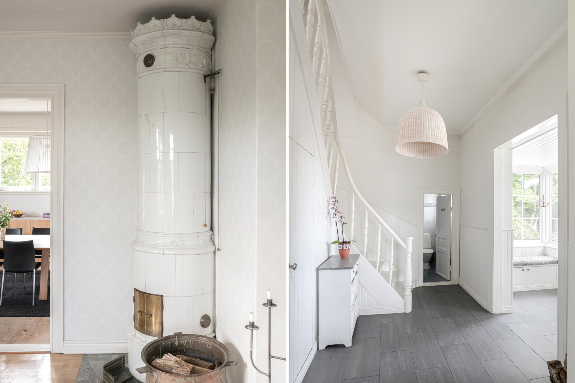 Genom den vackra entrén kommer man in i verandan där det finns en platsbyggd sittbänk och avhängningsmöjligheter. Mer förvaring i form av garderober finns snyggt gömt under trappan. Värmegolv med klinkers och väggarna är vitmålade.