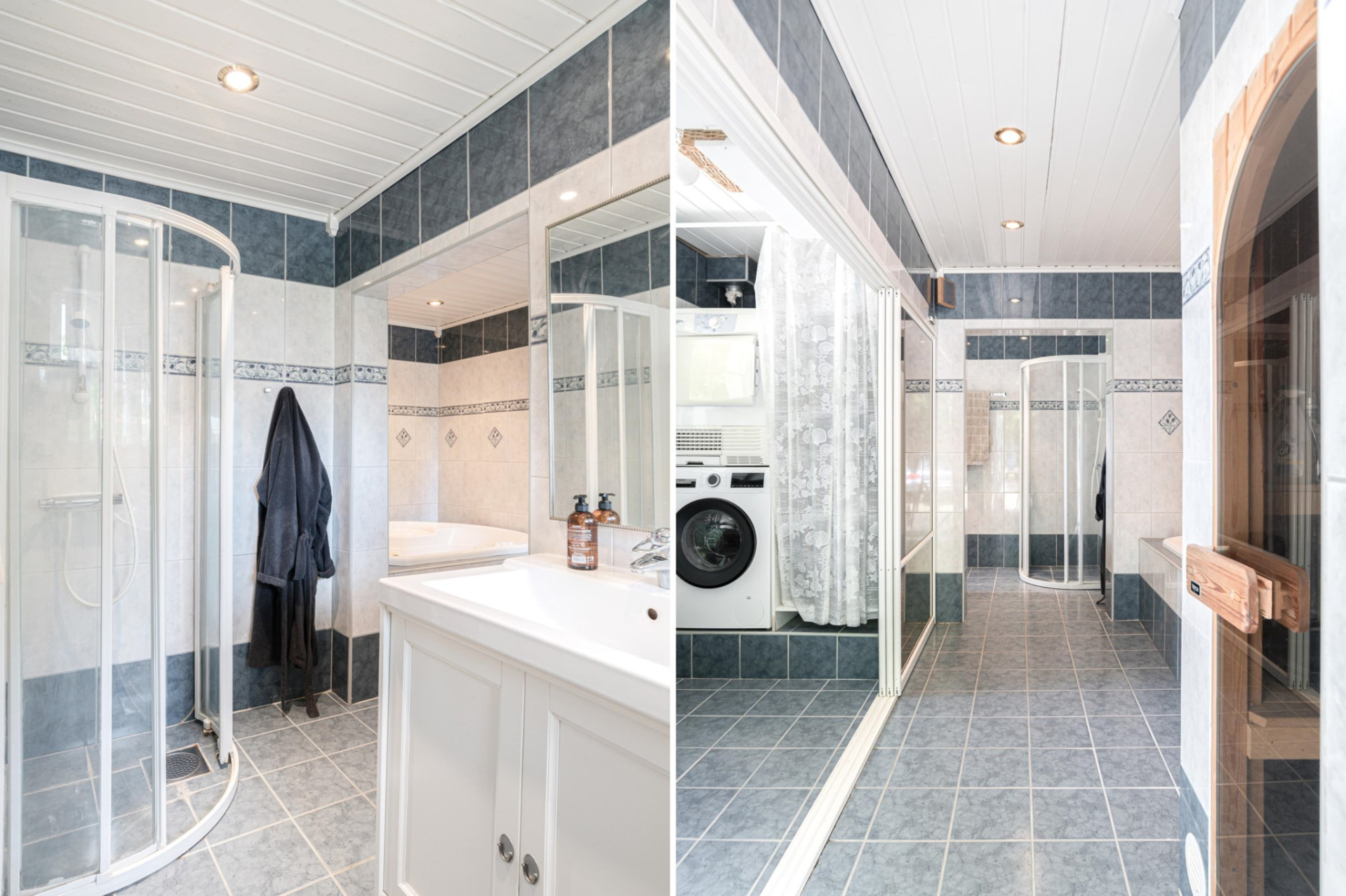 Från hallen, direkt till höger har ni ett badrum som är helkaklat i blåa och vita toner med behaglig belysning av infällda spotlights i taket. Här finns handfat, toalett, badrumsskåp, dusch, bubbel badkar och en bastu (aggregatet är av men finns att sätta dit). Ni finner även en tvättstuga här med tvättmaskin (Bosch 2023) och torktumlare (Whirlpool 2011).