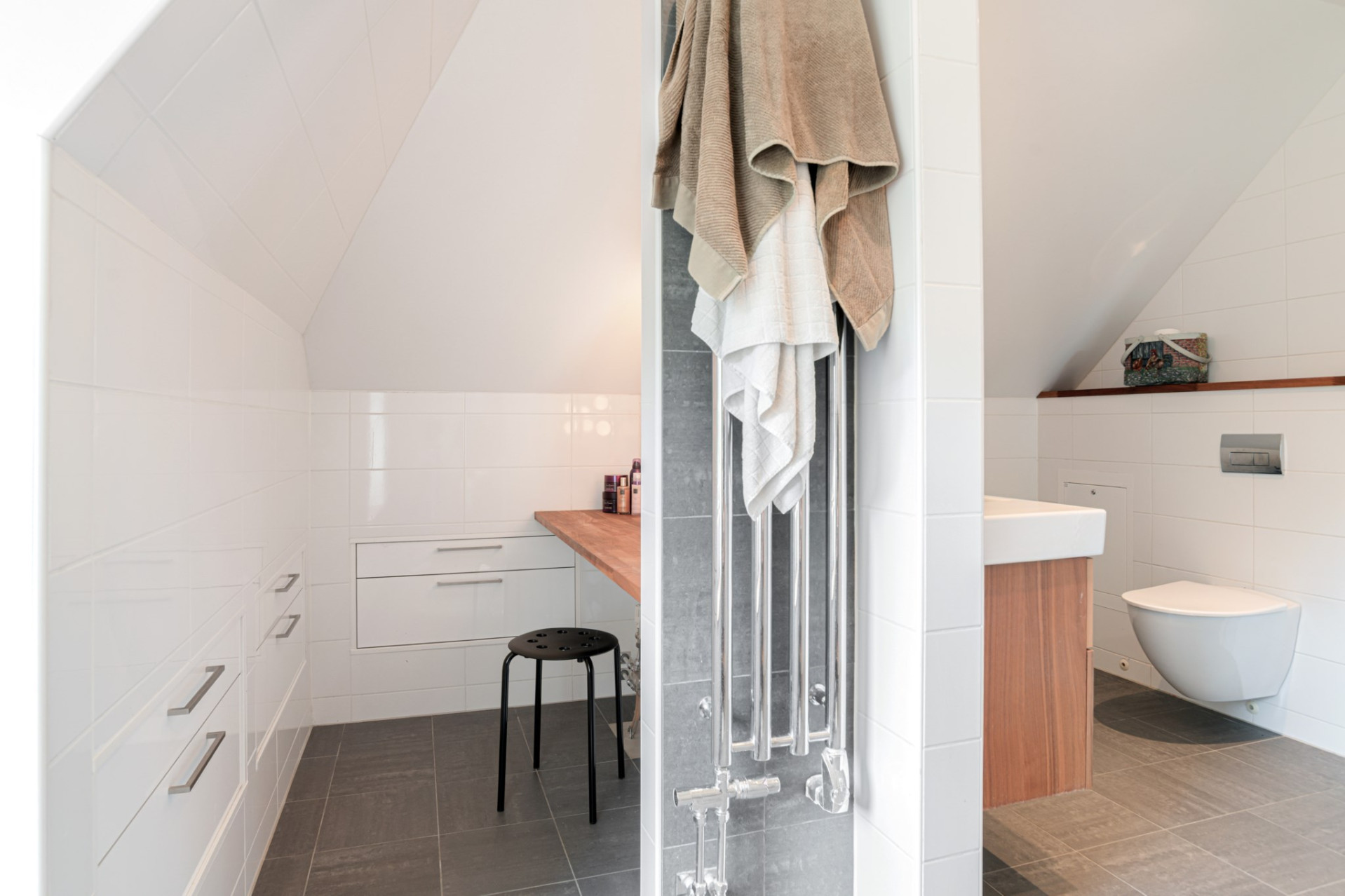 Från hallen vid den stora entrén når ni andra delen av ovanvåningen. Väl ovanför den pampiga vackra trä trappan erbjuds det bra med förvaring i flertal garderober. Direkt till höger har ni ovanvåningens badrum som är stilrent och modernt, totalrenoverat i vitt kakel, grått klinkers och tik trädetaljer. Badrummet är utrustat med toalett, handfat med kommod och dusch samt en perfekt sitt plats för den som uppskattar att få plats med allt smink och hudvård. De finns även en mysig liten platsbyggd bänk vid fönstret att sitta vid, otroligt charmigt!