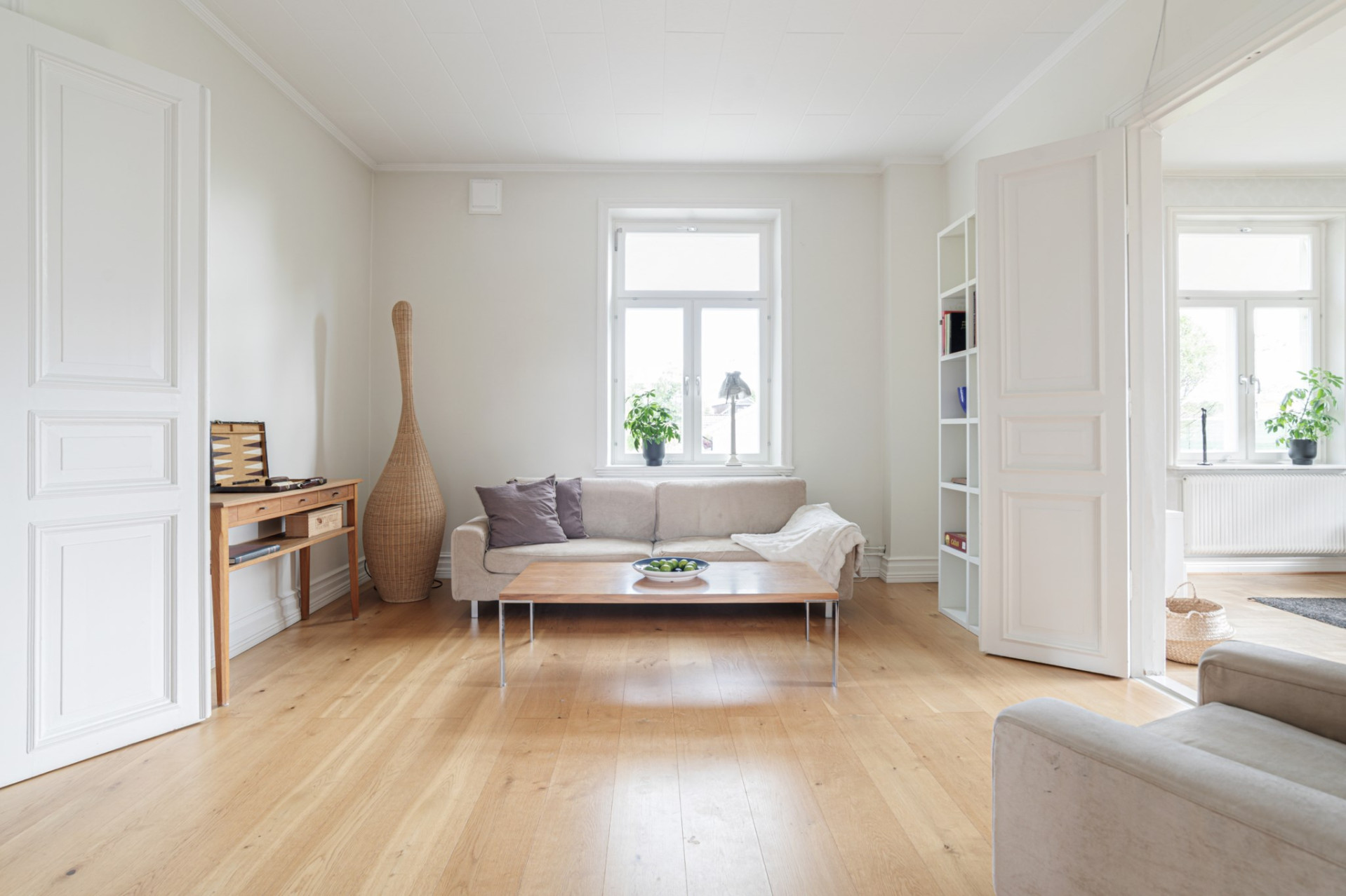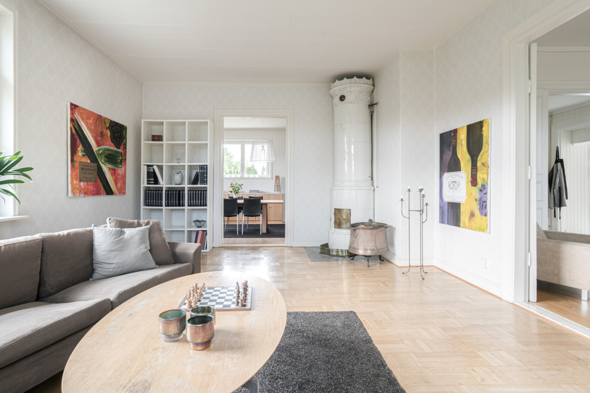 Vardagsrummet finner ni ett steg längre in genom spegeldörrarna, även här är det högt i tak och vackert ljusinsläpp från två väderstreck. Golvet består av holländsk mönsterparkett och väggarna är ljust tapetserade. Rummet ger möjlighet till en stor soffgrupp med tillhörande möbler, eller varför inte ett vackert piano att sitta vid samtidigt som elden sprakar i den ståtliga kakelugnen som fungerar!