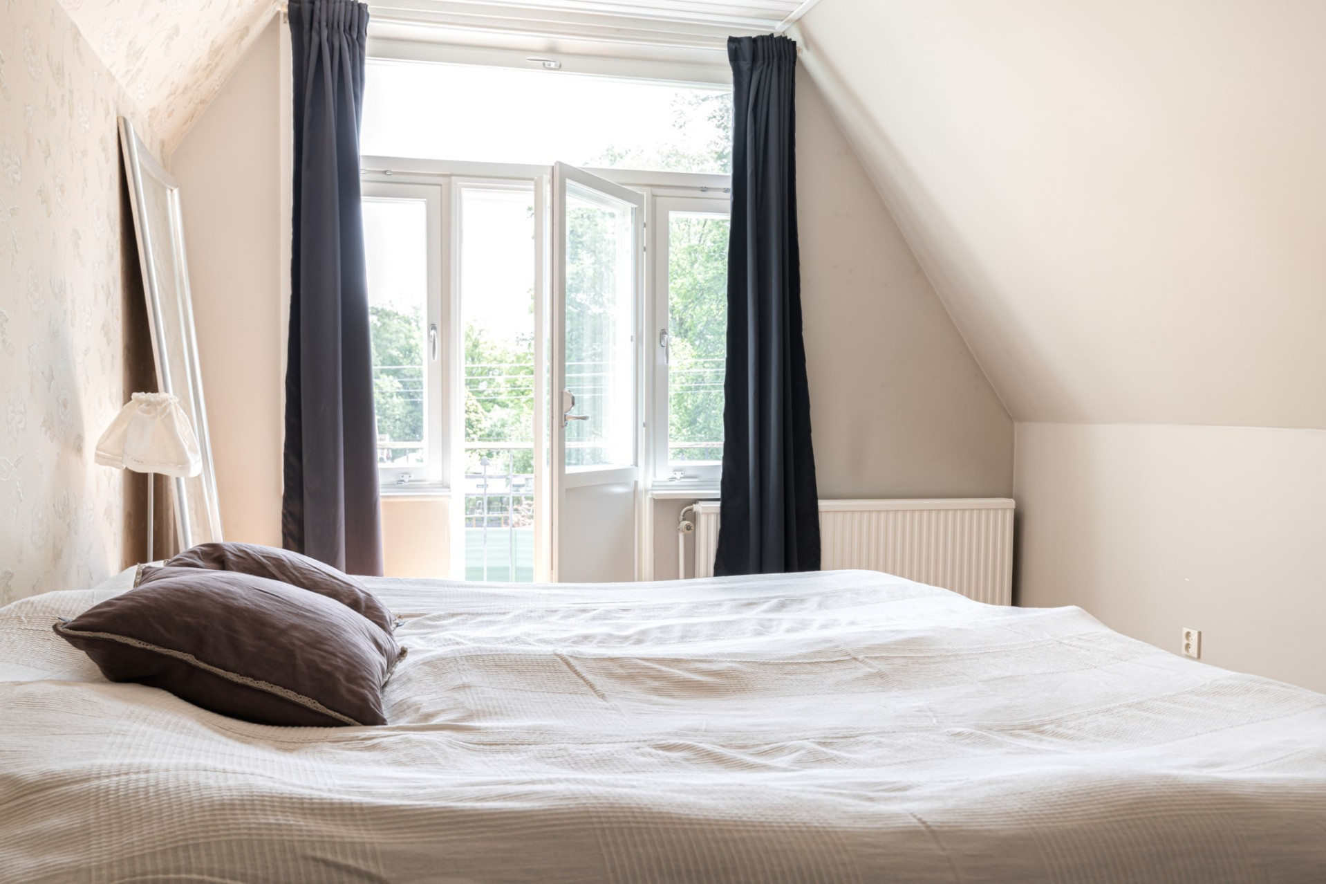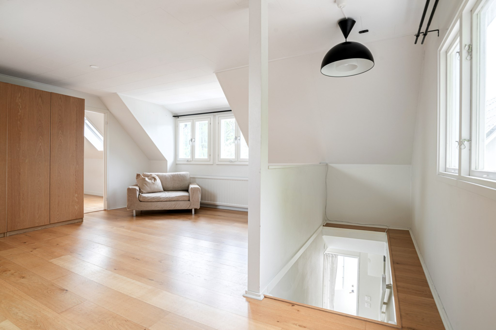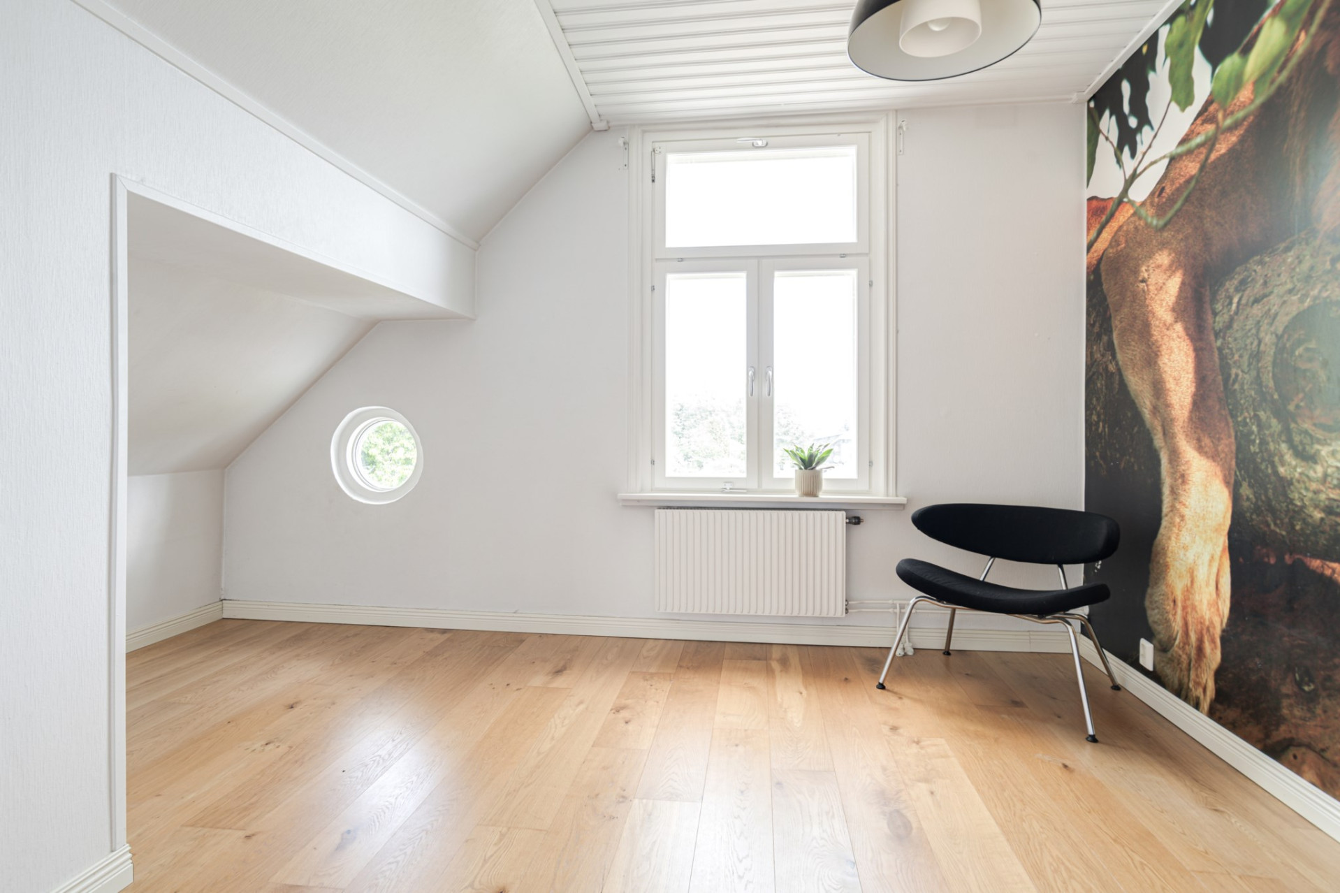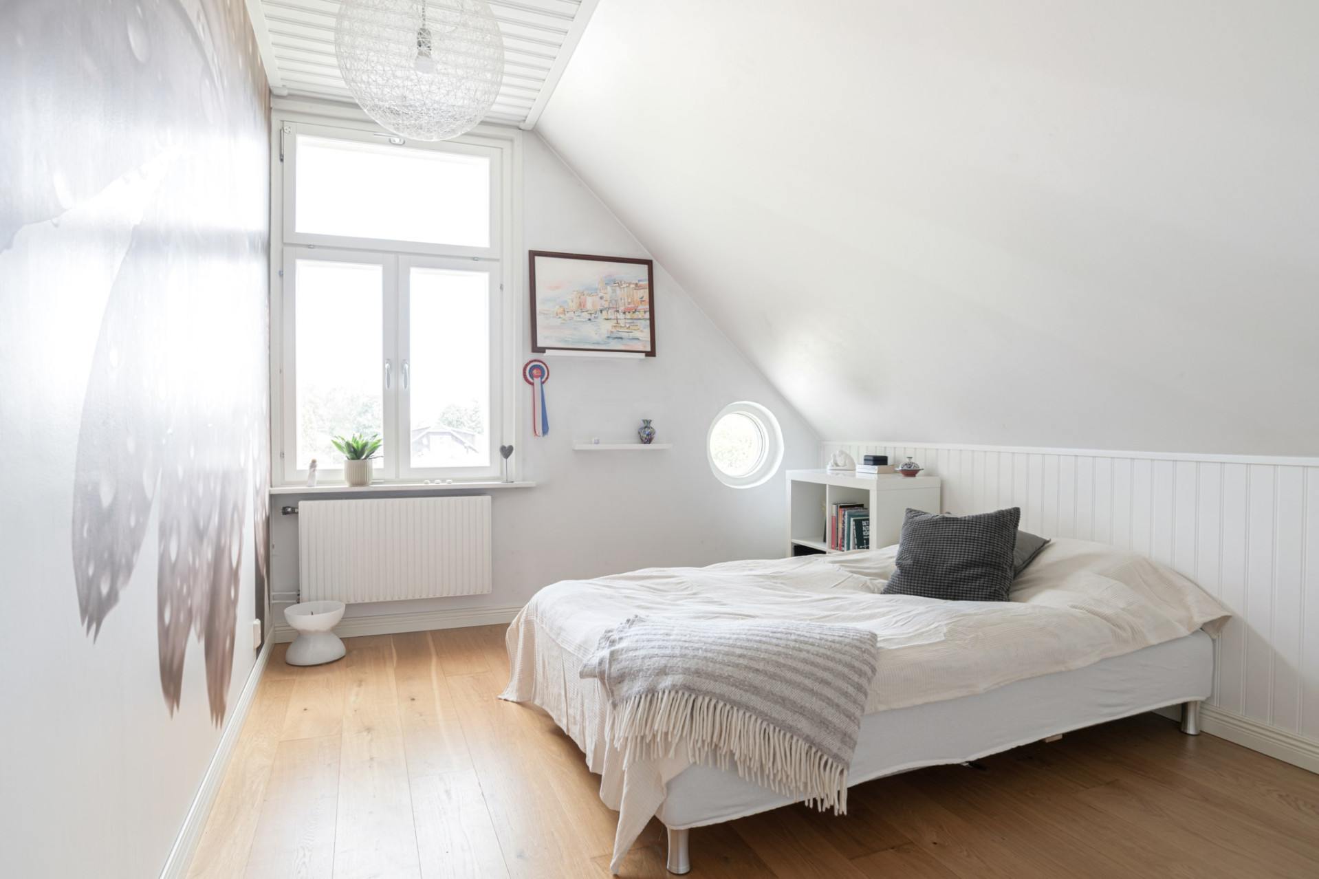 Sovrum 3 är ljust och luftigt och även det ger plats till en större säng med möbler. Även här finns ett litet runt fönster! På golvet vilar ett massivt ekgolv och väggarna delvis målade i vitt samt tapetserade med naturen i fokus.