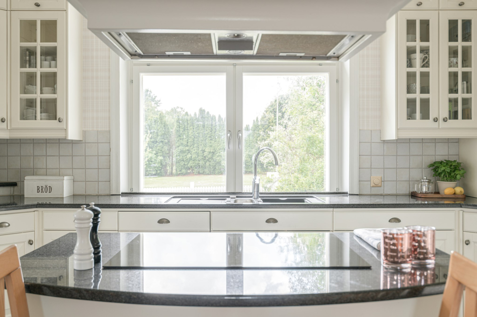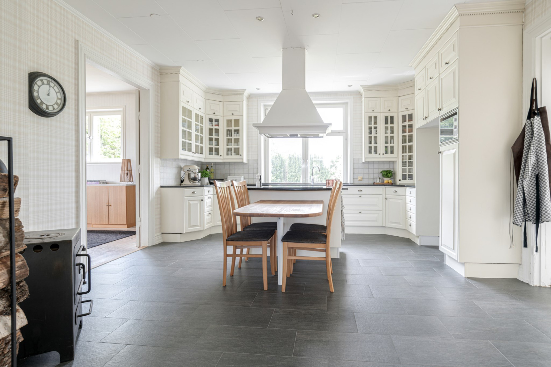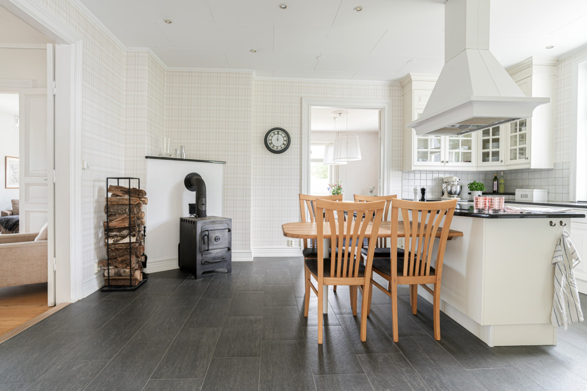 Köket är smakfullt inrett i klassiskt krämvitt med stilfull touch av luckor i vitrindörrar med spöjsade glas och lådor med ram, helt i enlighet med husets karaktär. Köket är hjärtat i huset och det känns lyxigt! Köket är från Ballingslöv, bänkskivan består av mörk granit med kakel som stänkskydd ovan. Utrustat med induktionshäll (Ikea 2023), varmluftsugn (AEG 2003), mikro (El-Giganten 2020) och diskmaskin (Miele 2012). Hel kyl och frys (Electrolux 2011) finner ni i matkällaren/matförråd en halv trappa ner. I köket finns det plats för ett bord för 4-5 personer. På golvet vilar ett mörkgrått klinker och väggarna är tapetserad. Det är helt klart ett kök för den matintresserade då det finns gott om arbetsytor och förvaring. I mitten finns en köksö med induktionshäll, trevligt och inbjudande vid middagsbjudningar. Kaminen är ett smycke i sig som står rustikt och vackert i ena hörnet av köket och har används flitigt både för värmen och mysfaktorn!