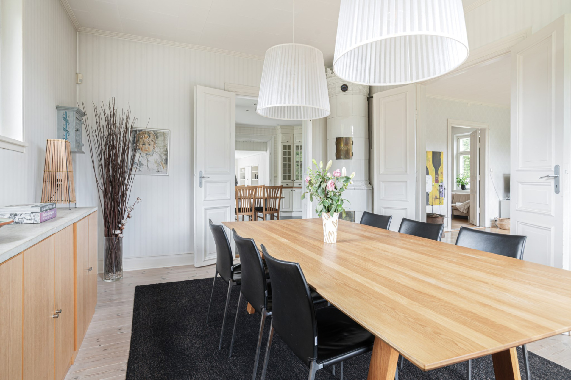 Matsalen ligger i fil, och bjuder in till små som stora middagar - perfekt att duka upp långbord! Matsalen ligger praktiskt i anslutning till köket som ni når genom det stora vackra spegeldörrarna. Den praktfulla kakelugn (ej fungerande) besmyckar detta rum på förtjusande sätt. Trägolv och väggarna är ljust tapetserade.
